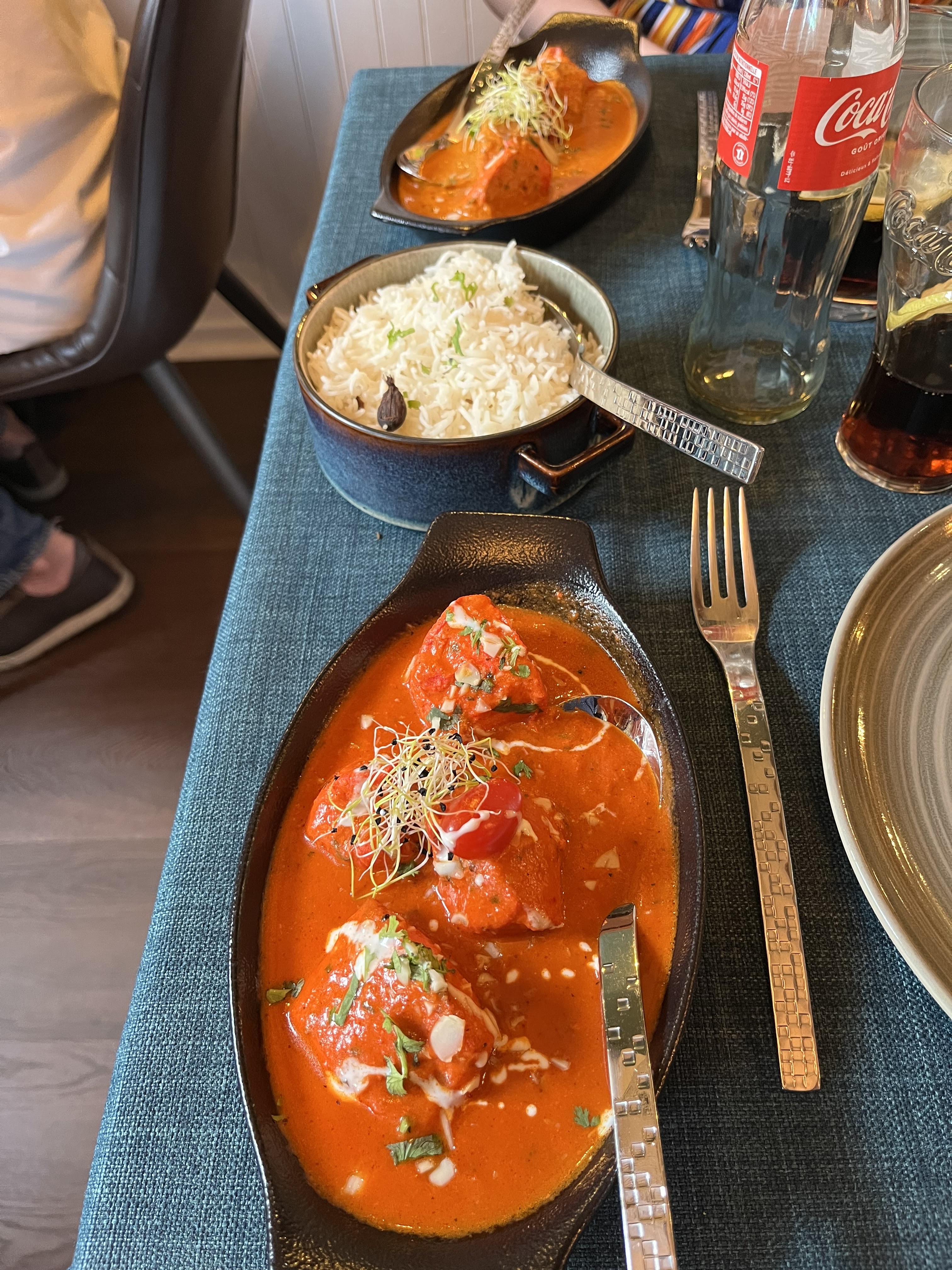 J'ai commandé deux plats à emporter : 20mn d'attente annoncées qui sont devenues 45mn. Le Butter chicken c'était .. du butter et du chicken sans aucun accompagnement (un peu de riz par exemple mais là non), Le biriany poulet n'était pas savoureux. Au global je n'en garde pas un bon souvenir mais peut-être que sur place les plats sont meilleurs. C'est dommage car c'est le seul restaurant indien dans le coin.