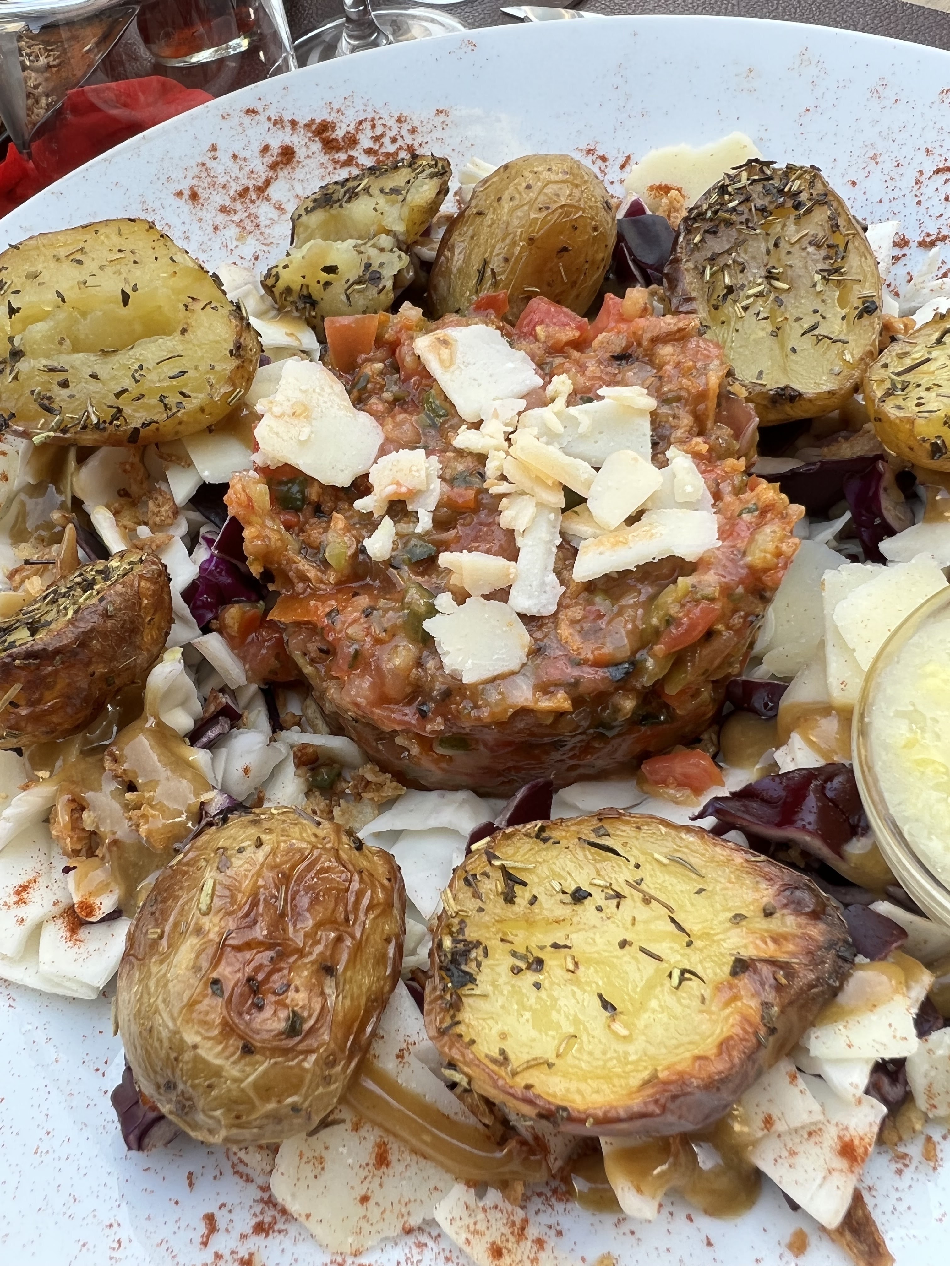 Nous avons beaucoup aimé, la carte se limitait à quelques plats, mais... pourquoi plus ? Si ceux-ci sont riches ?! Pour ma part, étant végétarienne, j'ai beaucoup apprécié mon choix entre le Tartare de Tomates en entrée et le Tartare Végétarien en plat principal, tous deux crus et délicieux. Cela n'a pas fonctionné pour la table à côté de nous et la nôtre de payer par carte.