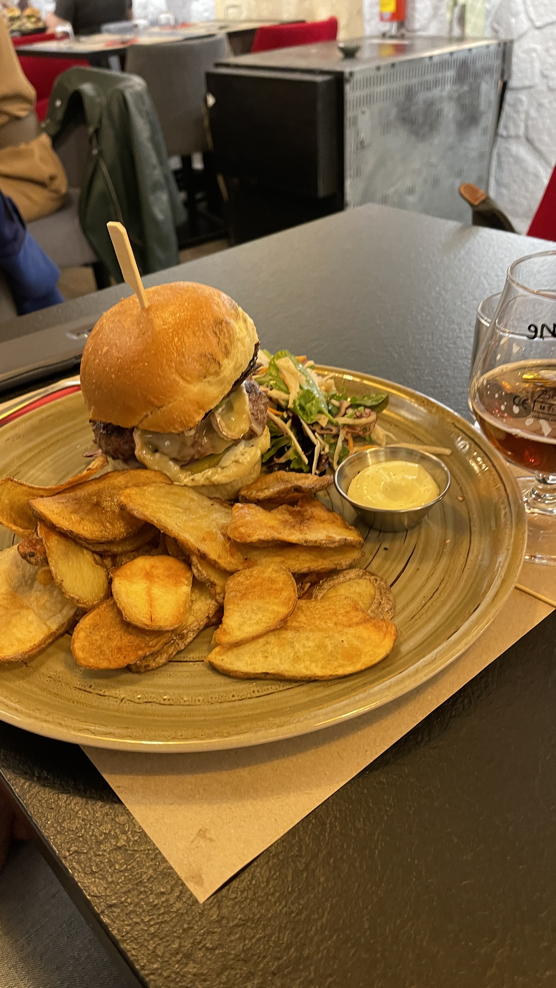 Hamburgers de qualité et originaux mais à mon goût un peu trop riche et lourd à digérer 😁 Ambiance cosy pas trop bruyant. Lieu magnifique et mobilie correct. Service correct mais toutefois un peu trop rapide ...oui je sais qd c'est trop lent on se plaint aussi...🙄 A refaire.... Ah oui le café ☕️ gourmand est excellent.