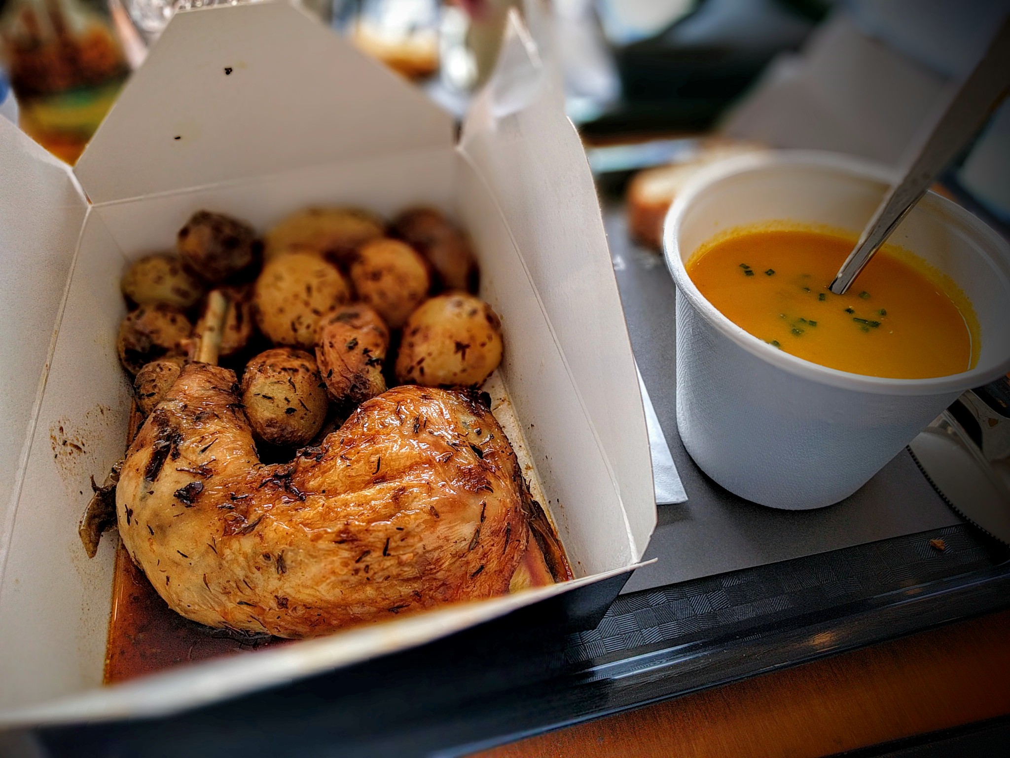 Le Hamburger au poulet est bon (des produits frais, poulet avec du gout,...) pommes de terre tendre et gouteuse accompagnées d'une sauce maison. J'ai pris en dessert la brioche façon pain perdu au caramel au beurre salé, très bon. En conclusion, tout à fait honnête, bon rapport Q/P avec un accueil sympathique et naturel. Côté déchet c'est dommage que tout soit jetable.
