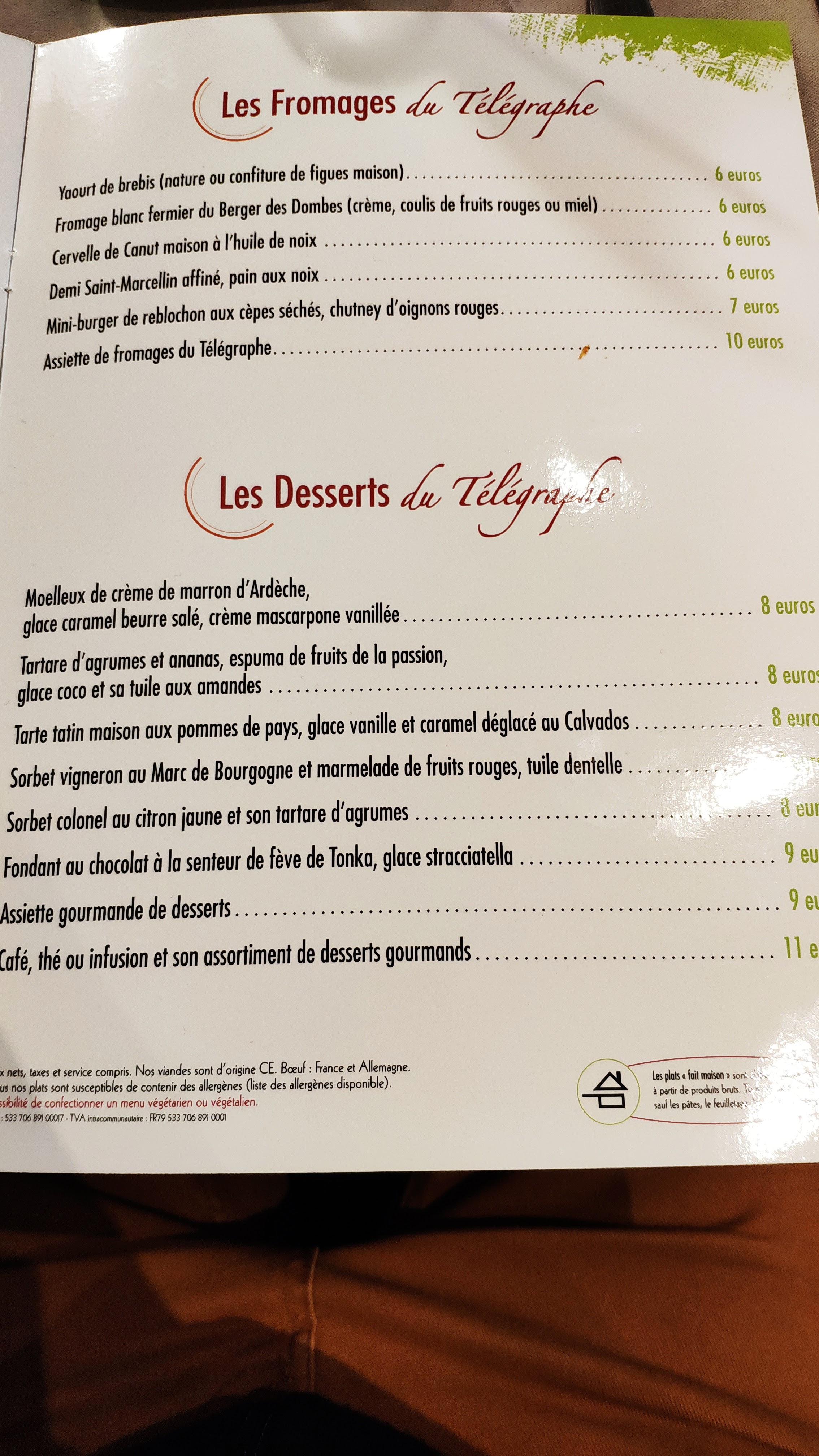 Dîner entre amis au télégraphe. Une très belle découverte et une belle terrasse. Je me suis régalé avec les grenouilles et le gaspacho maison. Une cervelle de canut en dessert. Le service est top. Les patrons sont aux petits soins pour nous avec le sourire en cadeau. Je reviendrai tester la salle intérieure des que possible.