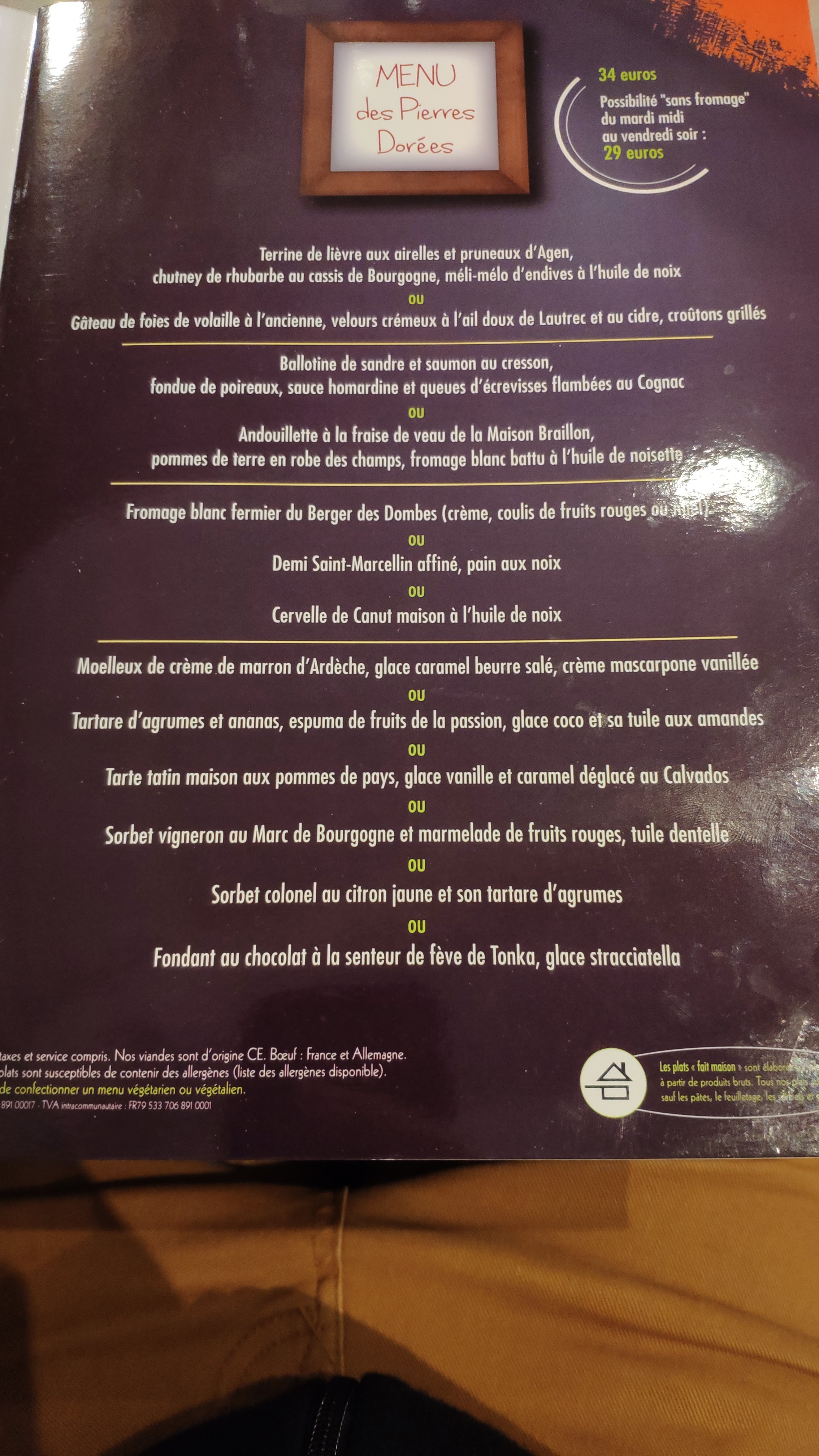 Restaurant fabuleux. Accueil super, menus (36 à 52€ soir & we, à partir environ 20€ le midi) et plats à la carte pour tous les goûts. Cadre magnifique, typique pierres dorées. Idéal repas de famille. Belle capacités des salles, et terrasse très agréable. Je recommande 👍.