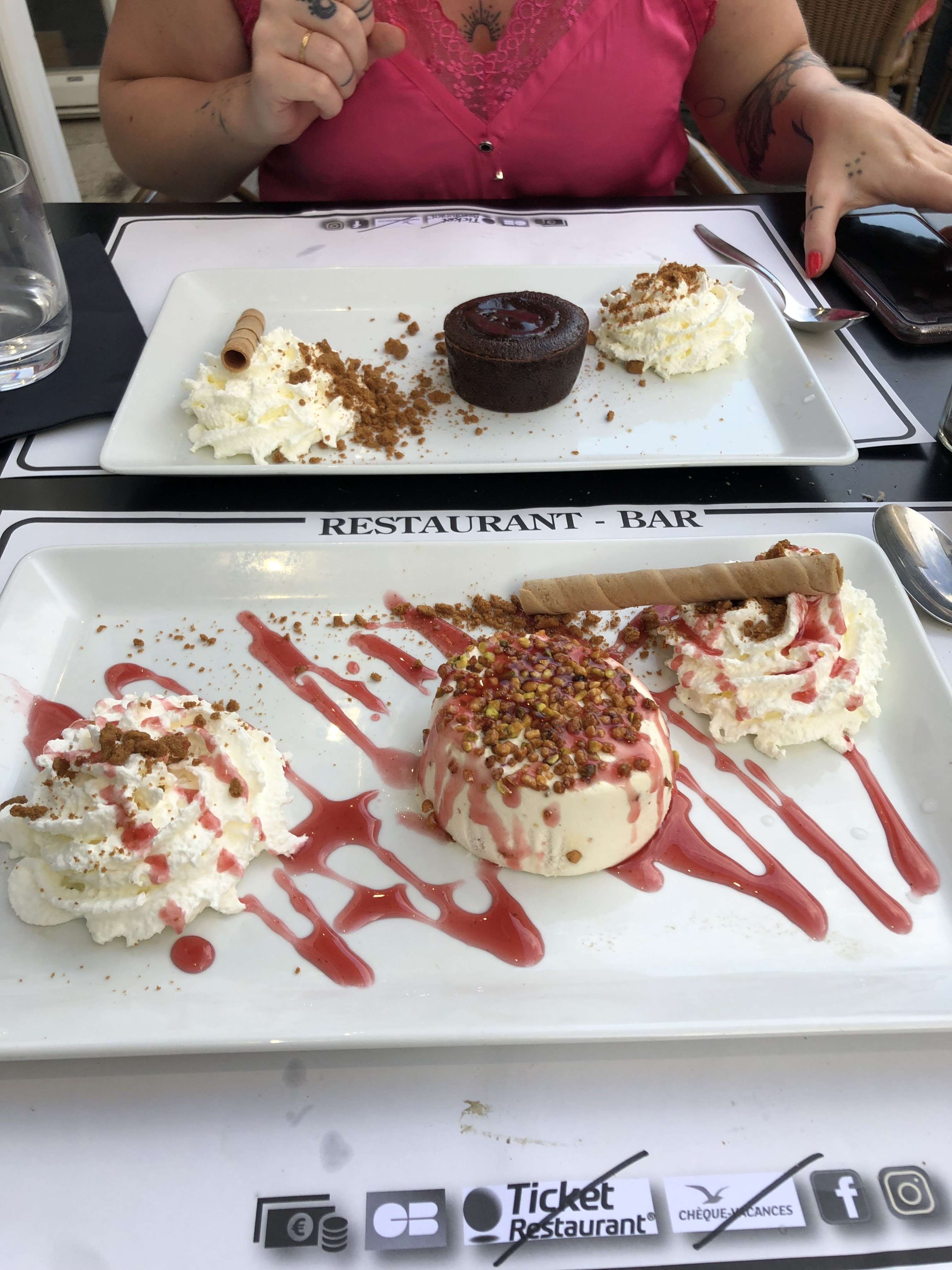 SUPER RESTO je recommande Plat du jour moules poulette délicieuses et sans coquille sauf pour la déco et copieux Dessert du jour Tiramusu à la pêche le tout 19.90€ Les propriétaires ont été très sympathiques Il pleuvait beaucoup mais nous étions à l abri Nous avons eu droit au prêt d un plaid pour la petite fraîcheur
