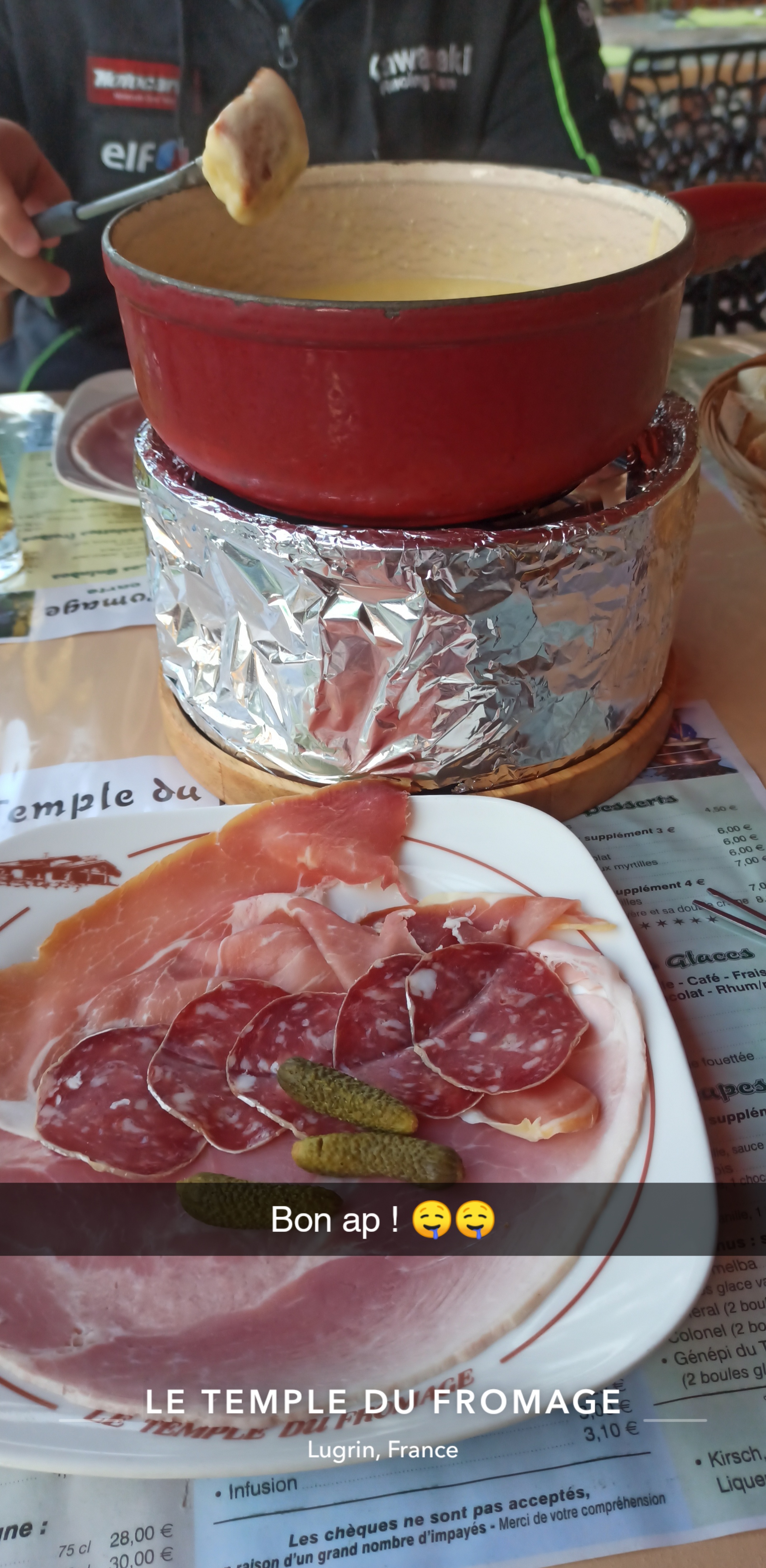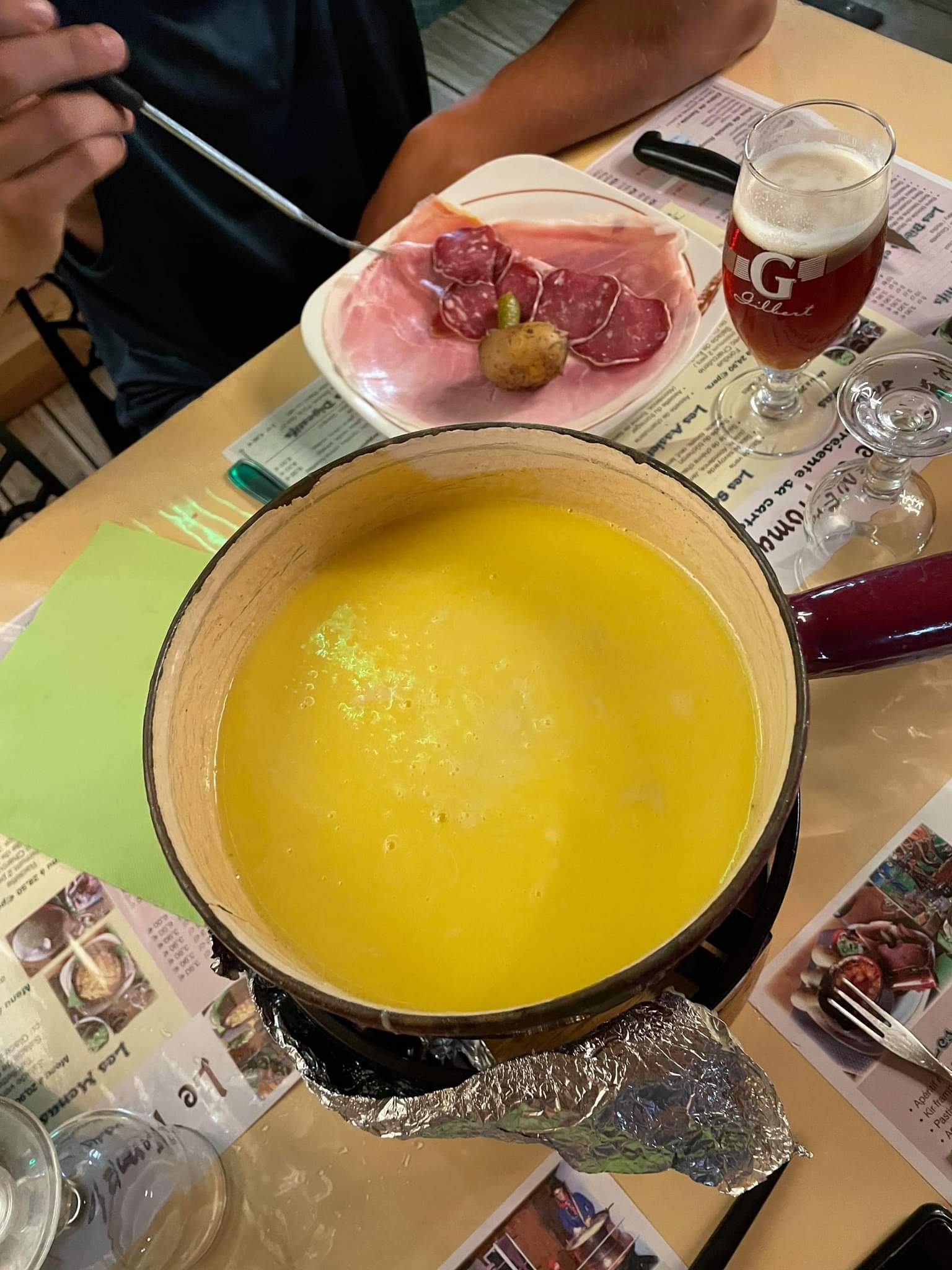 Fondue testée à 4 personnes Charcuterie effectivement pas à la hauteur... Les pommes de terres sont servies non épluchées non nettoyées et avec de la terre... Le fromage fut bon malgré tout Bien dommage car le service était bien sympa