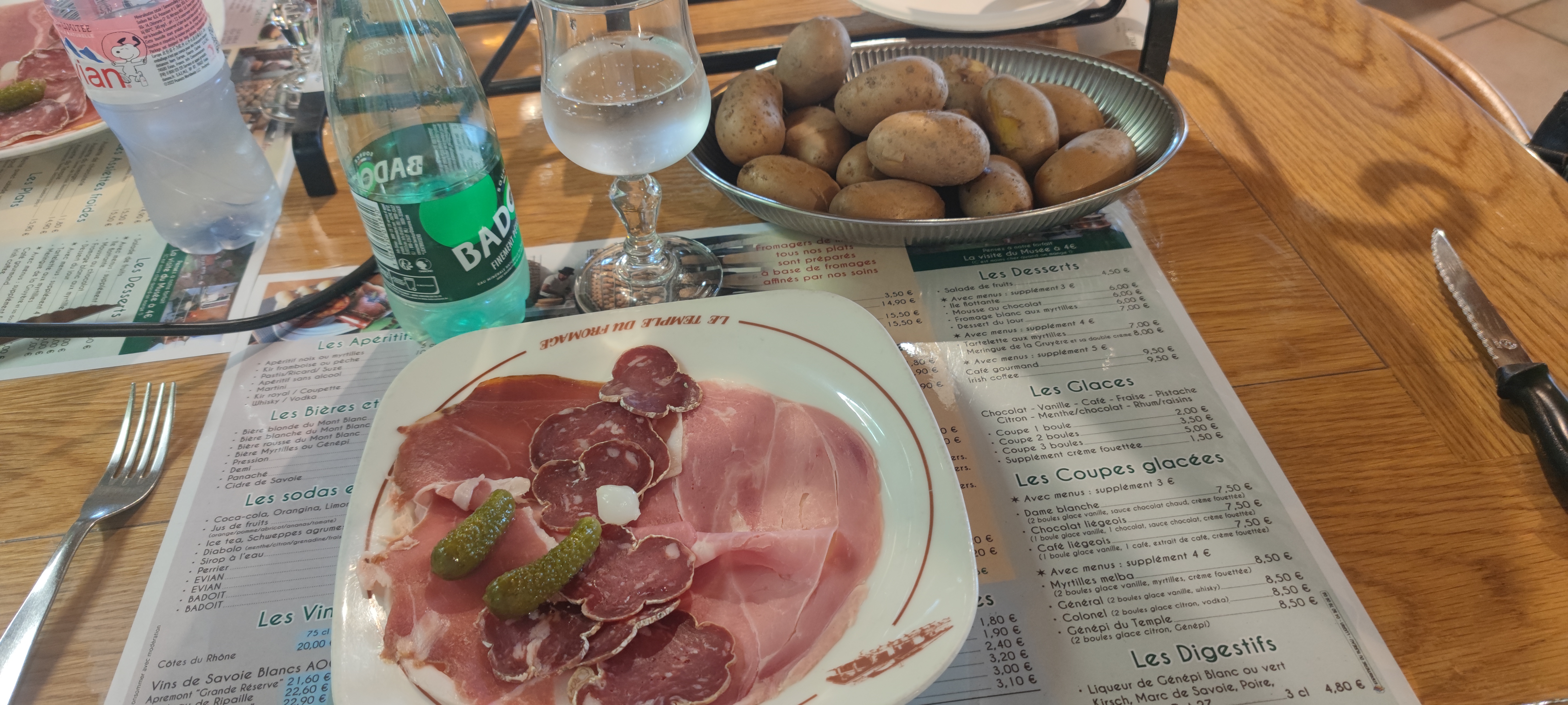 Tres bon fromage au restaurant serveuse tres sympathique. Mais assiette de charcuterie vraiment pas a la hauteur du fromage : 1 tranche de jambon blanc(dans l'epaule), 1tranche de jambon fumé et 4 tranches de saucisson. Toute les tranches aussi fines que du papier a cigarette. Et une salade fruit industrielle mais acceptable. Le tout pour un menue a 25euros. Tres cher