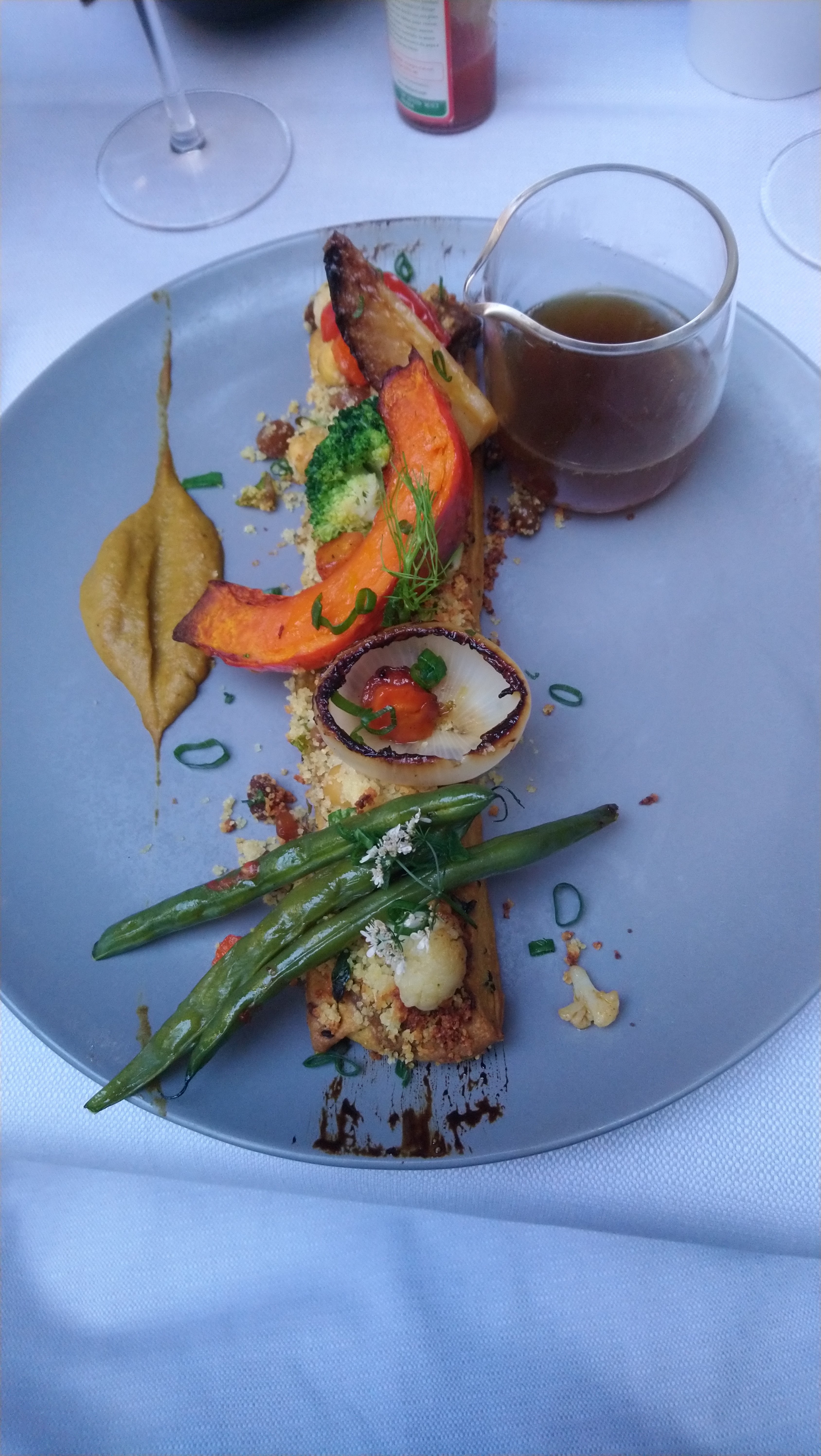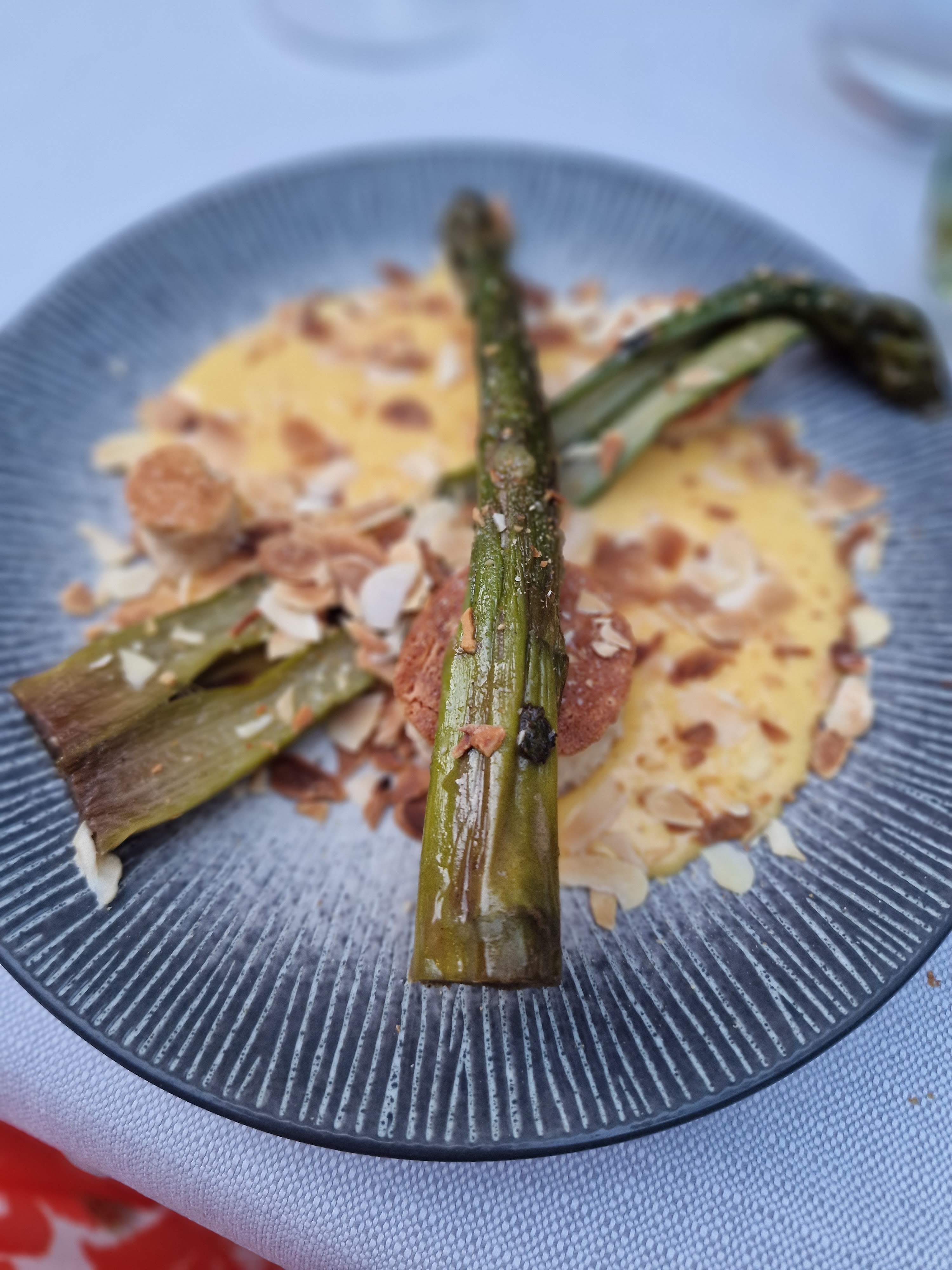 Des ingrédients avec la qualité, des produits frais. Malheureusement, on a pas beaucoup aimé la saveur. Donc on était un peu déçus. Le dessert avec des asperges était surprenant et pas terrible. L’ambiance et le service étaient corrects.