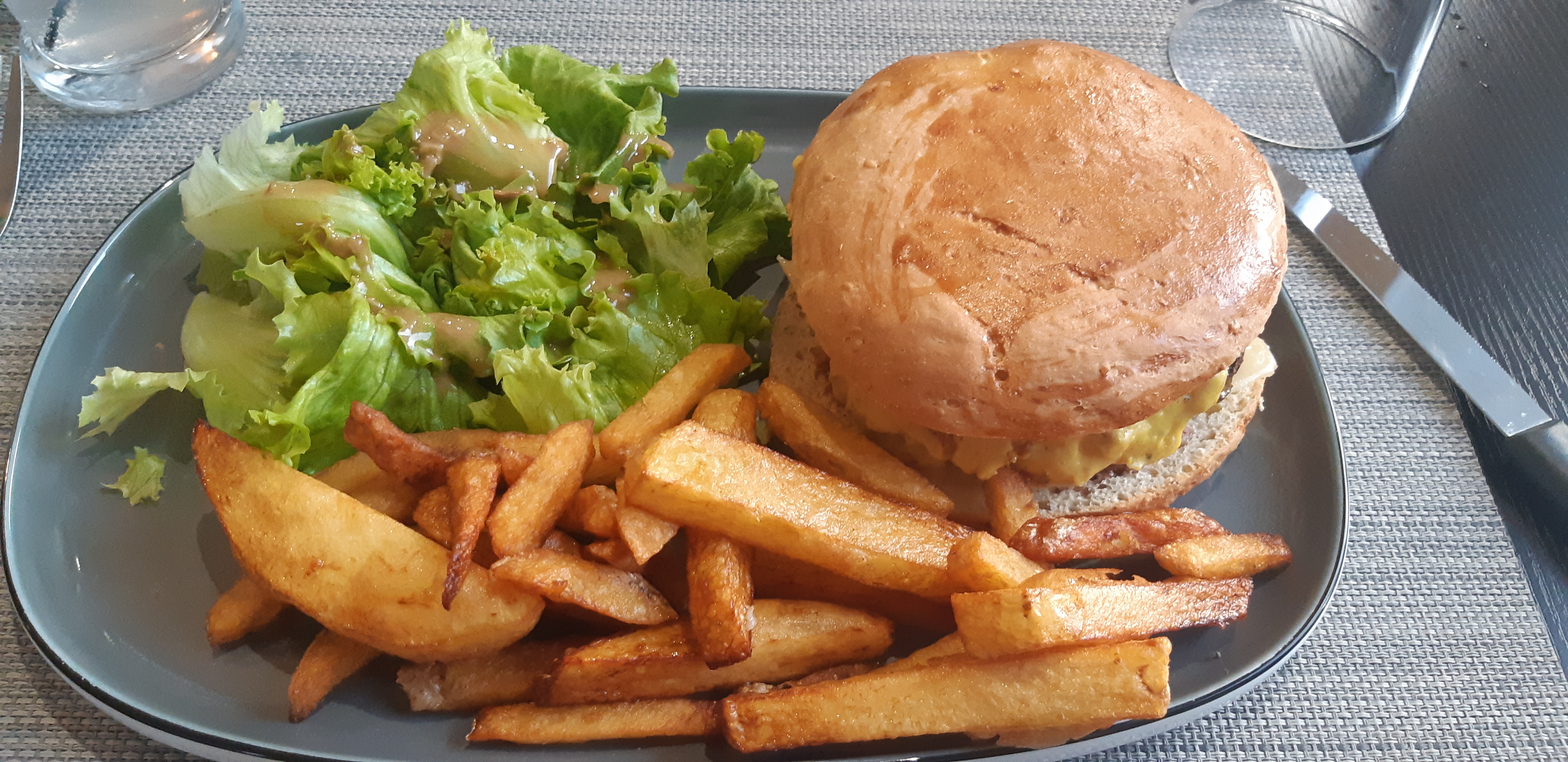 Bof...Bof.. Bof...déçues...!! Pas très chaud,frites trop cuites..et trois feuilles de salade en accompagnement..minis apéros dans les verres...Cher pour ce que c'est...! Présentation bof bof aussi...Pas vraiment de choix..! N'y retournerons pas...!