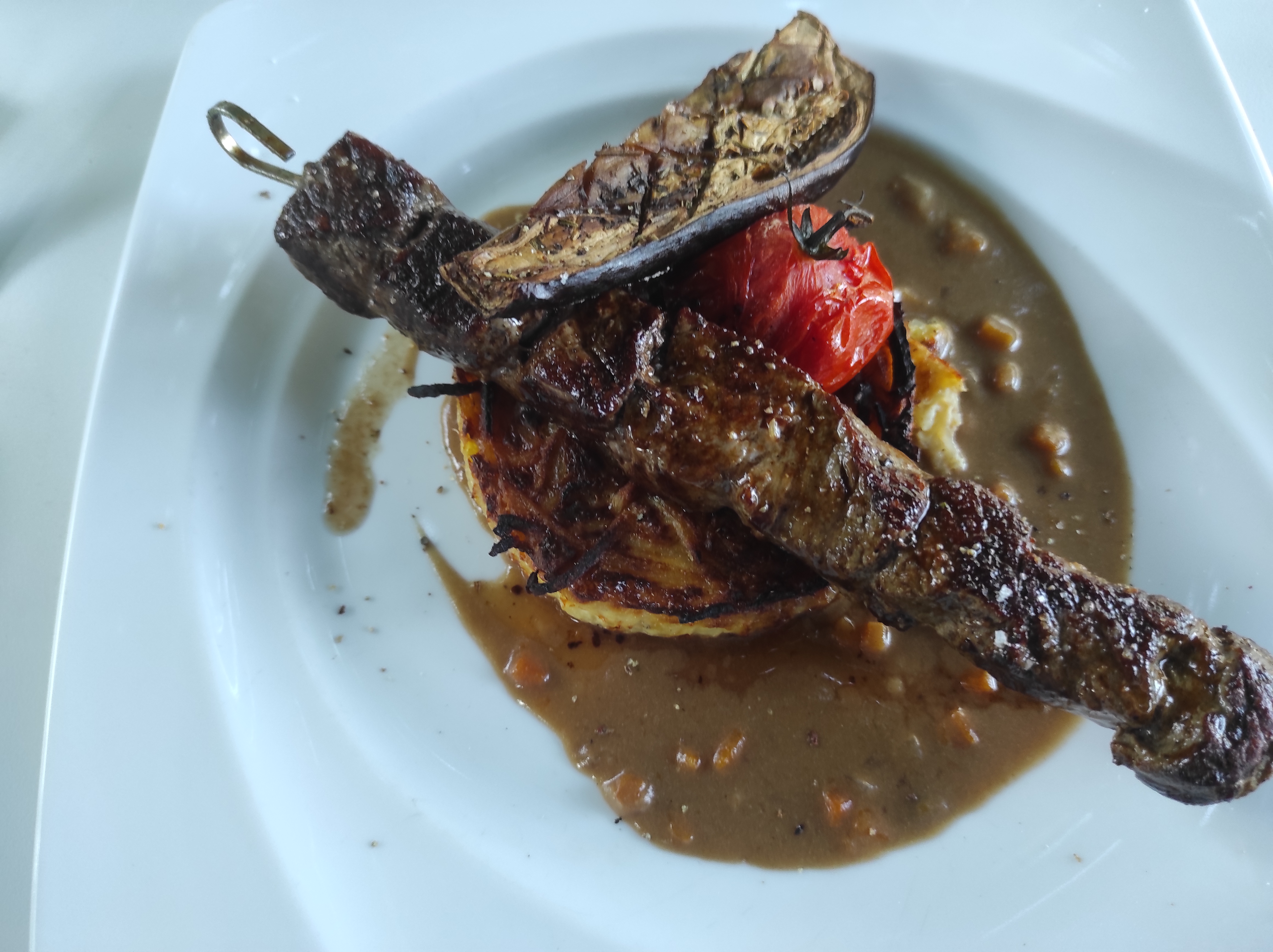 Décevant : table en pente, les cheveux dans les rosiers, vin d'un peu d'âge pas fait goûter... Macaronis gratinés en accompagnement et pas l'occasion d'en discuter puisque pas questionné sur le succès des mets servis.
