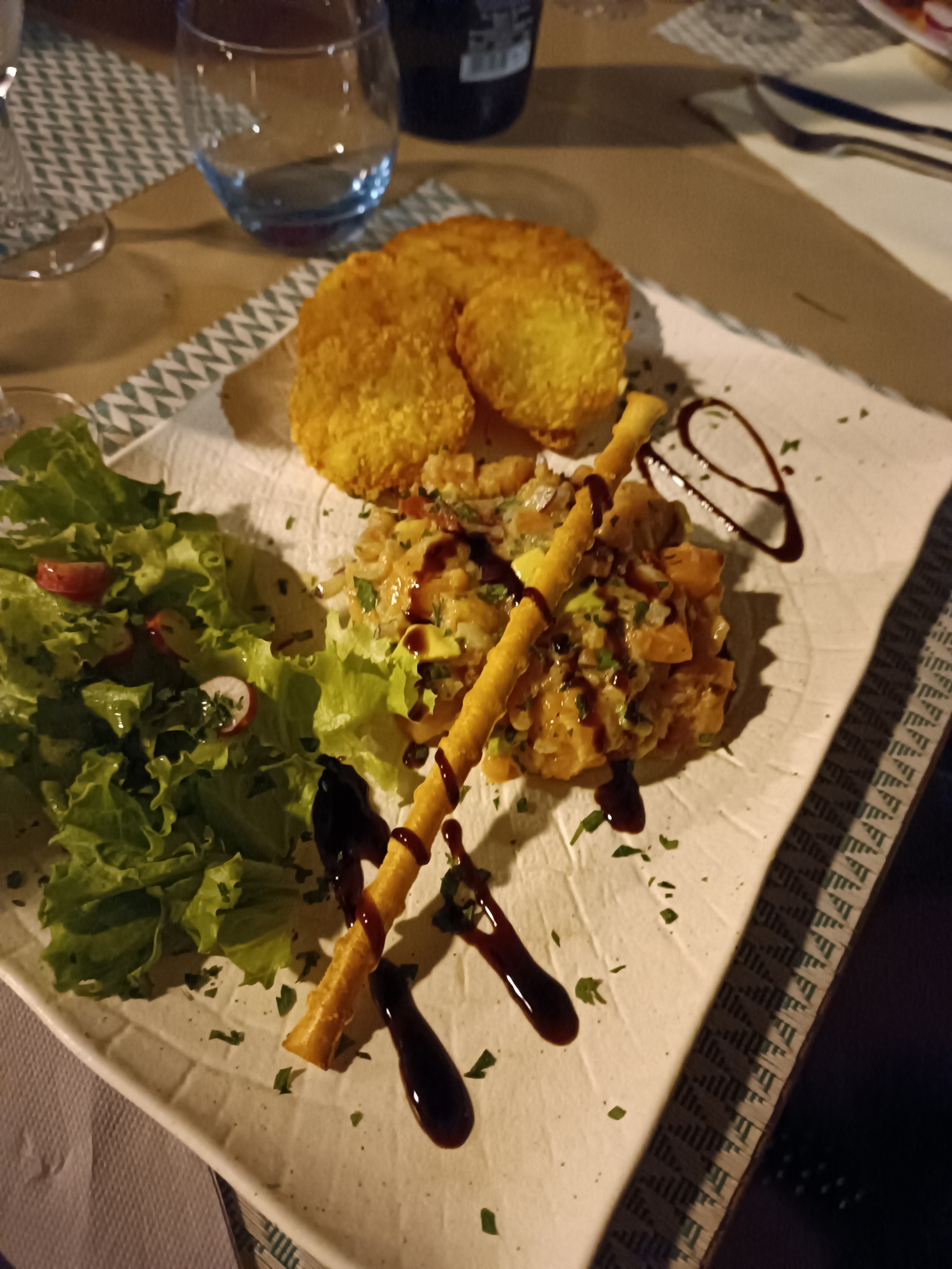 Un cocon douillet où il fleure bon se réchauffer les papilles. Notre hôtesse nous a accueillis avec une assiette apéritive bien sympathique, le temps de s'occuper d'autres convives. Ici pas de pizzas, mais un choix de viandes grillées, de salades, et tartares de saumon avec des légumes frais et colorés. Mon tartare de saumon était servi avec de l'avocat, des petits morceaux de tomates, des rondelles de radis, une salade verte et ses pommes paillasson. Tout était très bon. Pour le dessert un fondant au chocolat accompagné de crème anglaise et son nuage de Chantilly. On reviendra aussi pour la gentillesse, le sourire et l'hospitalité. Rendez vous est pris.