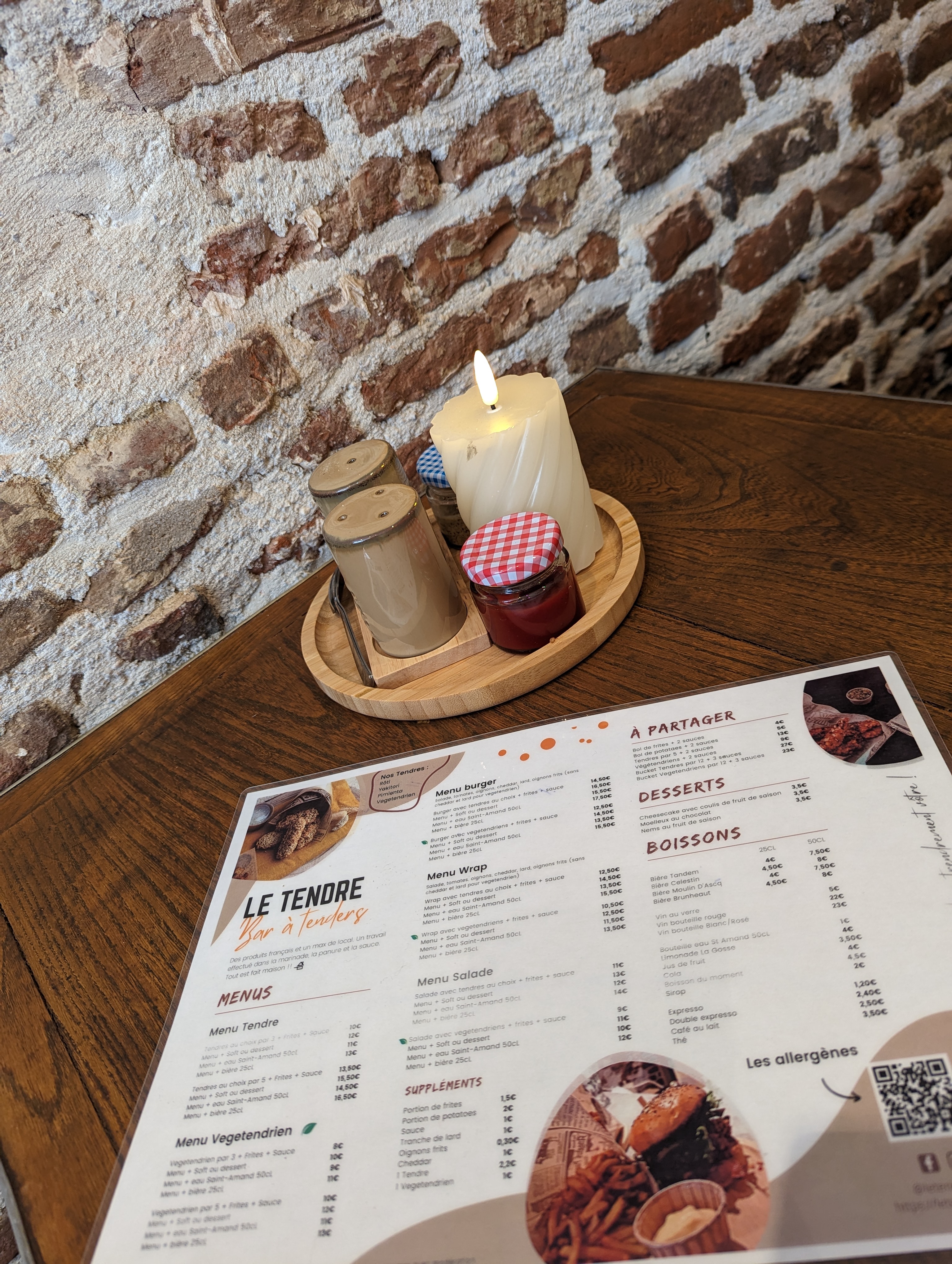 Je suis passé il y a quelques semaines devant Le tendre en me disant que c'était une adresse à tester étant un grand amateur de poulet. Je n'ai pas été déçu. Beaucoup de points positifs sont à relever : - Nous avions une réservation. Au lieu d'un simple mot réservé sur notre table. Nous avons eu le droit a un mot fait main, sur une décoration en forme de poulet (avec un petit pull tricoté). - Le choix des bières est qualitatif. - Selon moi le choix de tendres peut convenir au plus grand nombre : - Le plus piquant est bien relevé sans influencer le goût du poulet. - Le rôti rappelle bien le poulet rôti, mais tout en gardant un mood de poulet pané (cela peut faire penser à une version française du karaage). - Le Welsh offre une bonne découverte du monde nordiste. - Le végétarien est très bon (je ne mange en général pas de légumes, ce dernier en plus d'être passé était parfaitement épicé). - Les frites et les potatoes étaient aussi très bonnes et accompagnaient parfaitement le plat (les frites étaient à mon sens cuites à la perfection et les potatoes parfaitement assaisonnées). Je me demandais comment après plus de 130 commentaires Le tendre avait pu garder une moyenne de 5 étoiles et après avoir goûté au cadre et à la nourriture servie dans ce restaurant c'est tout à fait compréhensible. Après le wrap je reviendrai pour goûter le burger ;).