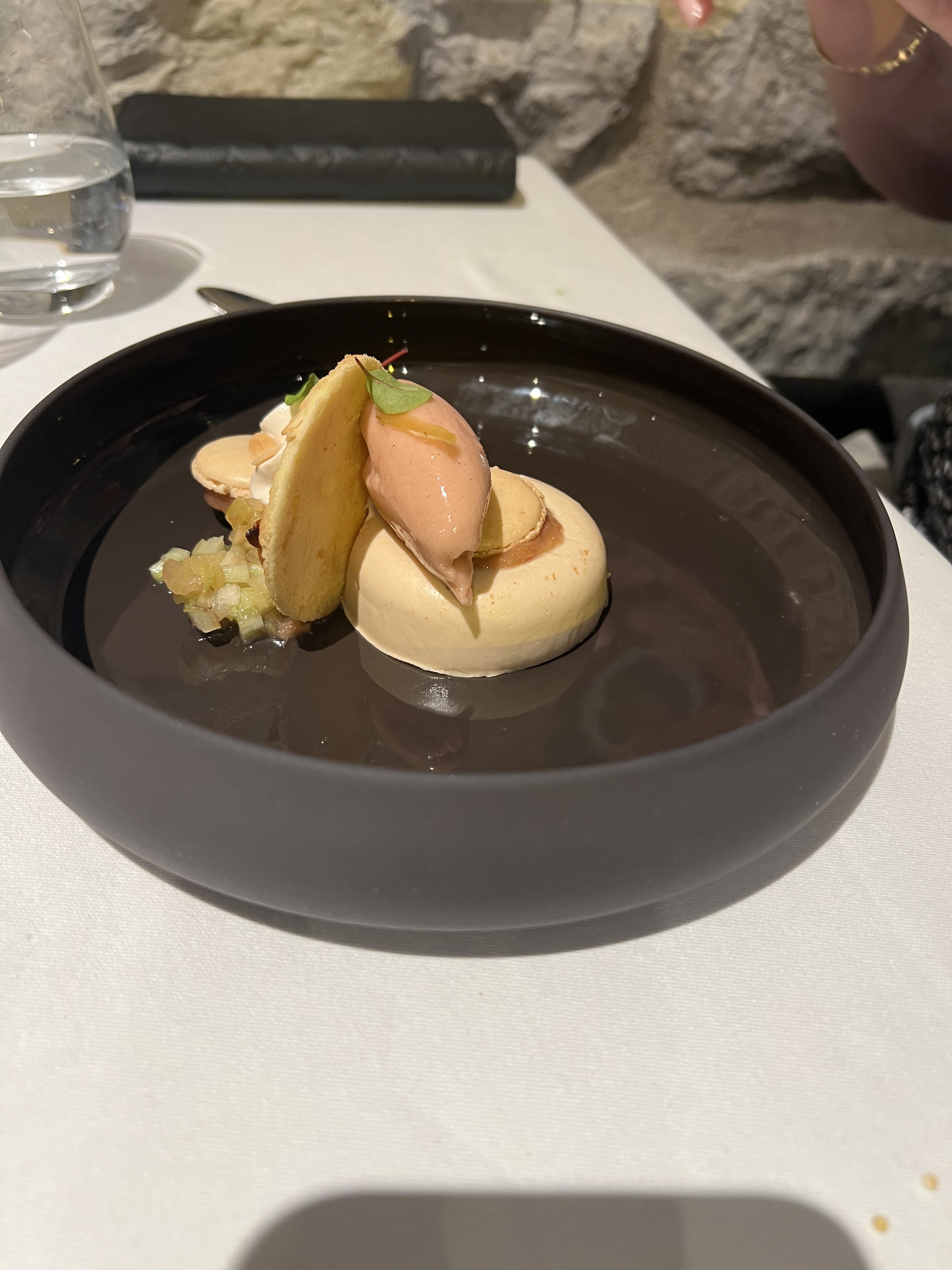 Un accueil tout en gentillesse , le personnel montre qu'il est content de vous recevoir , discret mais très pro . Cuisine parfaite , cuisson des viandes absolument maîtrisée , sublime risotto de châtaignes , le filet de bœuf Rossini d'une grande tendresse . Les desserts sont bien pensés , et equilibrent les propositions de la carte , la présentation en assiette poétique. Pour que l'alchimie se fasse , un Côte Rôtie 2020 à été choisi grâce aux conseils de notre serveur 👍 Un bon moment donc , une note bof pour l'ambiance crée par la clientèle légèrement coincée , une visite du patron de l'établissement aurait pu la remonter mais j'admets le coup de feu . Une adresse vraiment recommandable , bonne continuation. Les montagnards