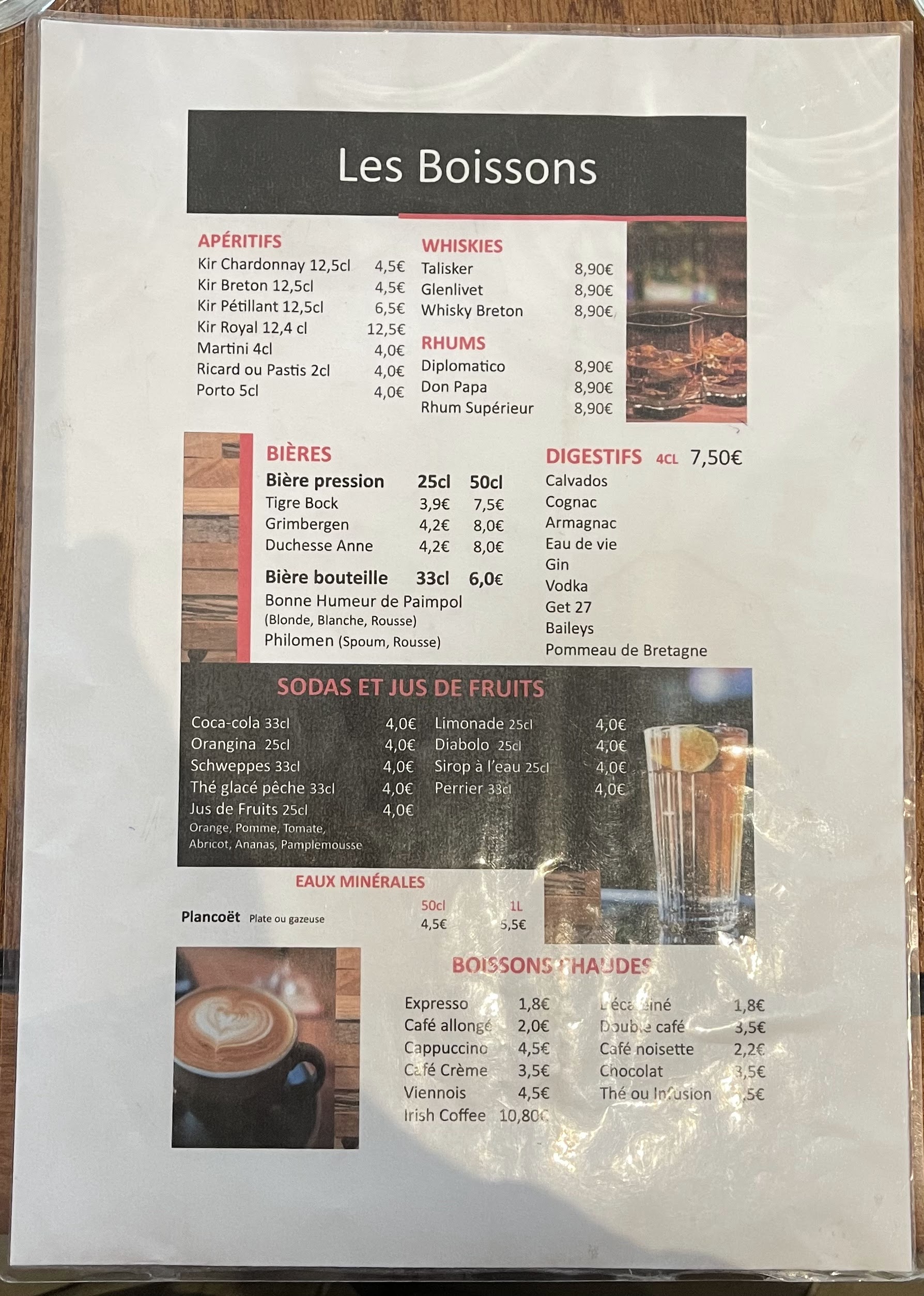 Un restaurant qui affiche crêpes en devanture mais qui n'en fait pas en hiver... chercher l'erreur ! Dans une région où la crêpe est reine 🙄 Un chocolat chaud qui est plus une eau aromatisée au chocolat. Dommage car l'intérieur est sympa et les serveurs aussi 😒