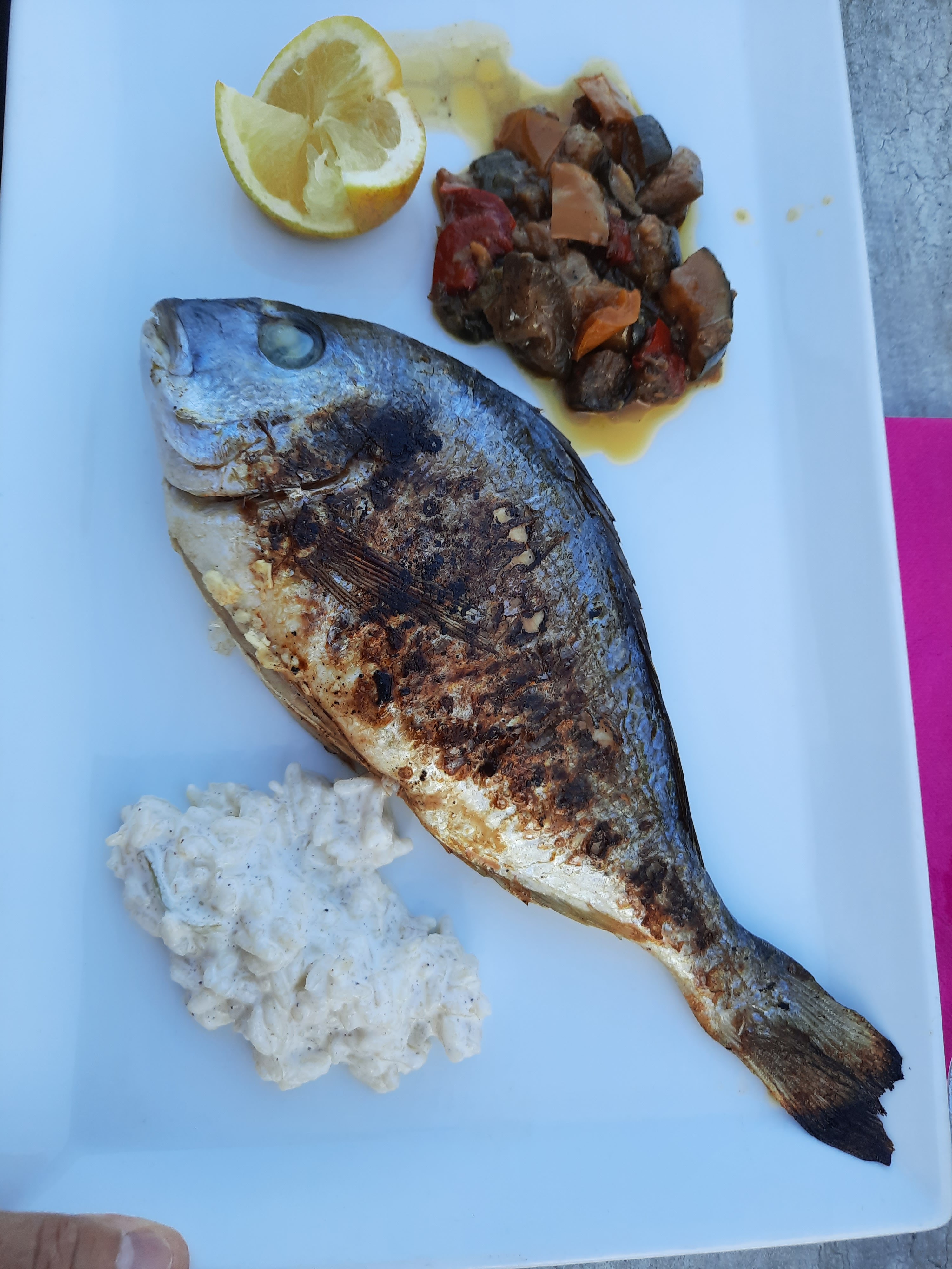 Malgré la présence du patron (je pense que c’était le patron..) très sympathique, commerçant et à l’écoute, j’ai été déçue par la nourriture. J’avais pris des calamars mais je pensais qu’ils allaient être coupés et sautés ..( cf photo). Mon mari lui s’est régalé par contre. Sinon le cadre est agréable avec vu sur plage.
