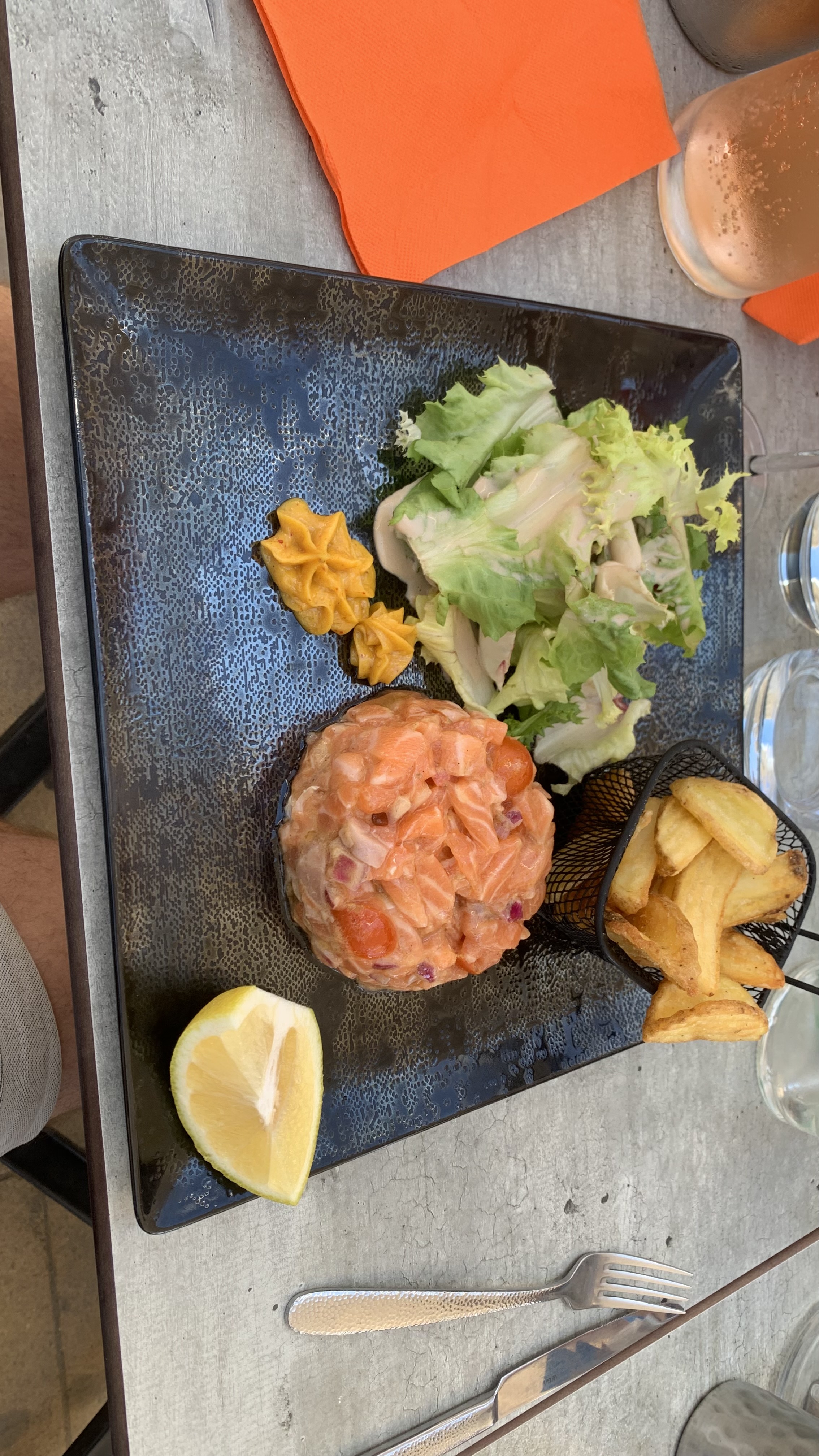 Cadre sympa, personnel très agréable et de bons conseils, mais une rapidité de service trop excessive : a peine nous avons reçu notre apéro que le plat est arrivé de suite ! Comme un sentiment de devoir se dépêcher. Steak de thon délicieux mais pour ma part déçue par les moules trop de coquilles vides et froides.