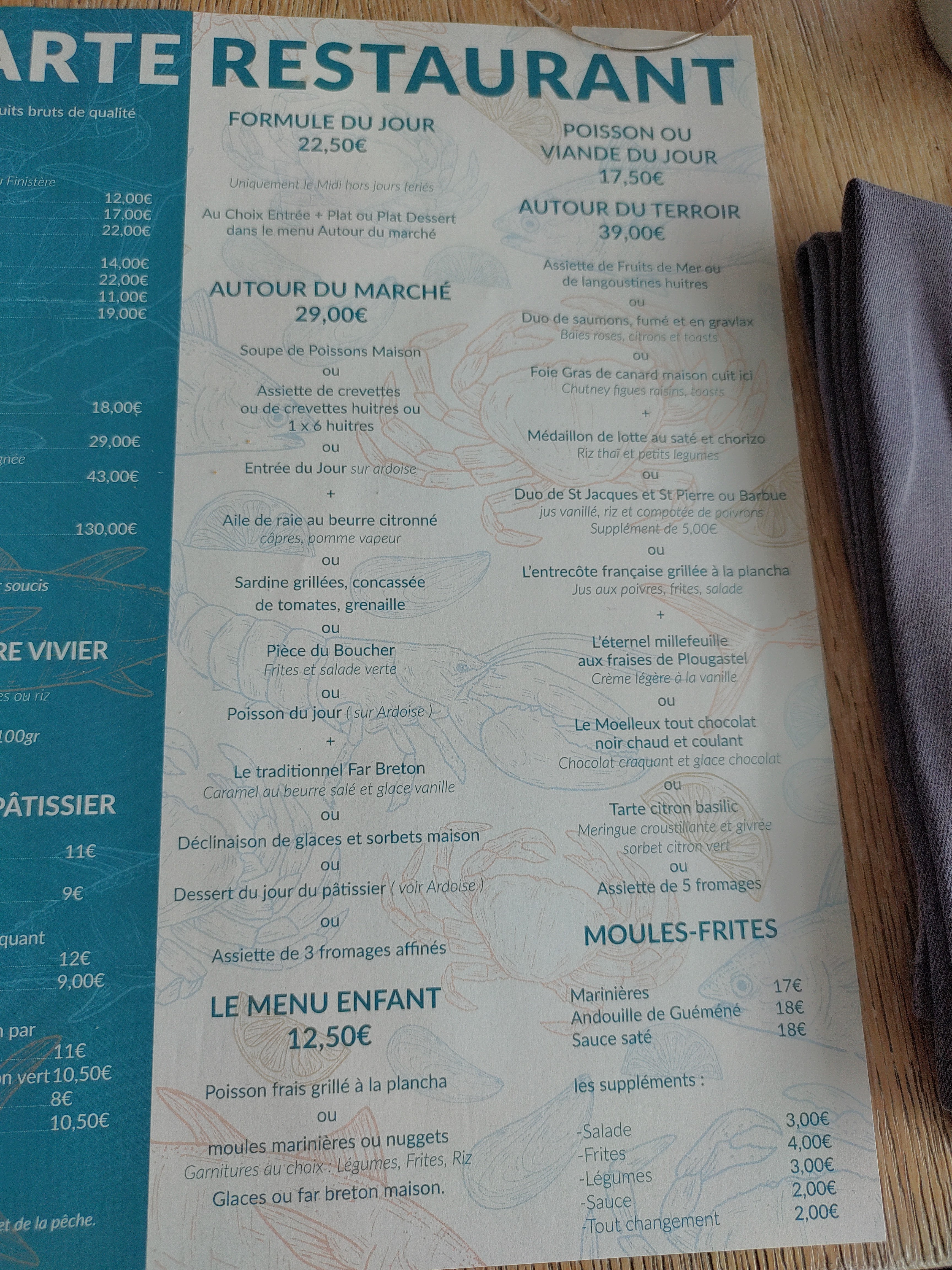 Bonjour, avons pris deux menus à 29.90 un large choix de produits plus succulent les un que les autres en entrée j'avais pris un duos de poissons fumé, mon épouse une assiette de moules,suivit d'un plat de filet de merlu sur un lit de lentilles , un onglet mature pomme frites , pour finir sur une assiette de fromage et un far avec une boule de glace caramel Bravo à la cuisine N'avons pas laisser une miette Un pain maison excellent Un personnel serviable, souriant, agréable Bon continuation, non reviendrons