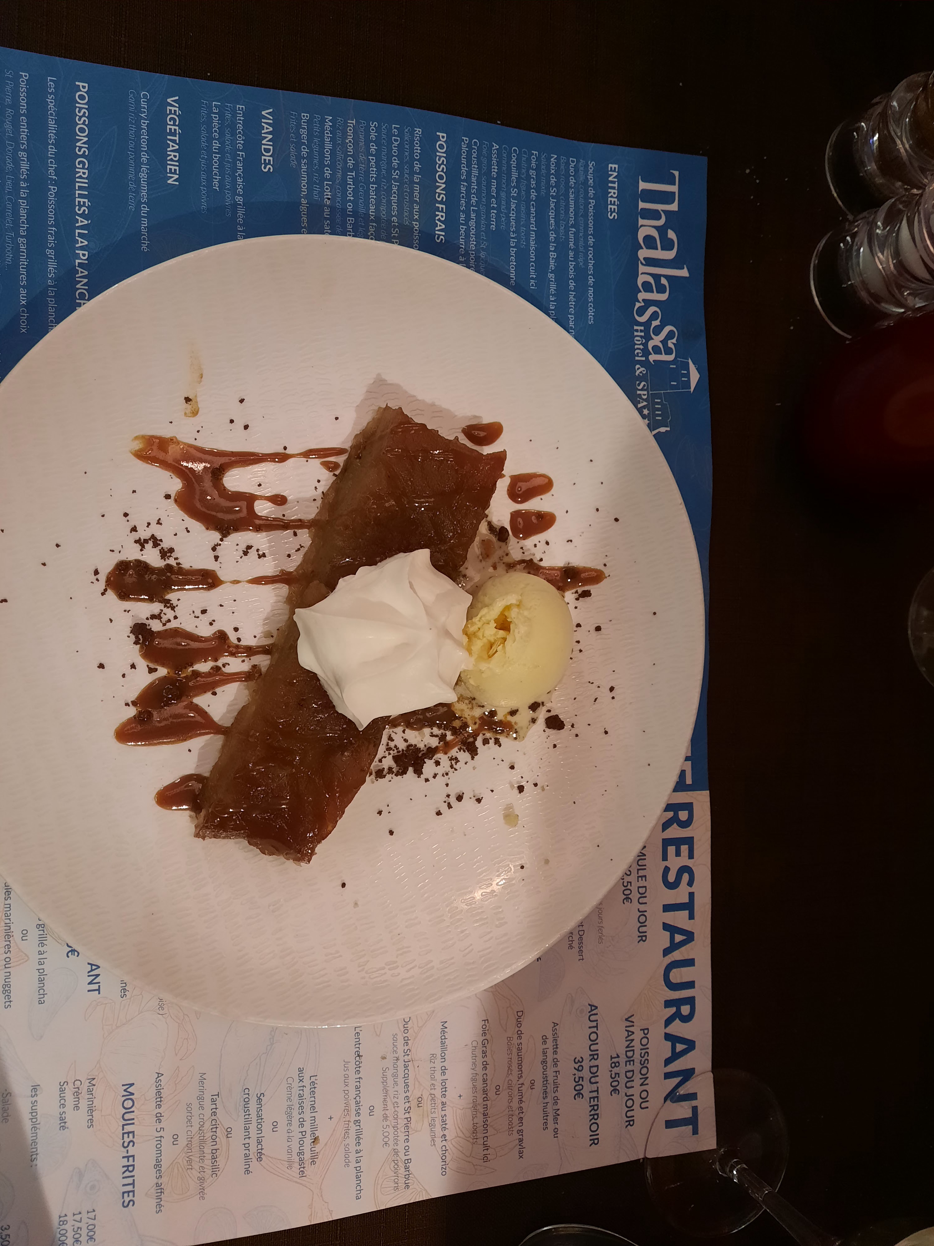 Repas au thalassa pris par rapport aux avis TripAdvisor. Plat de crevette en entrée à la fraîcheur douteuse, avec en prime du polystyrène dans l l'assiette. Obliger de réclamer un geste commercial au moment de payer l addition chose qui avait l air d embarasser fortement le serveur, pas très commerçant tout ça, car le serveur a été prevenu de ce désagrément .... nous avons eu droit a une gorgée infime de digestif . soupe de poissons bonne mais très pimentée . Pour le reste plats bons et copieux. Sorbets maison délicieux. L ensemble reste cher rapport qualité prix