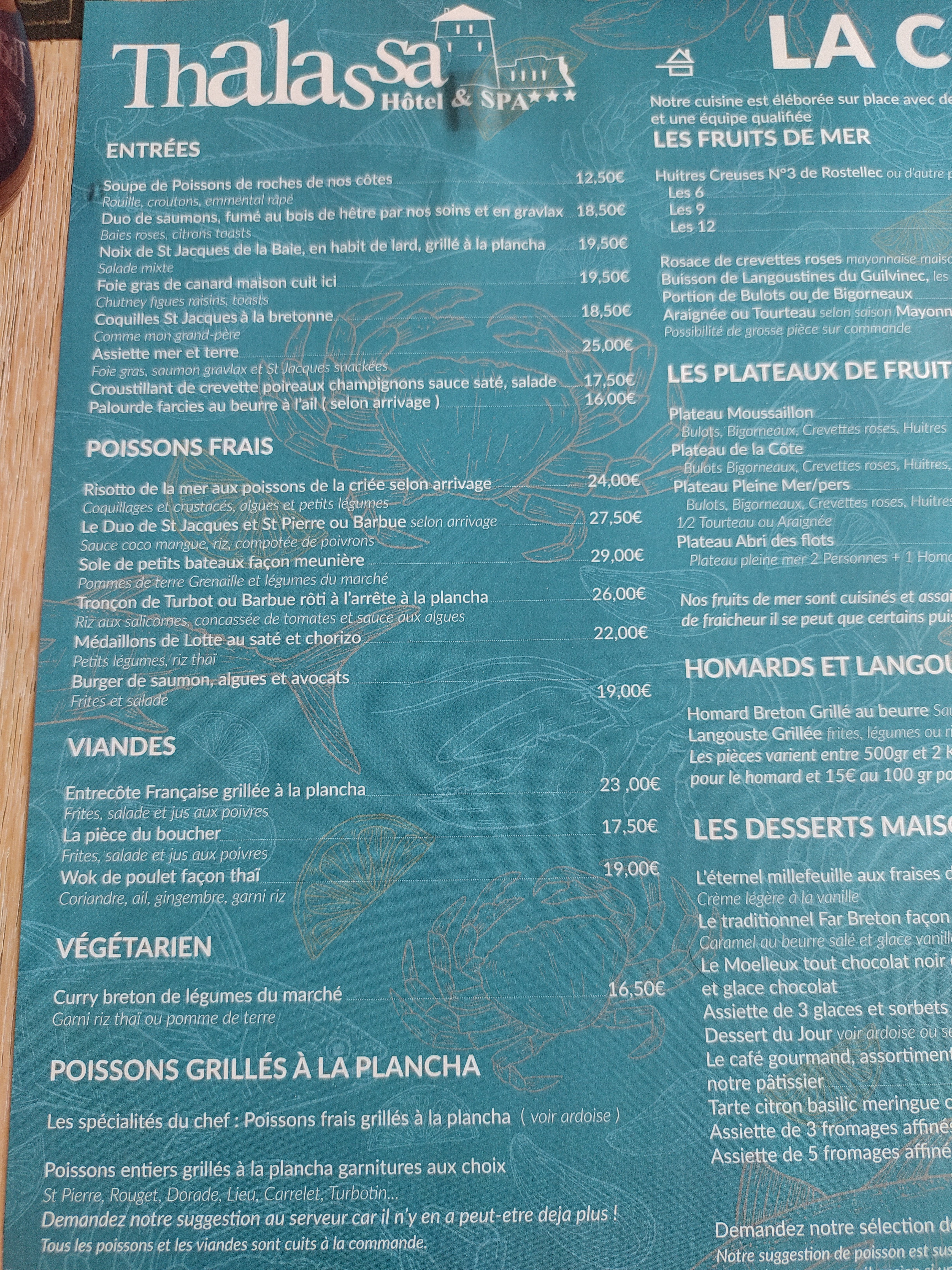 Je viens d'avoir une très mauvaise expérience au restaurant de l'hôtel Thalassa à Camaret. J'avais pris dans le menu une aile de raie qui s'est révélée inmangeable ,non à cause de la qualité du poisson mais de la sauce qui l'accompagnait. Le reste était correct sans plus. Je déconseille ce restaurant
