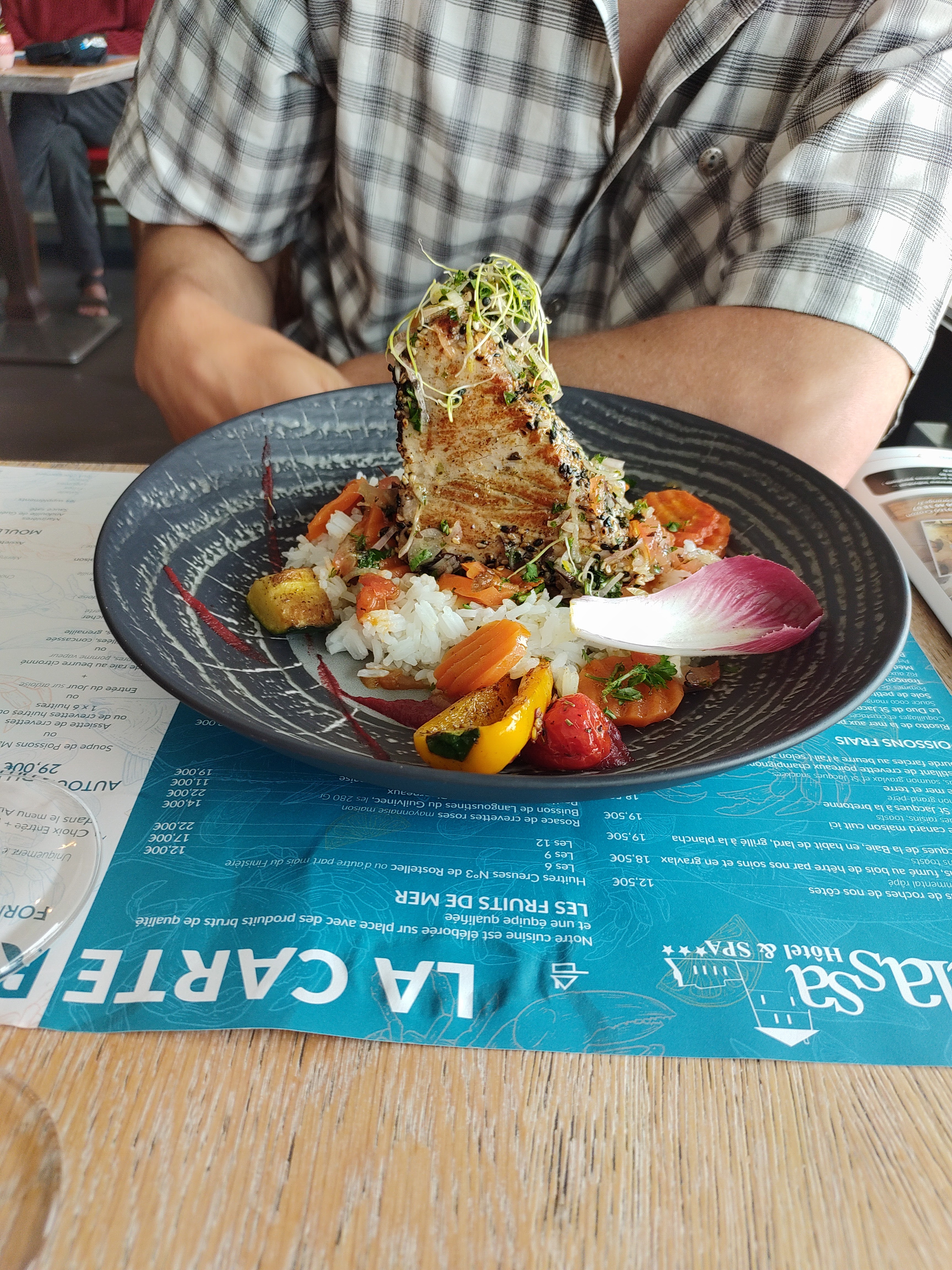 Acceuil standard ni plus ni moins. Carpaccio qui se délie comme s'il était surgelé. Langoustines très petites-pas nécessairement aux tailles minimales-. Raie bonne, basse côte aussi. Bonne mousse maison. Au moins un produit est fait maison. Le pain semble congelé, mais à cette réflexion on nous répond qu'il s'agit simplement du pain du petit déjeuner de l'hôtel du matin même. Sauf que nous avons déjeuner à 14h. Ça fait long pour la chaîne de fraîcheur. En parlant fraîcheur les petits beurres étaient plusque fondus. Eux aussi devaient être restés hors du frigo depuis le petit déjeuner.. Belle chaîne du froid. La moindre économie plutôt que l'hygiène et la satisfaction des clients..