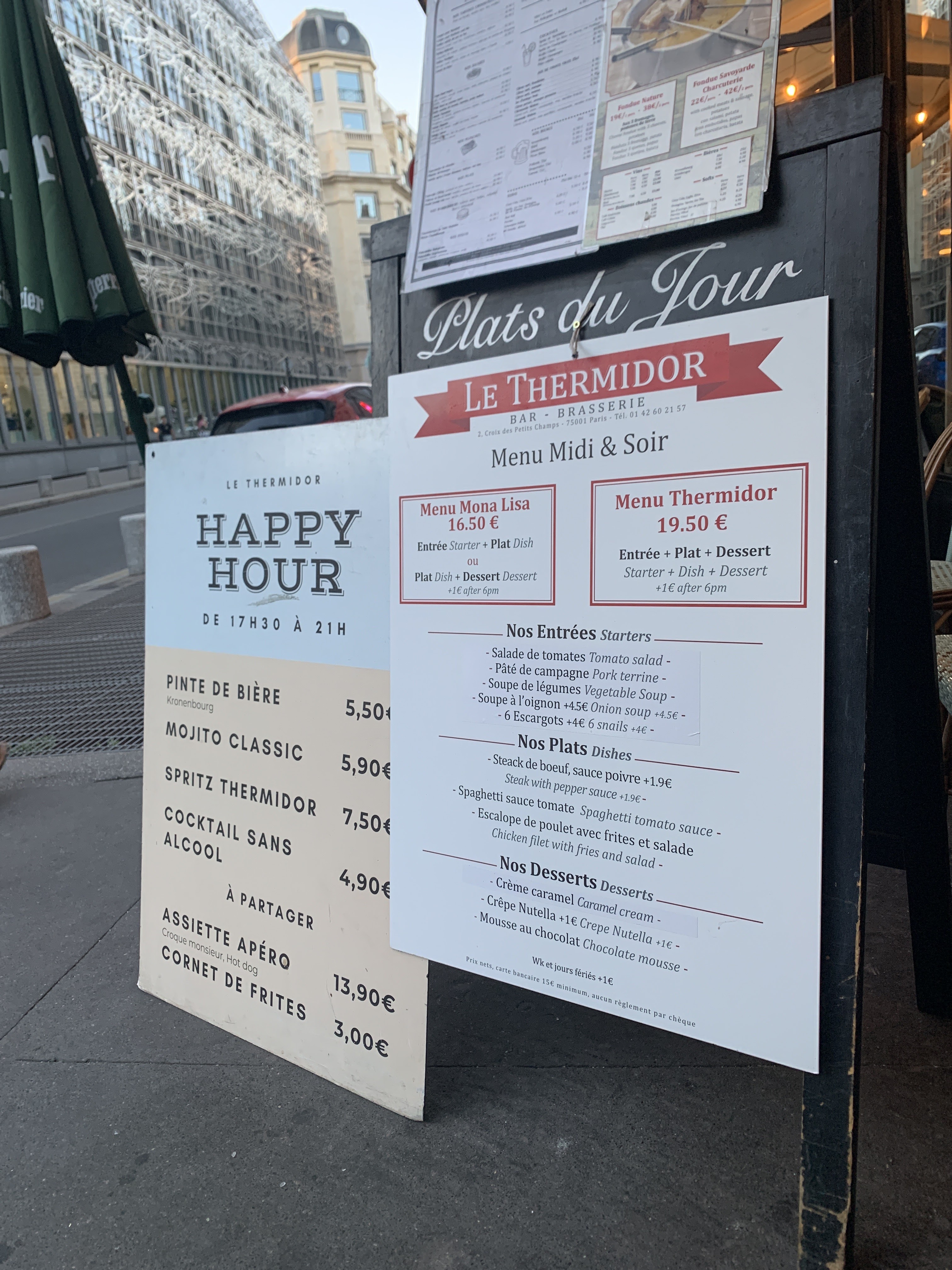 /!\ ATTENTION : bien que le panneau Happy Hour 17h30-21h soit ostensiblement disposé, l'établissement ne le respecte pas forcément. Par exemple, aucune mention des jours pour lesquels il n'est pas valable, alors qu'ils peuvent varier. Attention à ne pas vous retrouver avec une mauvaise surprise au moment de payer....
