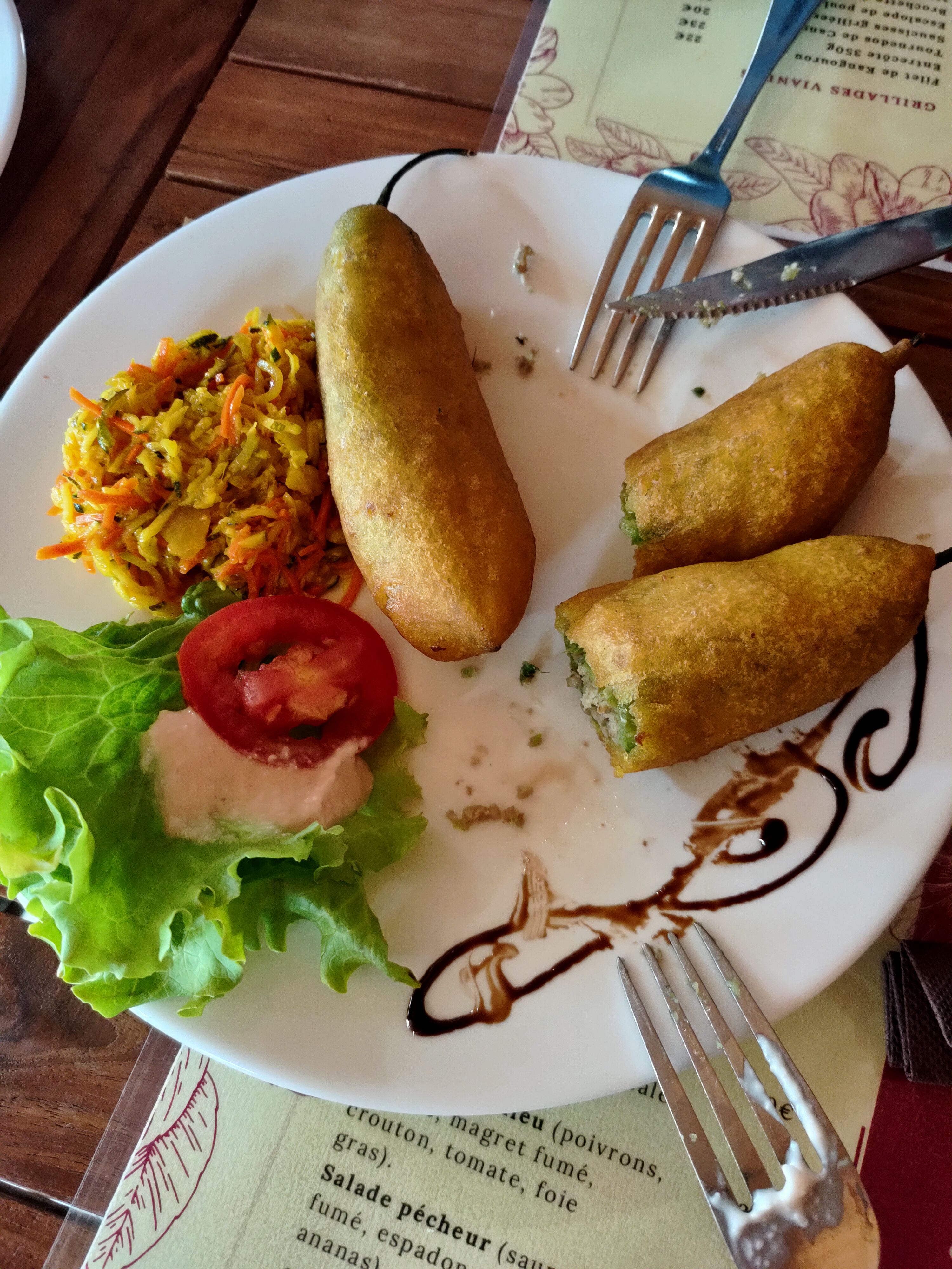 Excellent canard à la vanille et très bon poisson à la vanille. Cuisine au feu de bois, plats copieux et savoureux.
