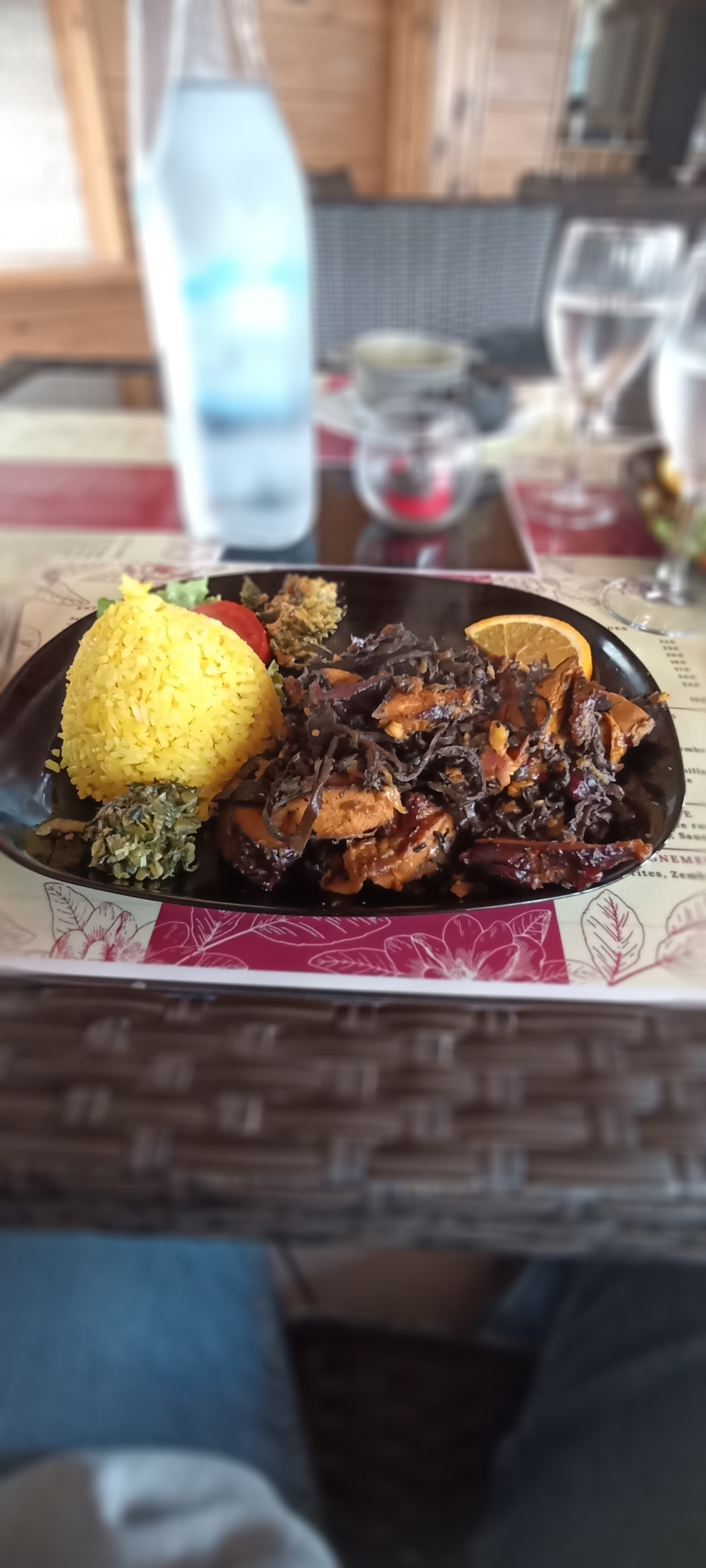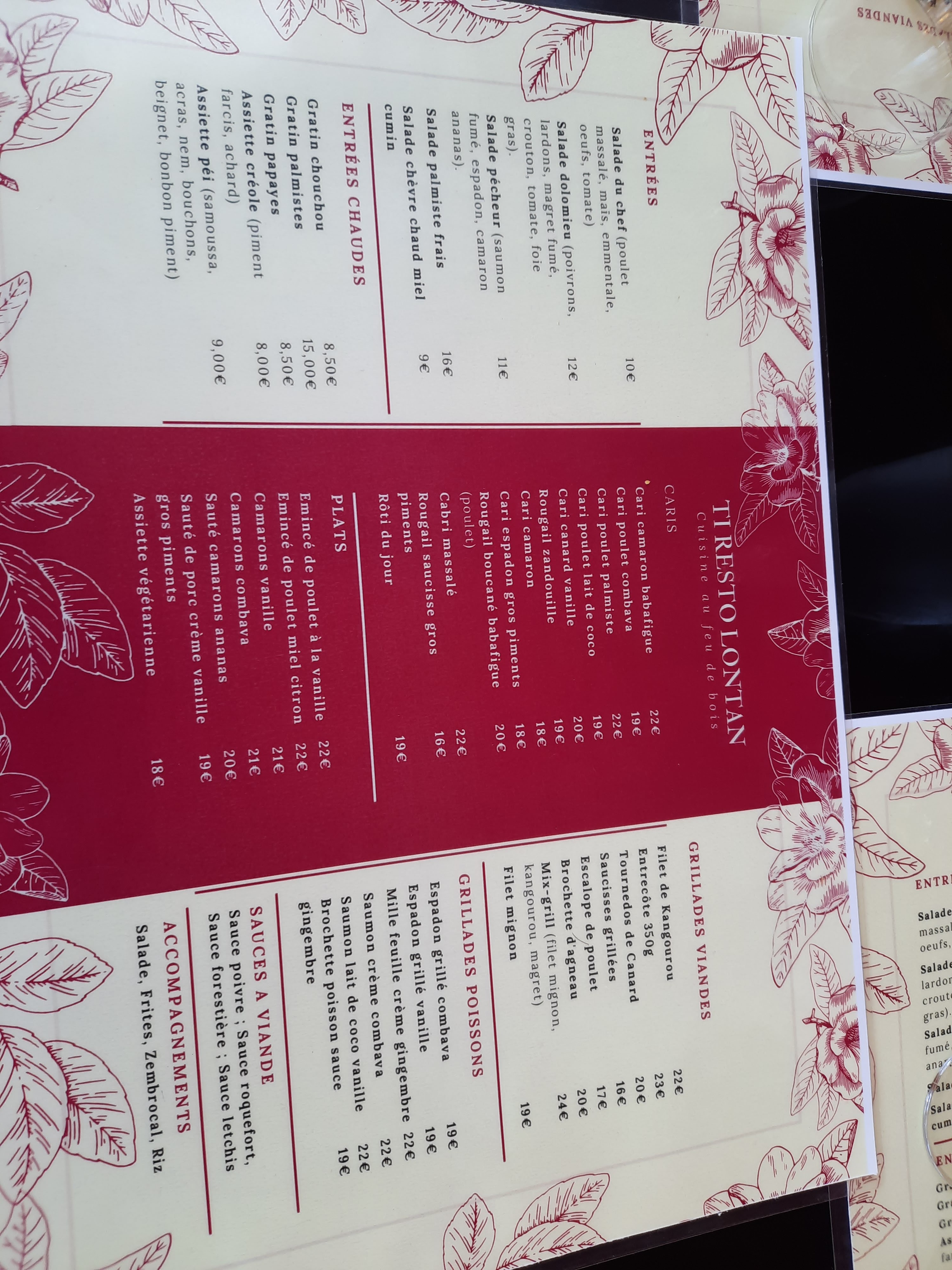 C'est cher et la quantité n'est pas là... À ce prix là on attend d'être rassasié en une assiette (à mon avis pour qu'on consomme des desserts...) Les carrys sont accompagnés de riz ou embrocal ou riz (un petit gazon), de graines et de brèdes (seulement une cuillère) On avait commandé du vin et une carafe d'eau et on a dû redemandé pour avoir le vin, puis une seconde fois pour l'eau Les plats étaient bons