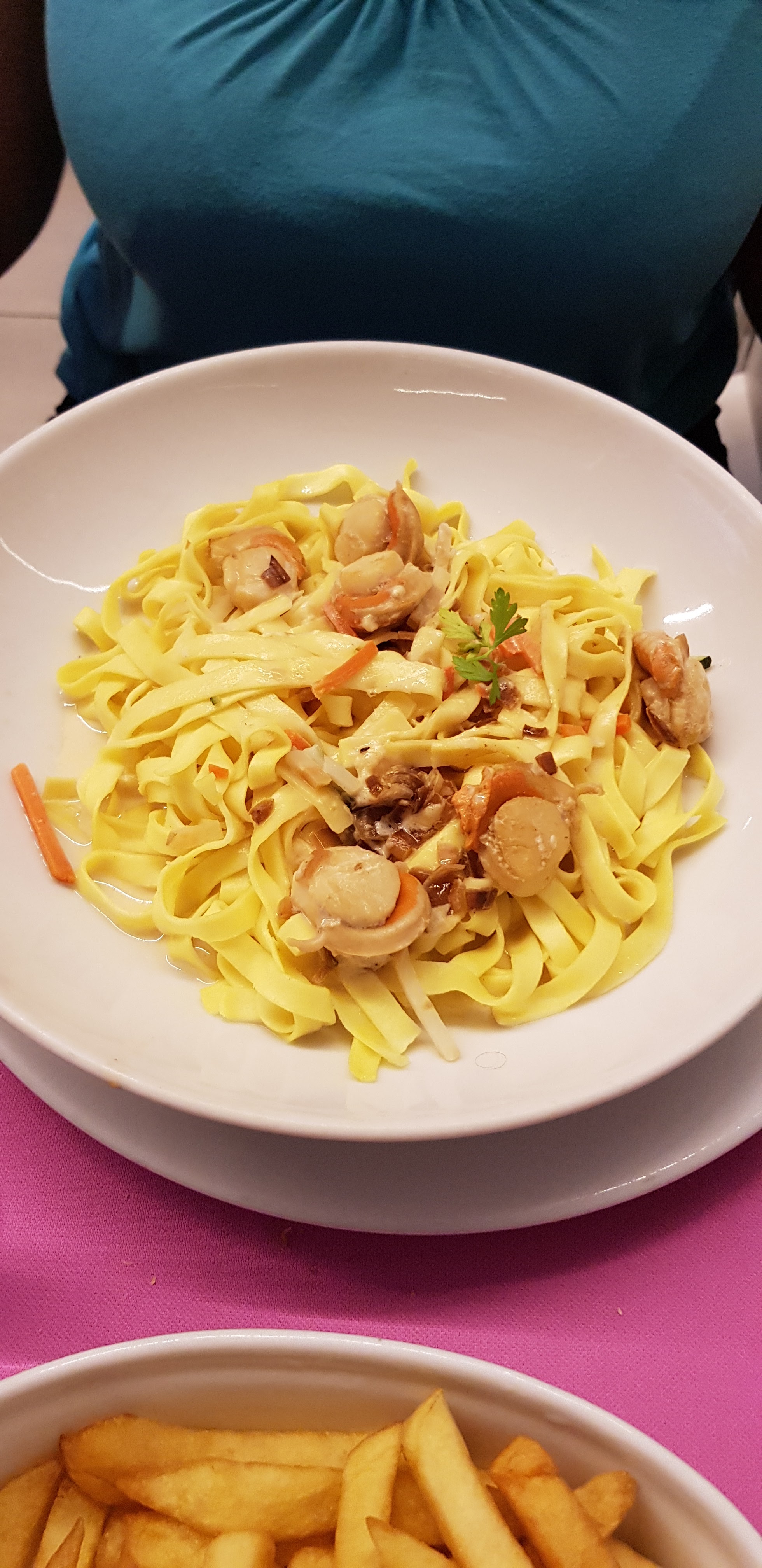 Mes enfants ont pris les tagliatelles au saumon, ils ont adoré ! Moi les moules très bonnes mais pas assez en quantité, j'ai dû compléter avec plusieurs morceaux de pain et un dessert pour être rassasié !! Ils devraient proposer si nous souhaitons en ravoir un peu