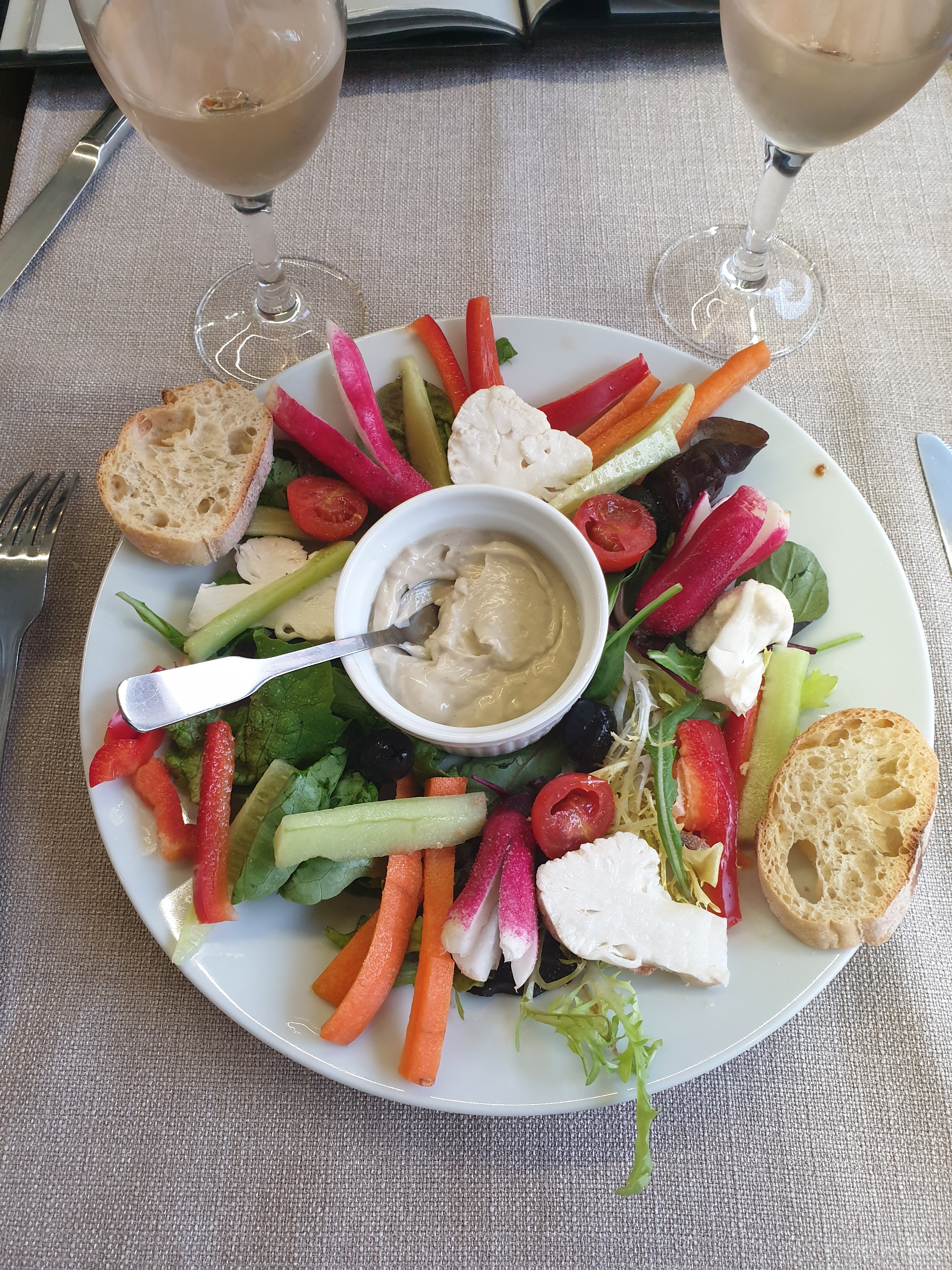 déplorable entrée; anchoiade : des légumes crus coupés en batonnets surement il y a 2jours tellement les carottes sont sèches voir grisatres idem les bouquets de choux fleur la mayonaise a l'anchois n'était pas mauvaise sans plus. le plat bourride de lotte :les memes légumes que précédement mais chaud!! avec quelques morceaux de lotte certainement décongelés le tout nageant dans une sorte de bouillon sans aucun gout; lamentable!!! la table de droite un anglais se battait avec un onglet si dur qu'il a du le faire échanger par un autre aussi corriace ..mais l'anglais avait de l'humour heureusement le pain n'est pas dur!à gauche memes batonnets de legumes en accompagnement ;nous sommes parti prendre le dessert ailleur..