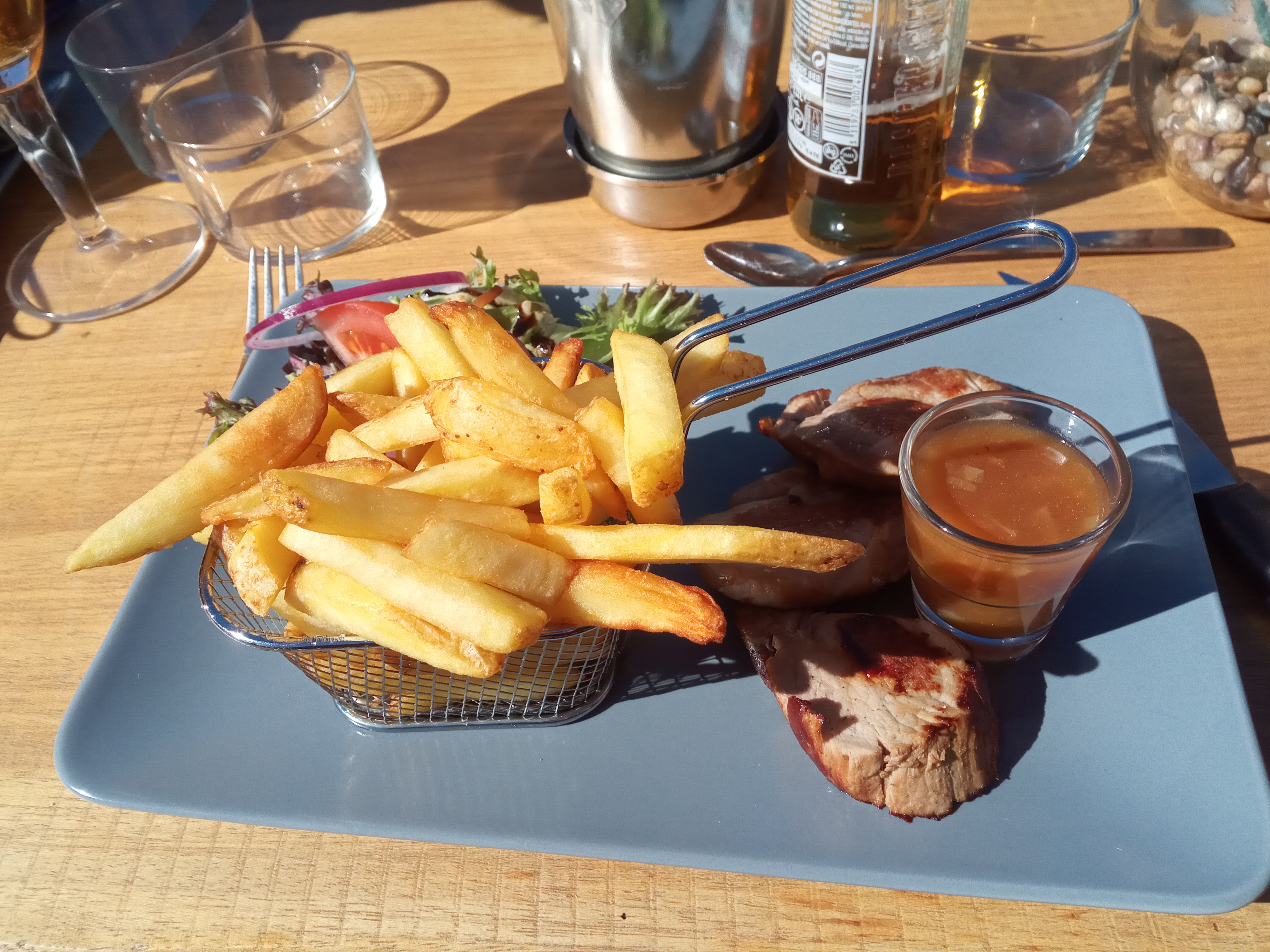 Déjeuner samedi midi ,pour 8 personnes, 2 menus enfant comprenant le steak haché / frites avec glace pour l'un. Le 2 ème, blanc de poulet sec avec frites + crepe choco .boisson non comprises pour les enfants. Ensuite a la carte, une entrecôte frites, un chees burger classique/ frites + 3 menus du jour: filet mignon de porc / frites. 8 boissons : 2 afliguem, 1 verre de vin rouge, une despé, 2 sirop a l'eau, 2 coca+ 4 Kfé : toto: 140 et quelque euros. Tout ça en terrasse sous le soleil. Point bonus; serveur dynamique,souriant et services rapide . Vous avez toute les photos