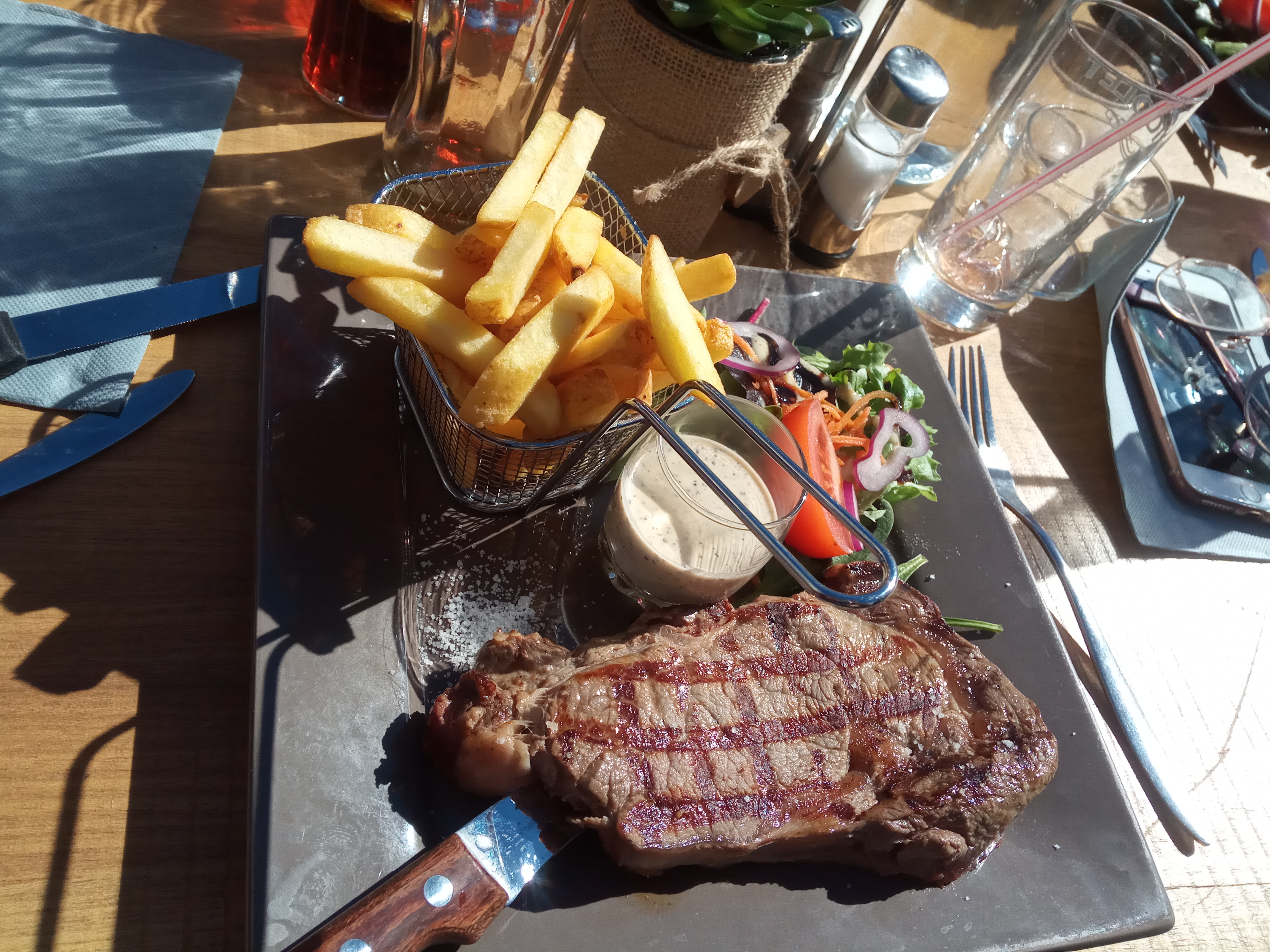 Frite pas cuite, crosiflette insipide, légumes cramer et poivrer, entrecôte de 280g qui était pas assez cuite et froide et qui fesait plus 200g au lieu de 280g, les carafes d'eau taper sur la table, le cuisiner qui fume dehors touche son masque rentre pour faire la cuisine sans ce laver les mains, bref a fuir. Et prix excessif. Pas bon rapport qualité prix.