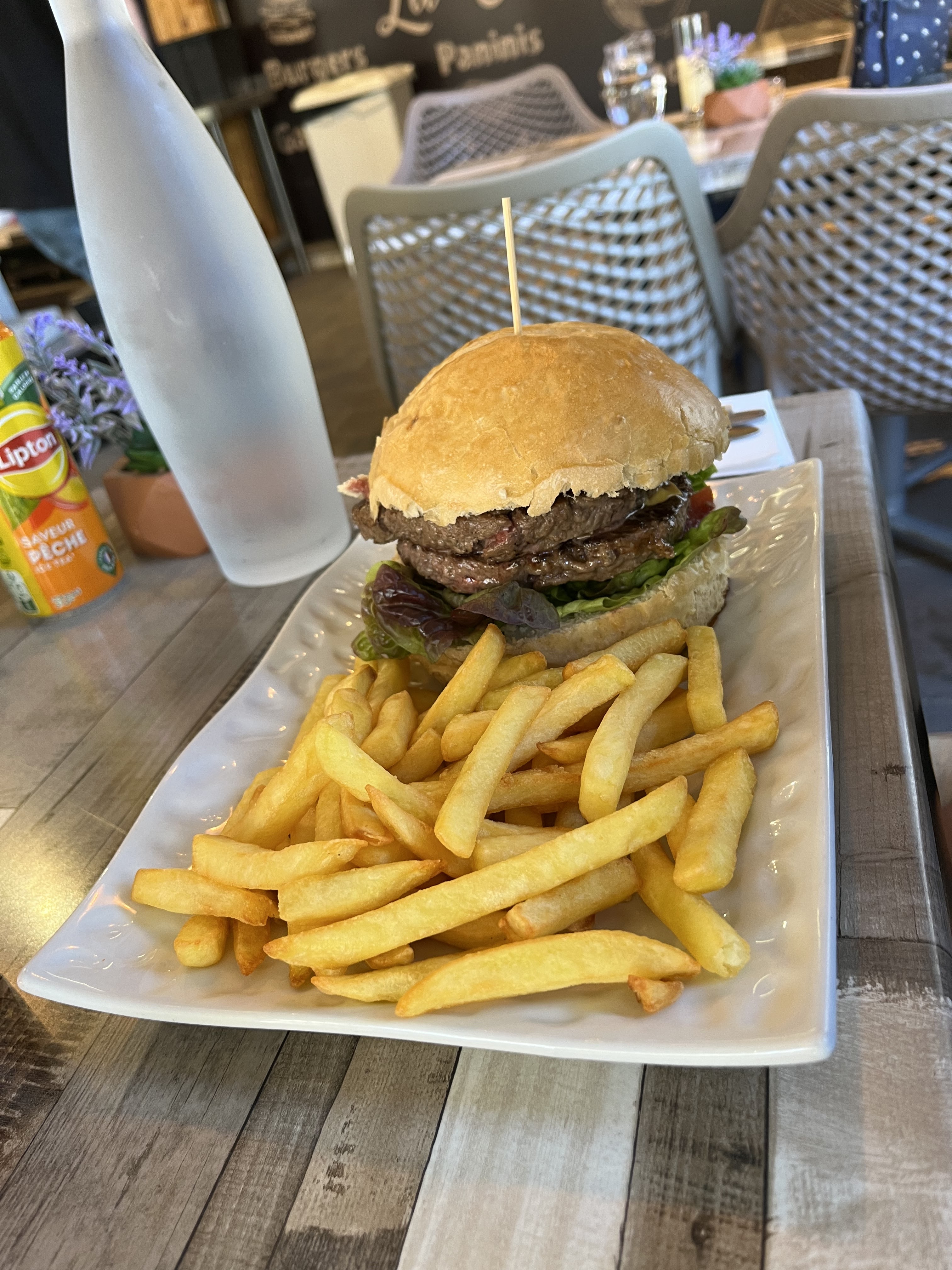 ressenti d'une mauvaise ambiance entre serveuses. les serveuses et cuisiniers fument devant le restaurant pendant le service. Serveuse qui gueule sur la patronne après lui avoir donné notre ressenti.marguarita médiocre. brochettes de poulet et porc très sèches,immangeables. big burger et fritures bons. très déçus dans l'ensemble. petite correction, le big burger a rendu malade la nuit et direct vomi dans les toilettes. produits frais??
