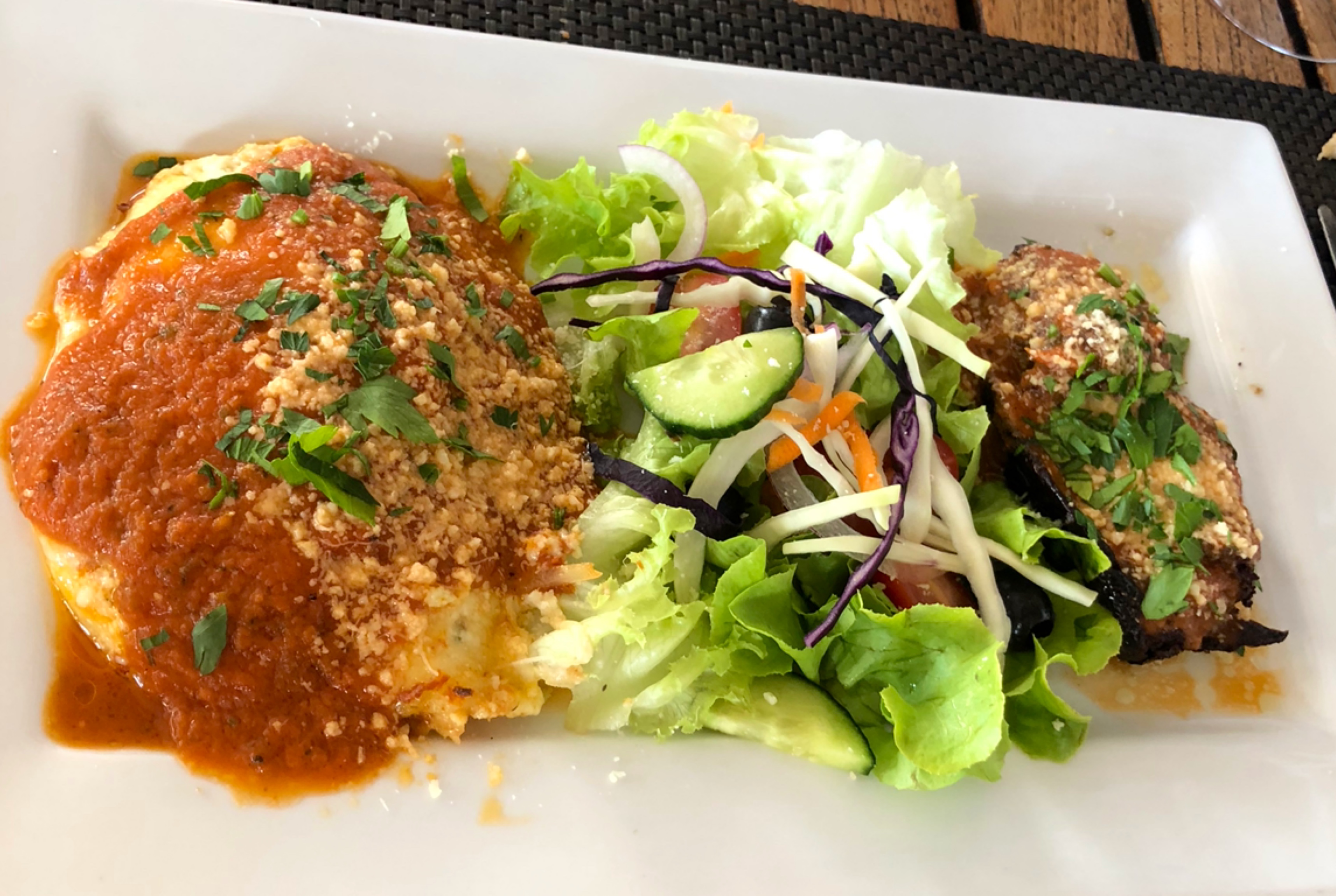 La nourriture était médiocre. Les lasagnes n'étaient pas mauvaises mais je m'attendais à quelque chose de mieux. On aurait dit qu'il avait été chauffé plusieurs fois et que le goût lui-même était assez brutal. Les aubergines n'étaient pas non plus fraîches et manquaient de saveur.