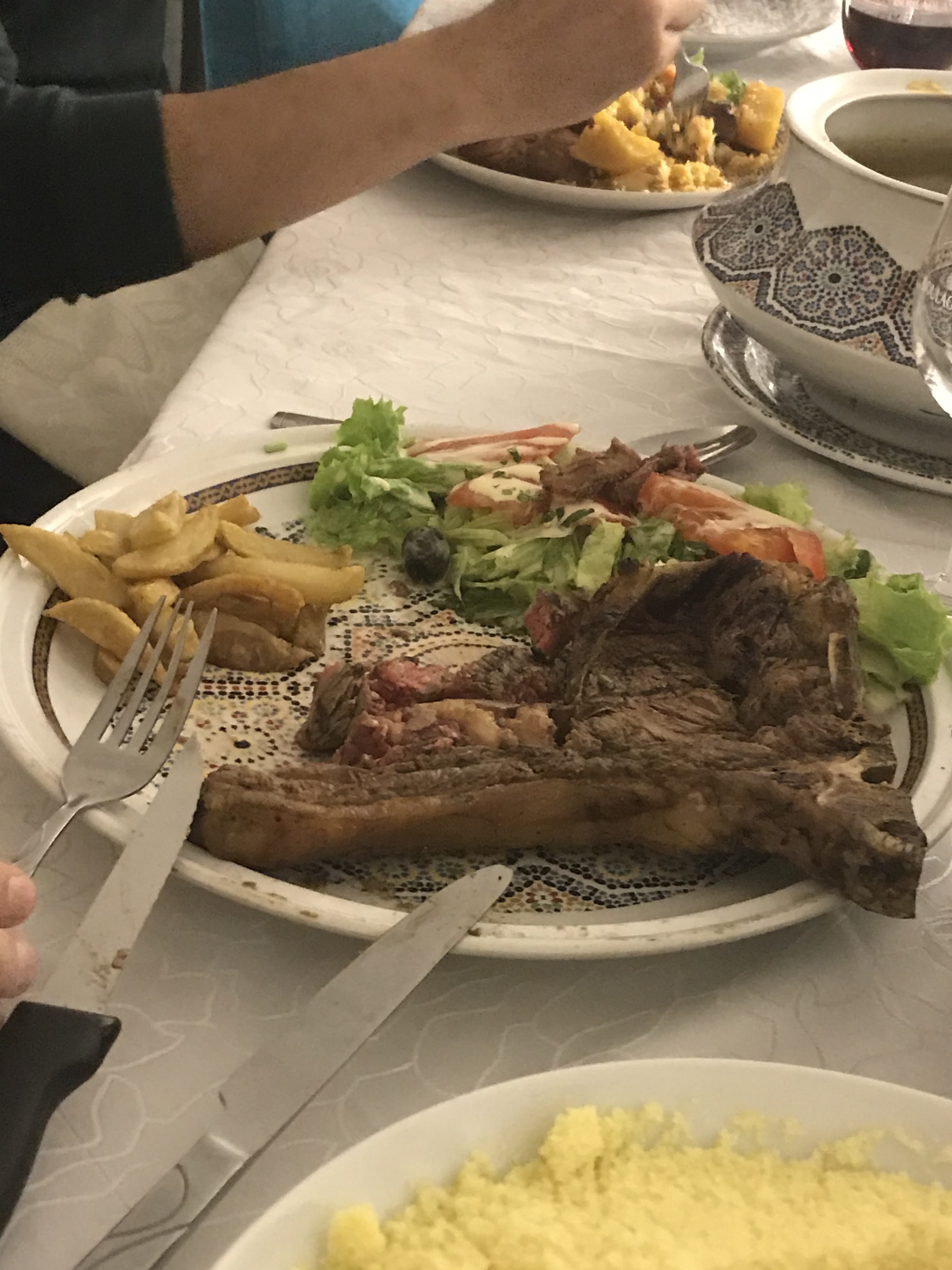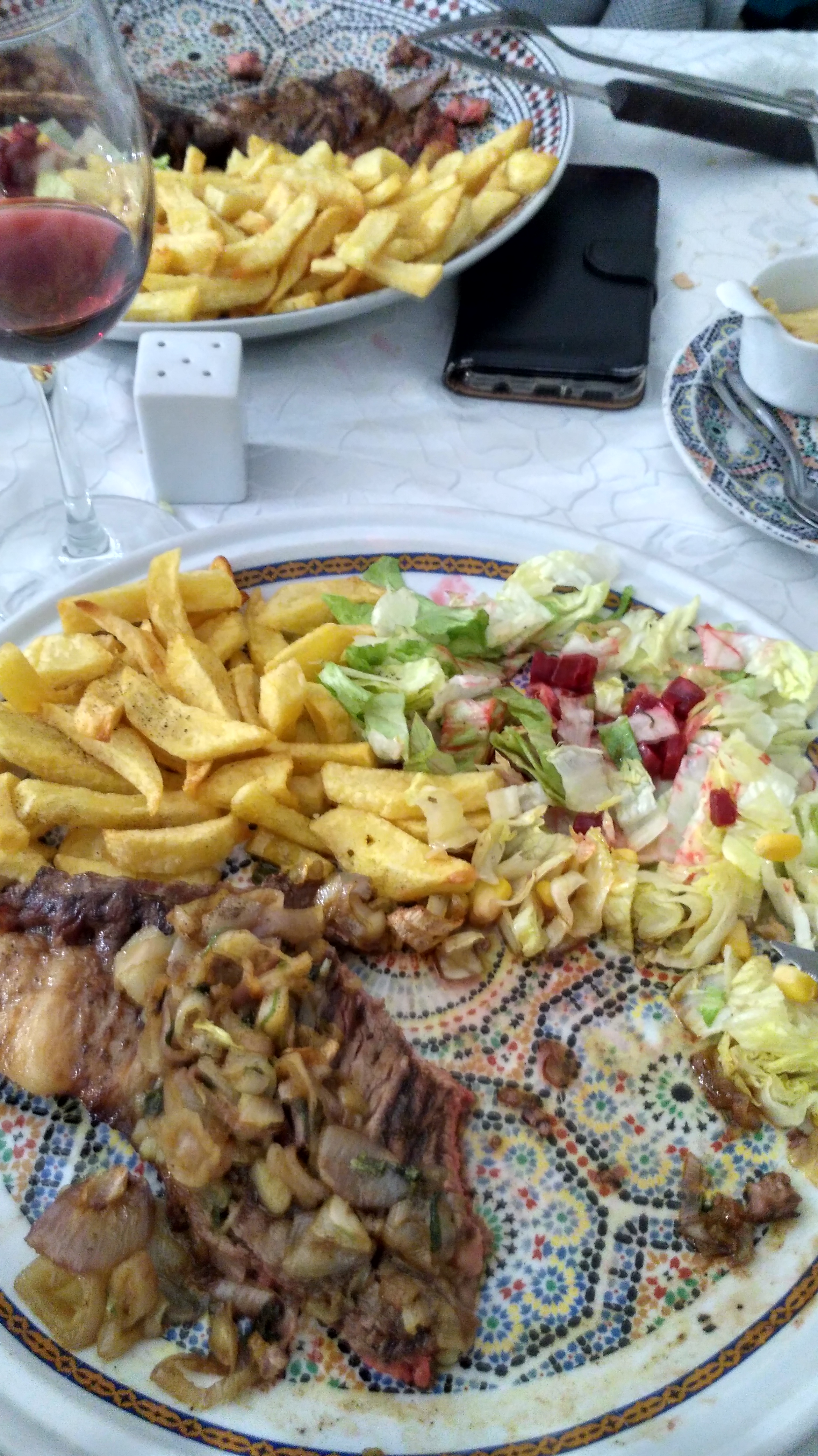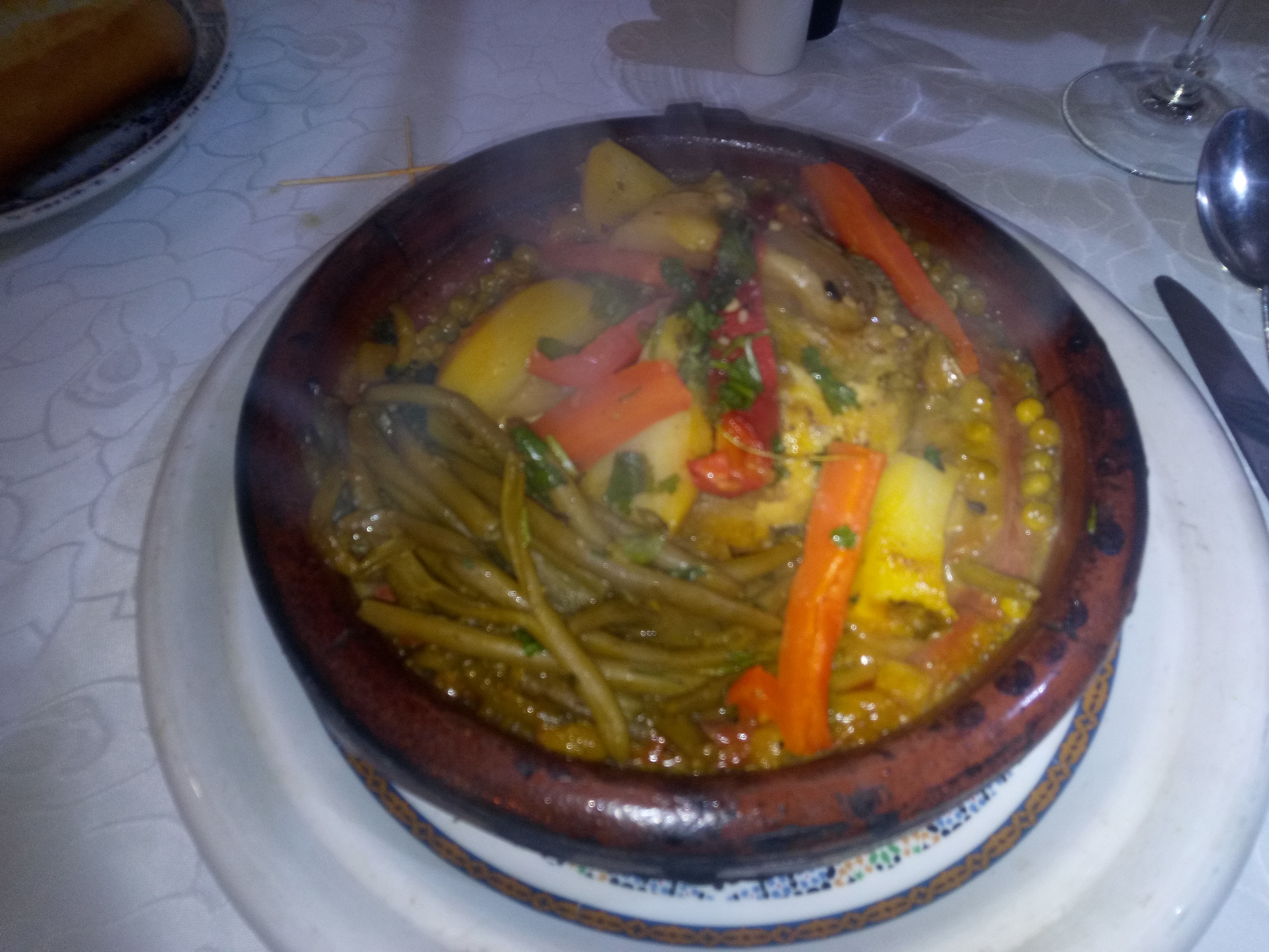 Nous sommes allés dîner le dimanche soir après que l'hôtel l'ait recommandé. La bonne cuisine marocaine et le menu étaient en anglais. Nous avons commandé dans notre mauvais français - mais nous avons très bien réussi. Cependant, un autre client a fait des blagues très bruyantes avec le serveur à propos de notre « mauvais français » et a été vraiment impoli. C'est dommage que ce genre de comportement n'ait pas disparu avec les dinosaures mais dommage que les touristes non francophones ne semblent pas les bienvenus.