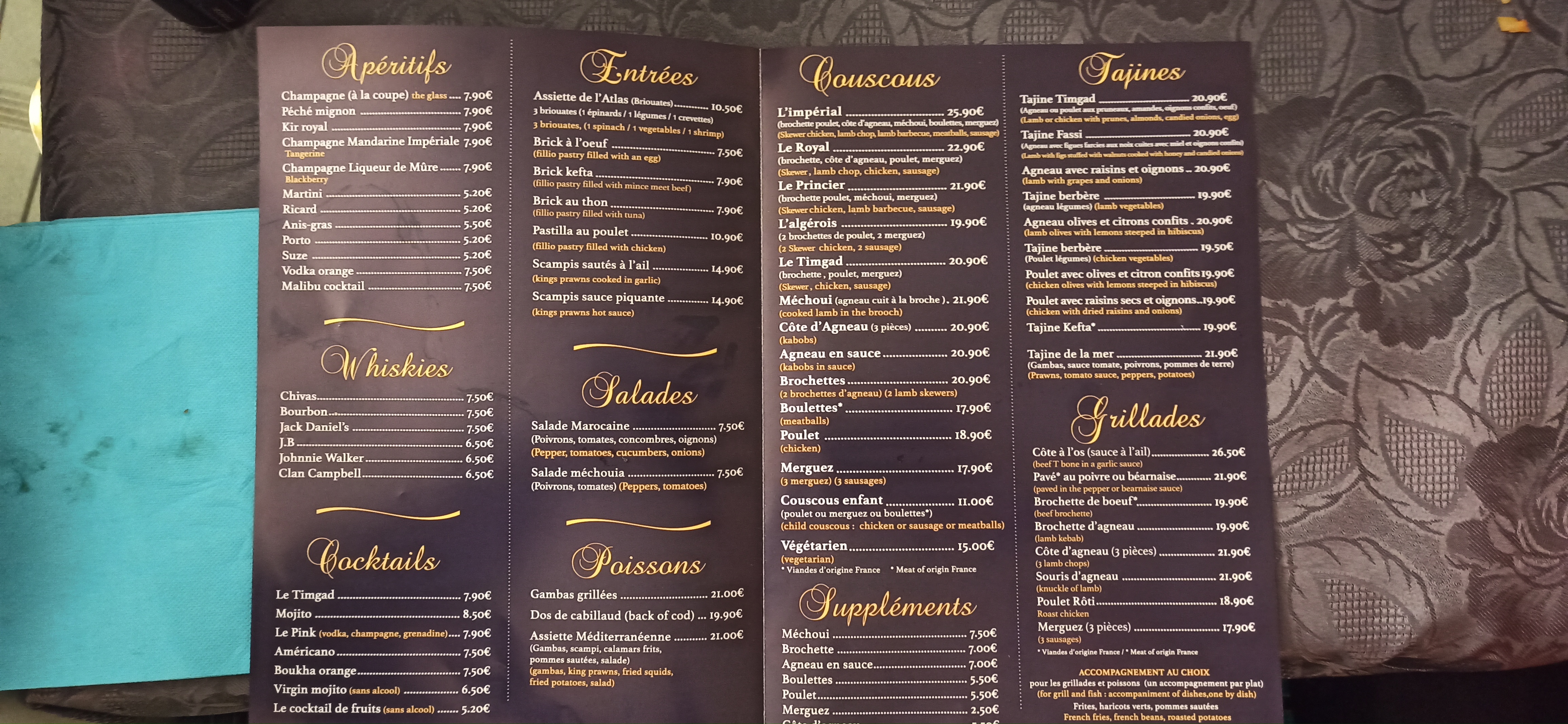 Une nouvelle fois, nous nous sommes régalés avec comme plats, 2 coucous TIMGAD, un coucous Princier et un Tajine poulet. Le patron et la patronne sont souriants et très sympathiques, ils participent activement au service. Les serveurs sont d'une gentillesse et d'une efficacité exceptionnelle. Le samedi soir le TIMGAD vous offre un spectacle de danse orientale à ne pas manquer. Le décor ! La photo parle d'elle-même. A très bientôt Merci beaucoup.