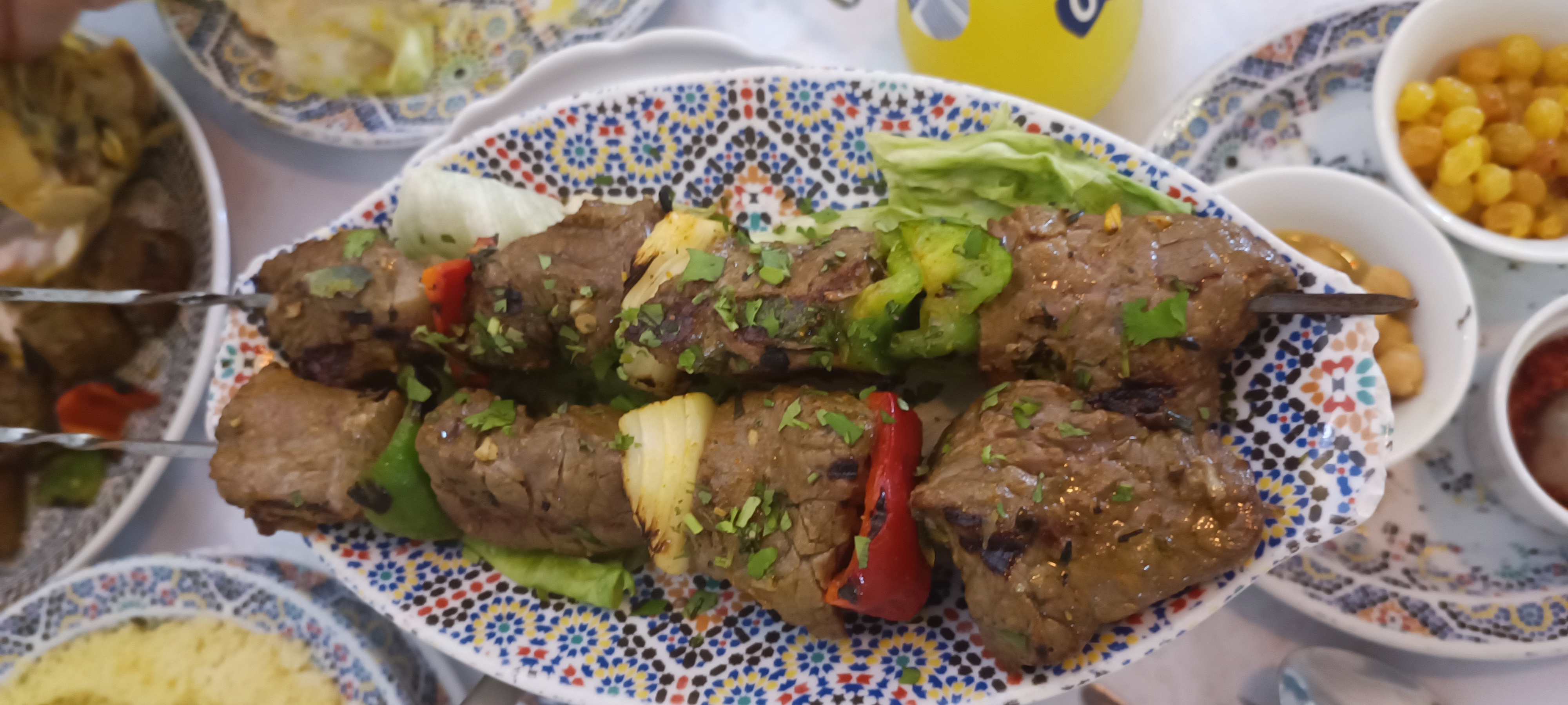 Nous avons pris un couscous trois viandes ( brochettes de bœuf, poulet et merguez), nous nous sommes régalés. L'intérieur est original. Les serveurs sont sympas et très souriants de même pour la danseuse orientale.