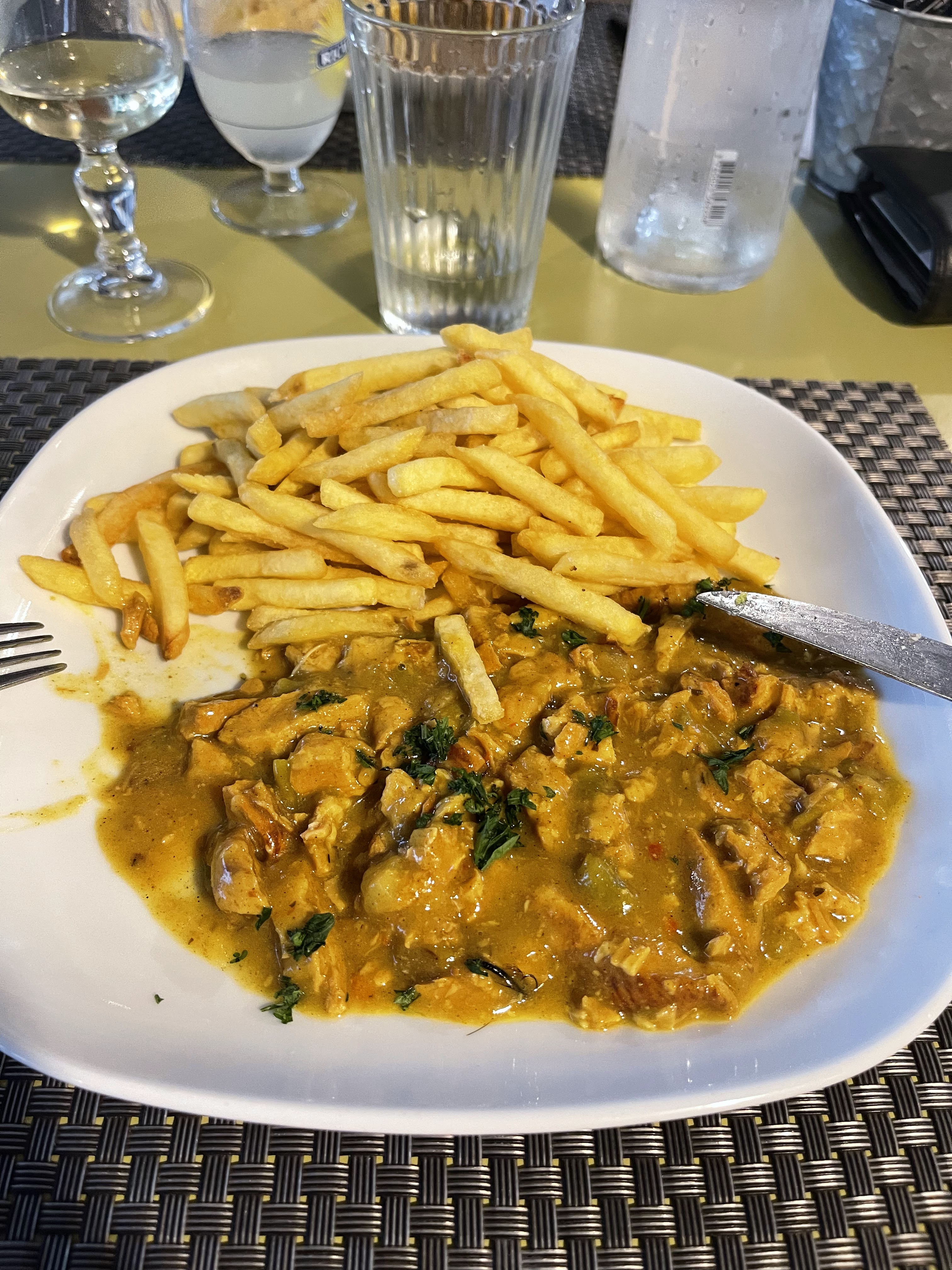 Nous venons dans ce camping depuis des années et avons dîné au Tipi pour la première fois. La dernière fois aussi. Nous avons pris le menu du jour, 3 plats. La nourriture est arrivée rapidement mais a été simplement jetée sur la table. La « tarte au fromage » était bonne. Le curry de ragoût de poulet était du sel de balai. On dirait qu'il a été jeté dans l'assiette directement depuis une canette. Les frites étaient bien frites. Il n'y avait rien de mal avec la mousse au chocolat. Le pastis était bon mais le Chardonnay était comme l'eau du fossé. Tout est d'un bon rapport qualité/prix et ce n'était certainement pas cher, mais un service amical ne coûte rien. Et je peux aussi réchauffer moi-même des conserves. Non recommandé.