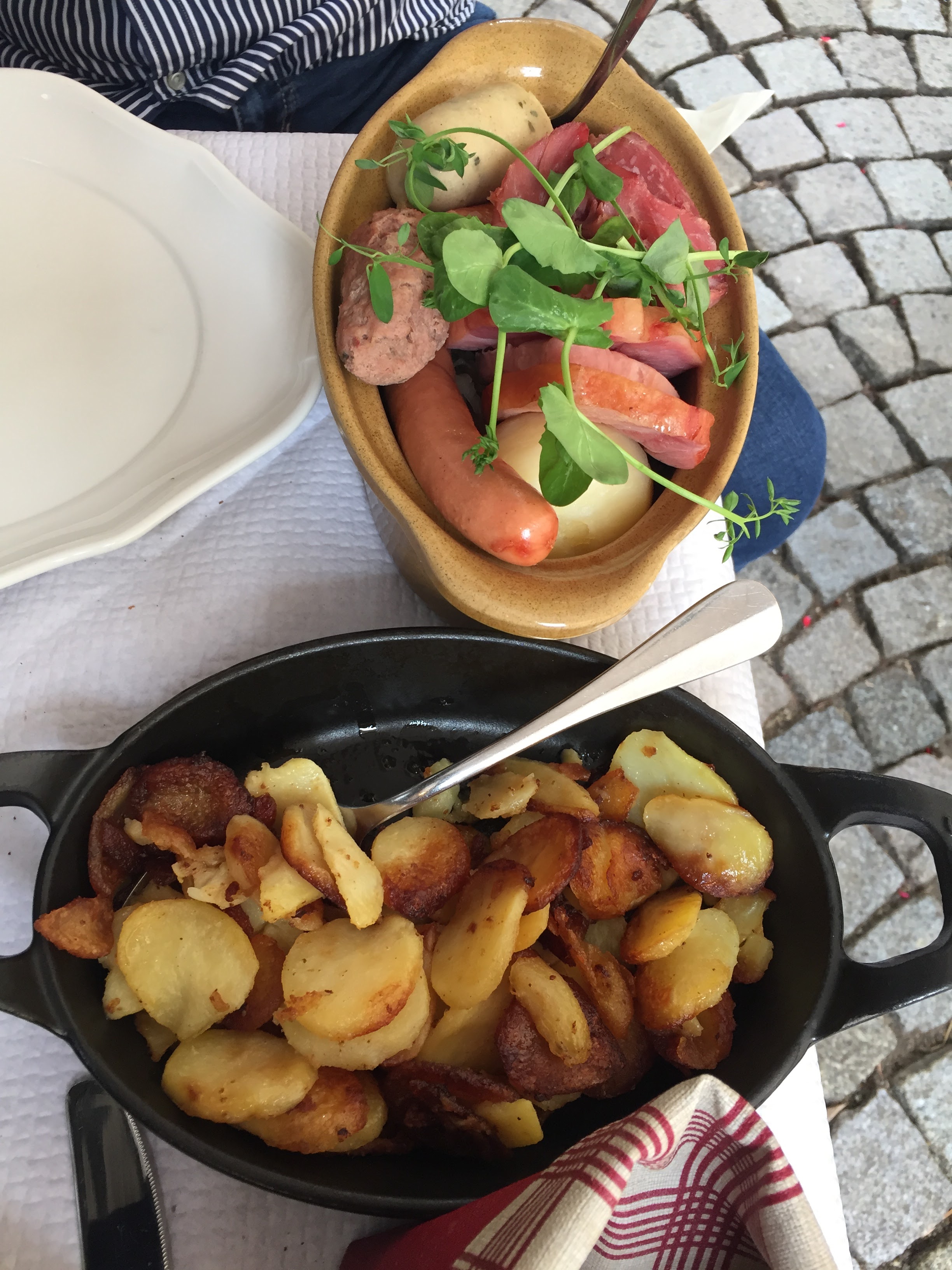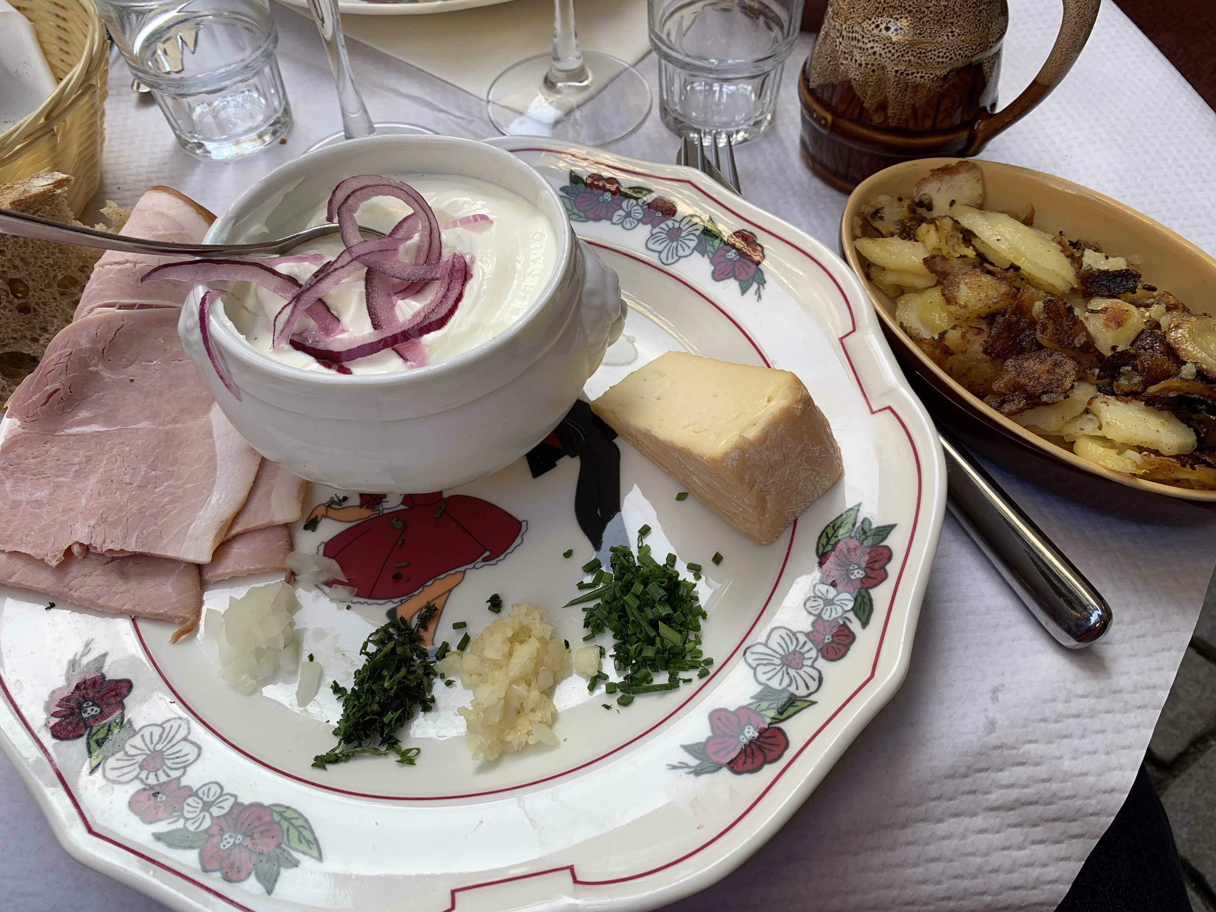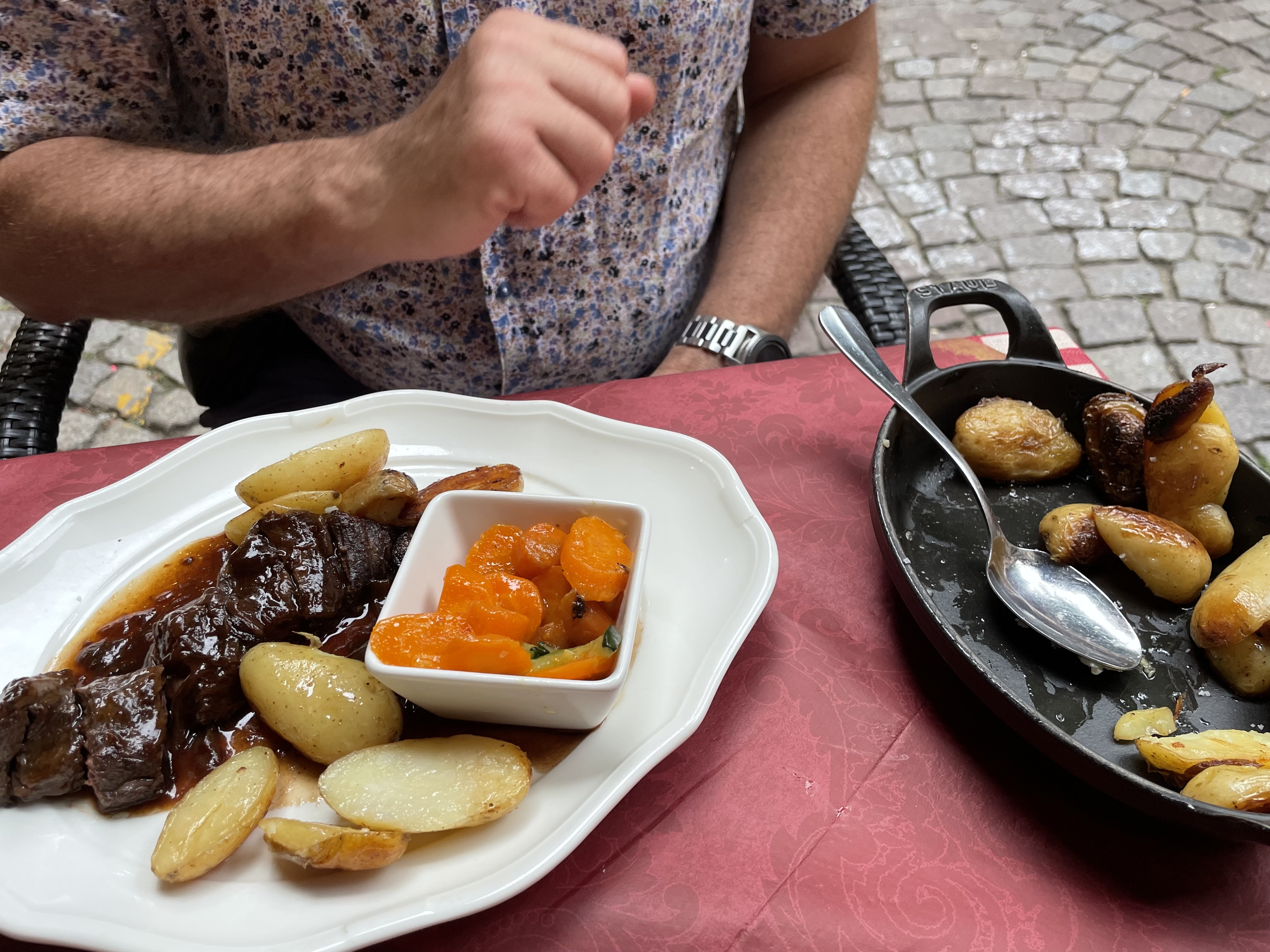 La nourriture était ok, le menu est disponible en anglais et en français, mais la plupart des plats ont des noms spéciaux ou en allemand, je vous recommande donc de demander au serveur si vous ne savez pas quoi commander. Je ne l'ai pas fait et j'ai été surpris par une combinaison douteuse de saumon fumé cru et de pommes de terre à la crème😂. . . Le restaurant est situé dans une rue pavée et si vous vous asseyez dehors, cela crée une atmosphère agréable, immersive et captivante de la rue et les autres clients. Le serveur était souriant et drôle, a détendu l'atmosphère et a fait des blagues.