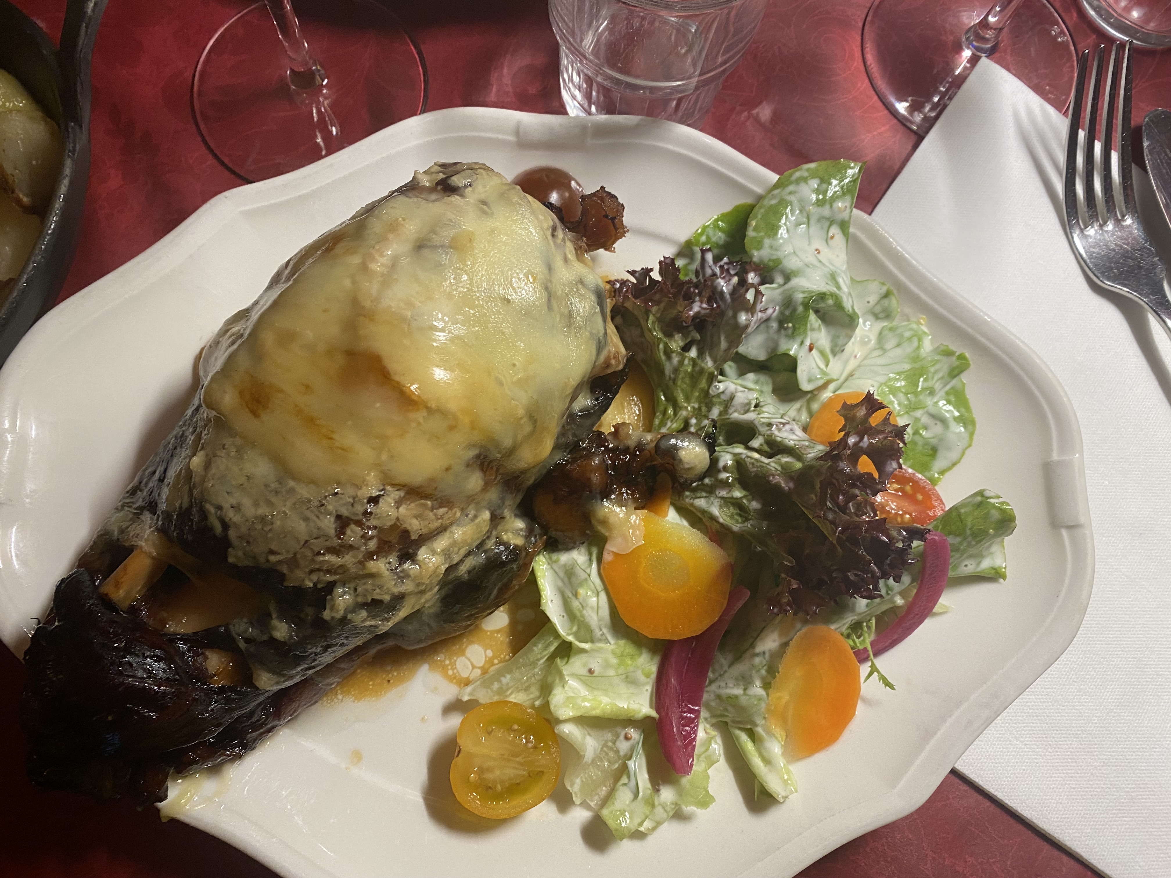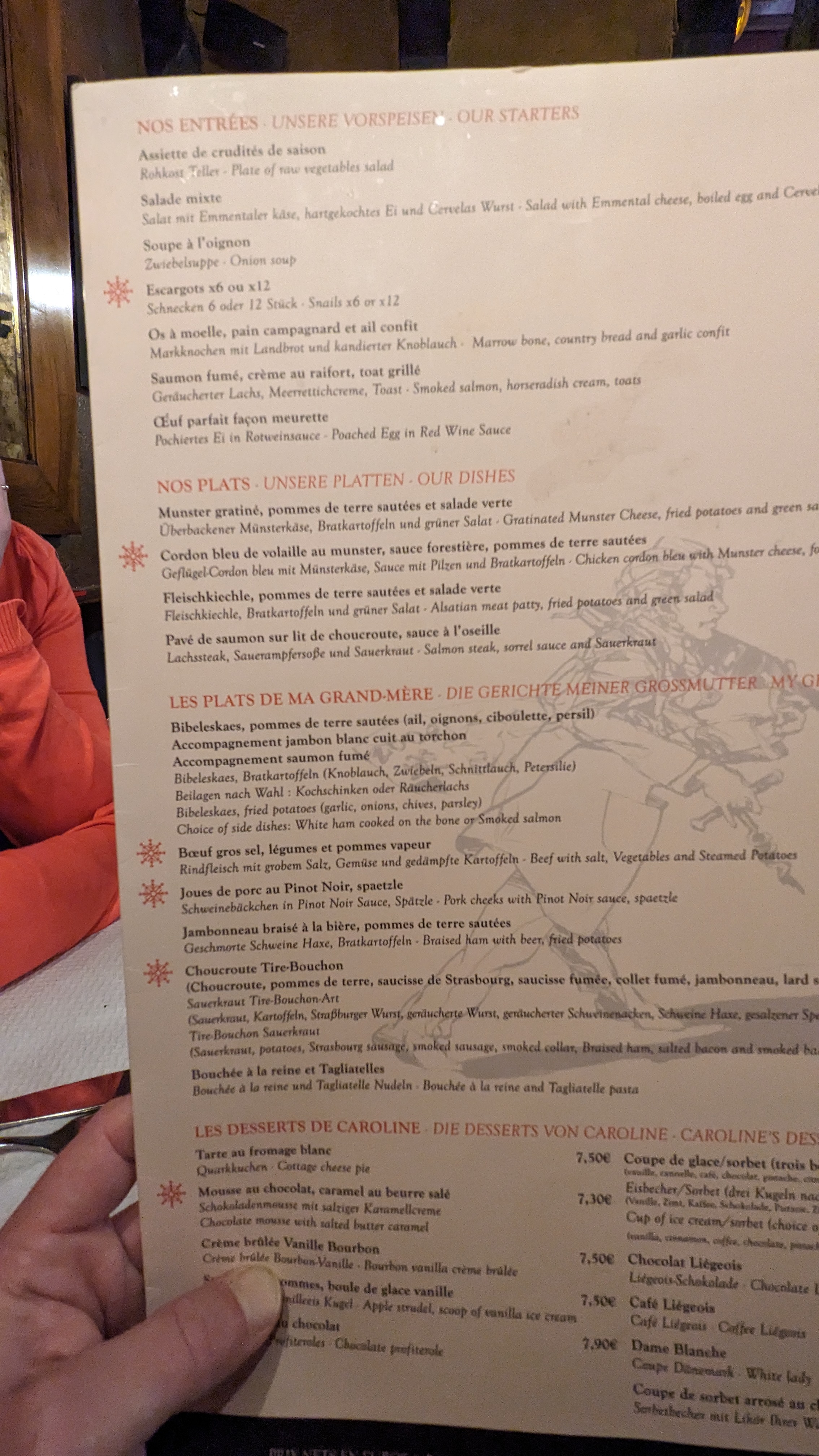 Expérience fantastique! L'endroit est typique de l'Alsace, le personnel était gentil et très sympathique. Nous avons dégusté du Foie Gras en entrée, suivi d'un Cordon Bleu accompagné d'une purée de pommes de terre et d'une délicieuse sauce aux champignons. Nous avons terminé notre dîner avec de superbes Profiteroles (elles sont assez grosses, les gens autour de nous les partageaient ensemble). Tout était parfait et les prix n'étaient pas si élevés pour la qualité que nous avons eue 🙂
