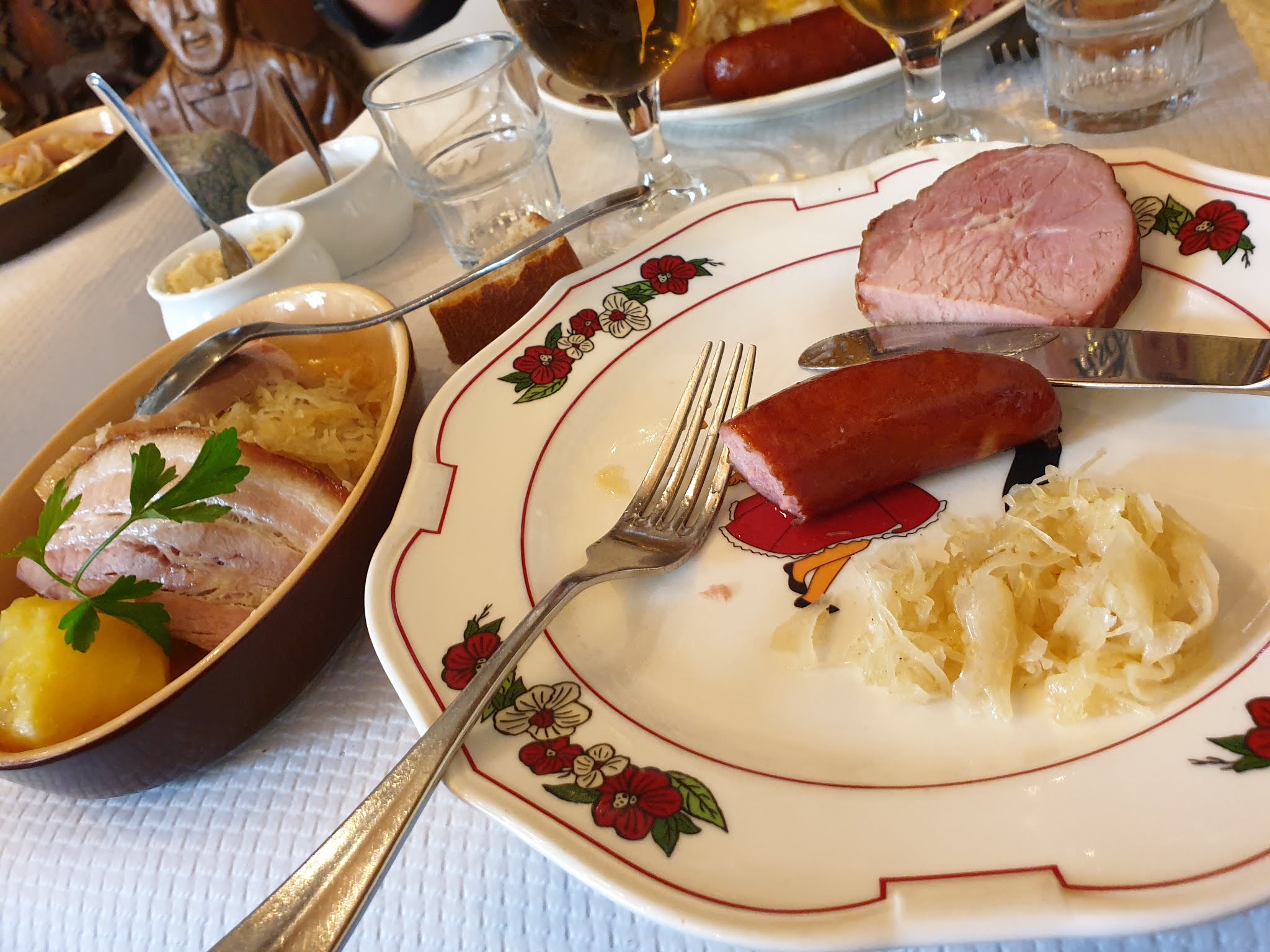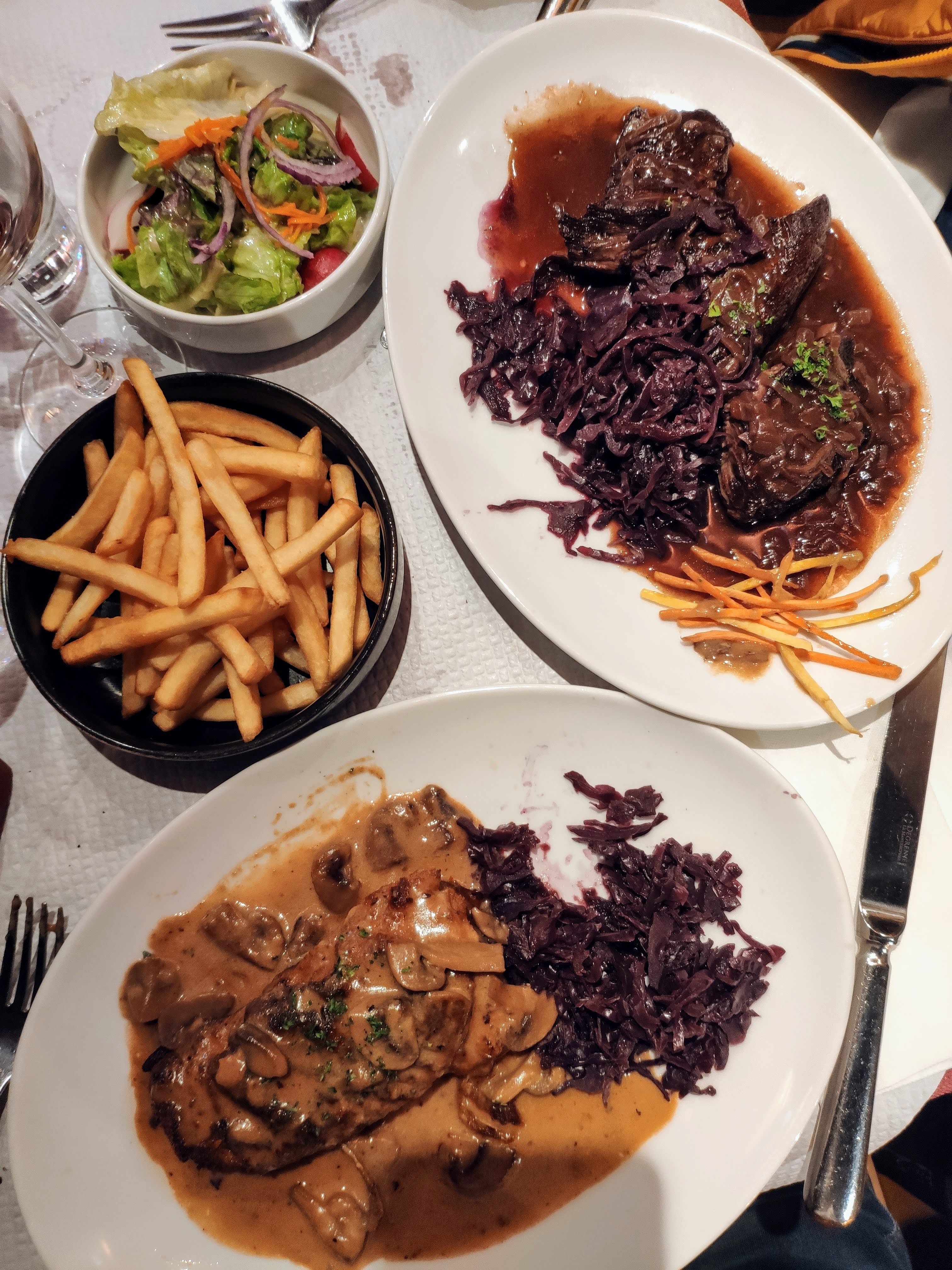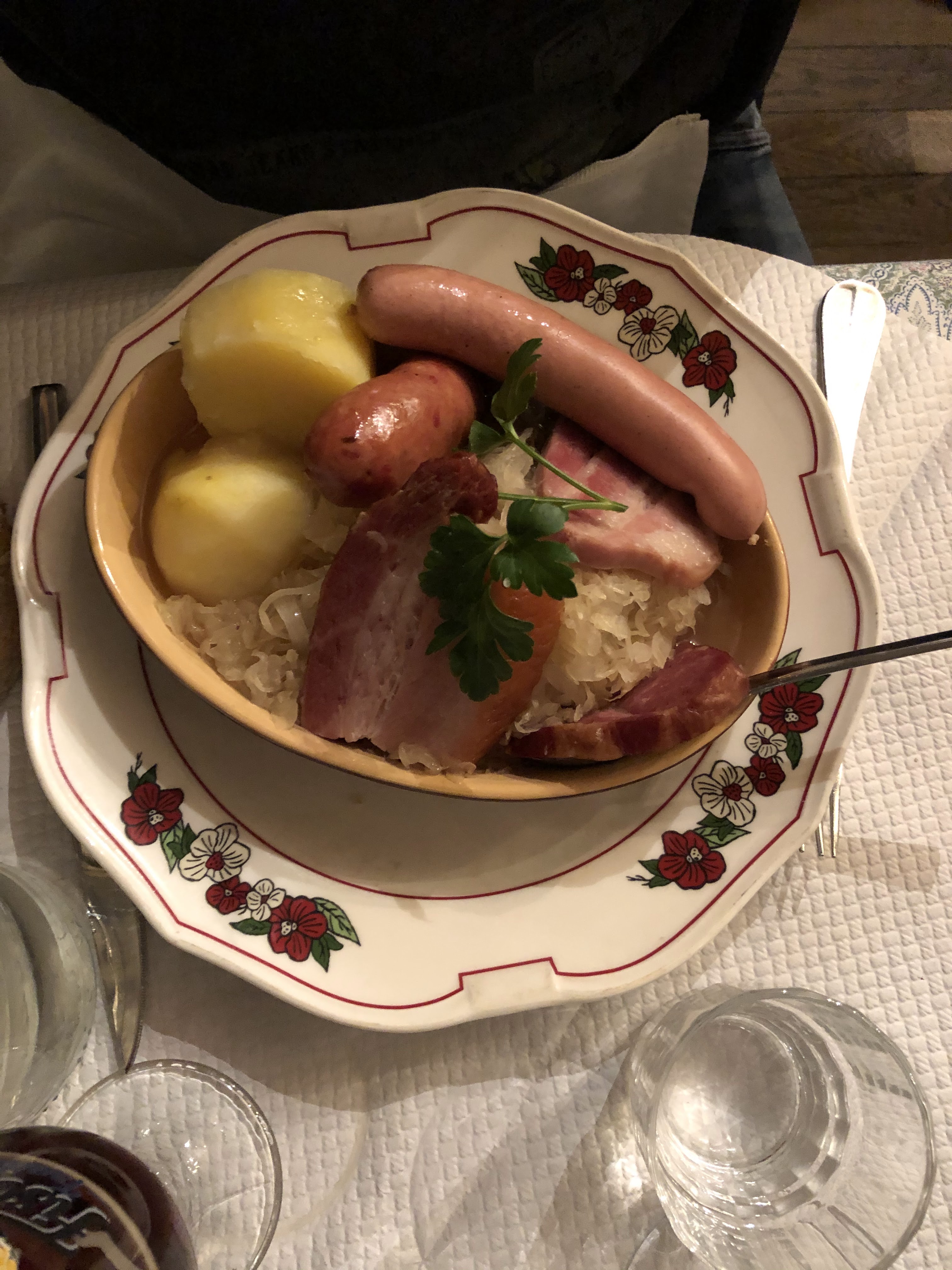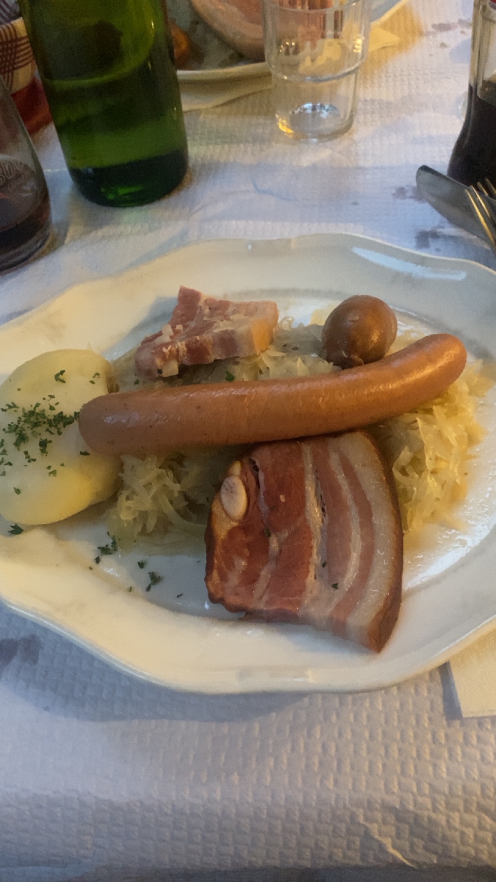Repas copieux et de très bonne qualité. Nous nous sommes contentés d'un plat: choucroute et jamboneau à la bière car nous n'avions plus faim pour un dessert. Ce n'est pas un attrape touriste malgré la situation. Le soir, indispensable de reserver