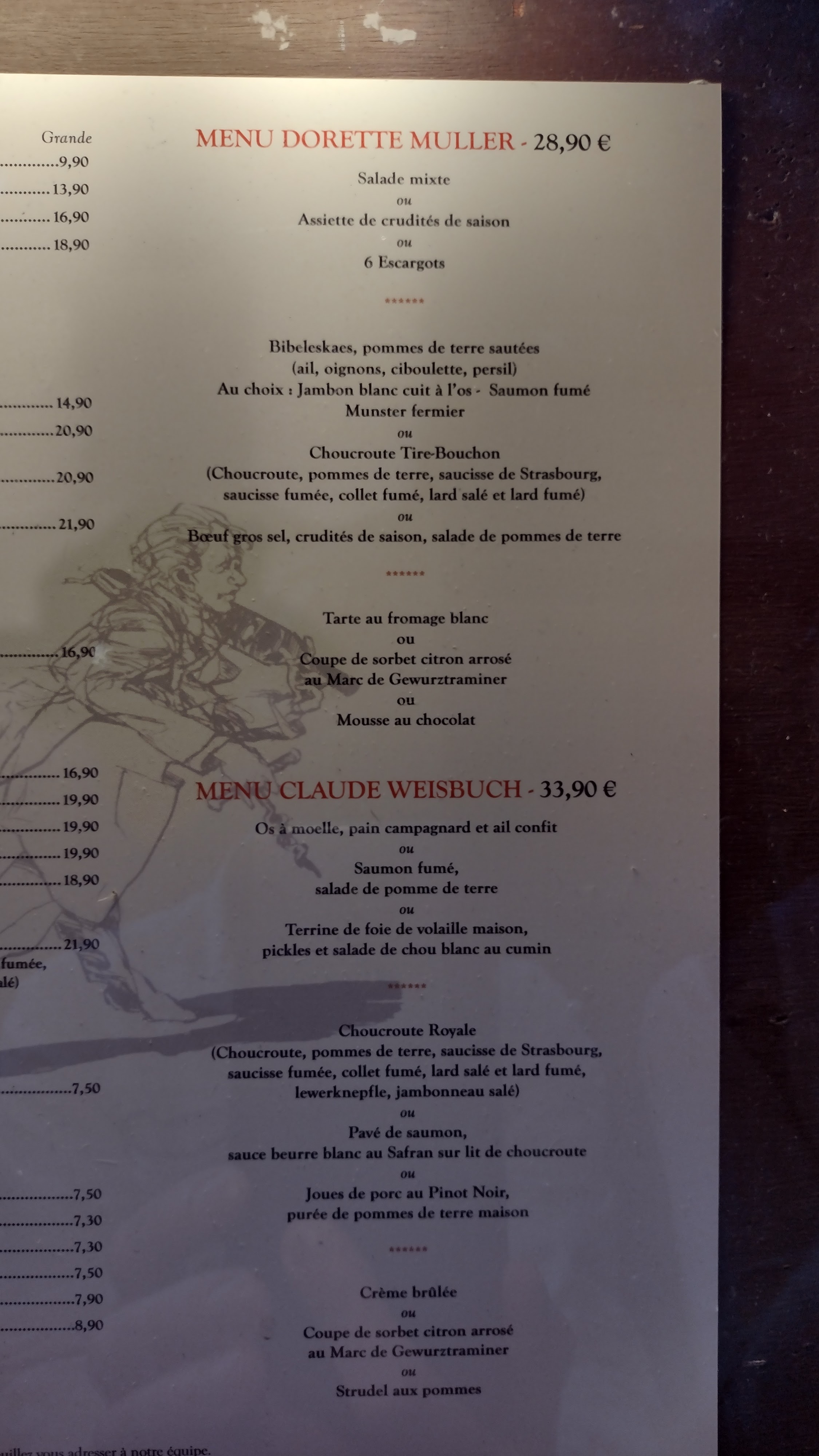 Restaurant savoureux à Strasbourg Le restaurant est situé près de la Cathédrale Notre Dame de Strasbourg, avec une jolie décoration de Noël. J'ai commandé le MENU CLAUDE WEISBUCH et choisi l'Assiette de Saumon fumé, la crème de Raifort, la Choucroute Royale et le Strudel aux Pommes. Bien sûr, un bon repas doit être accompagné d’un bon vin. Le garçon me recommande de commander du RIESLING, et c'est bon. Le service est bon. Ils peuvent parler anglais. Le prix est raisonnable. Je recommande de réserver avant de partir car le restaurant est réputé et fréquenté.
