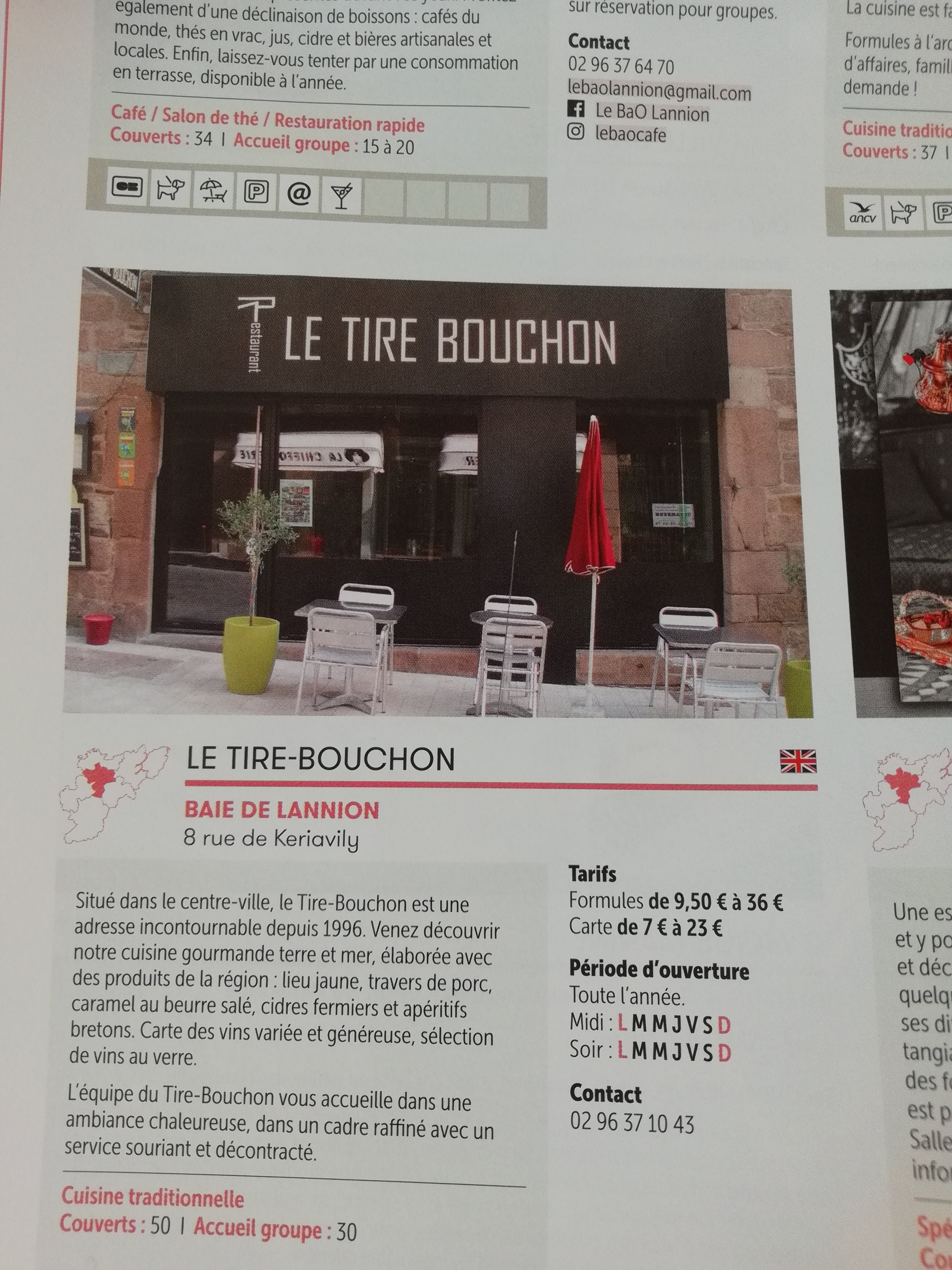 Voici toutes les informations sur le Restaurant Le Tire Bouchon qui ce trouve au 8 Rue de Keriavily, 22300 Lannion (22). Sur cette fiche vous trouverez les photos, l'adresse, les horaires d'ouverture, le numero de téléphone et les avis clients.Vous pouvez églement rédiger un avis si vous le souhaitez en bas de page.