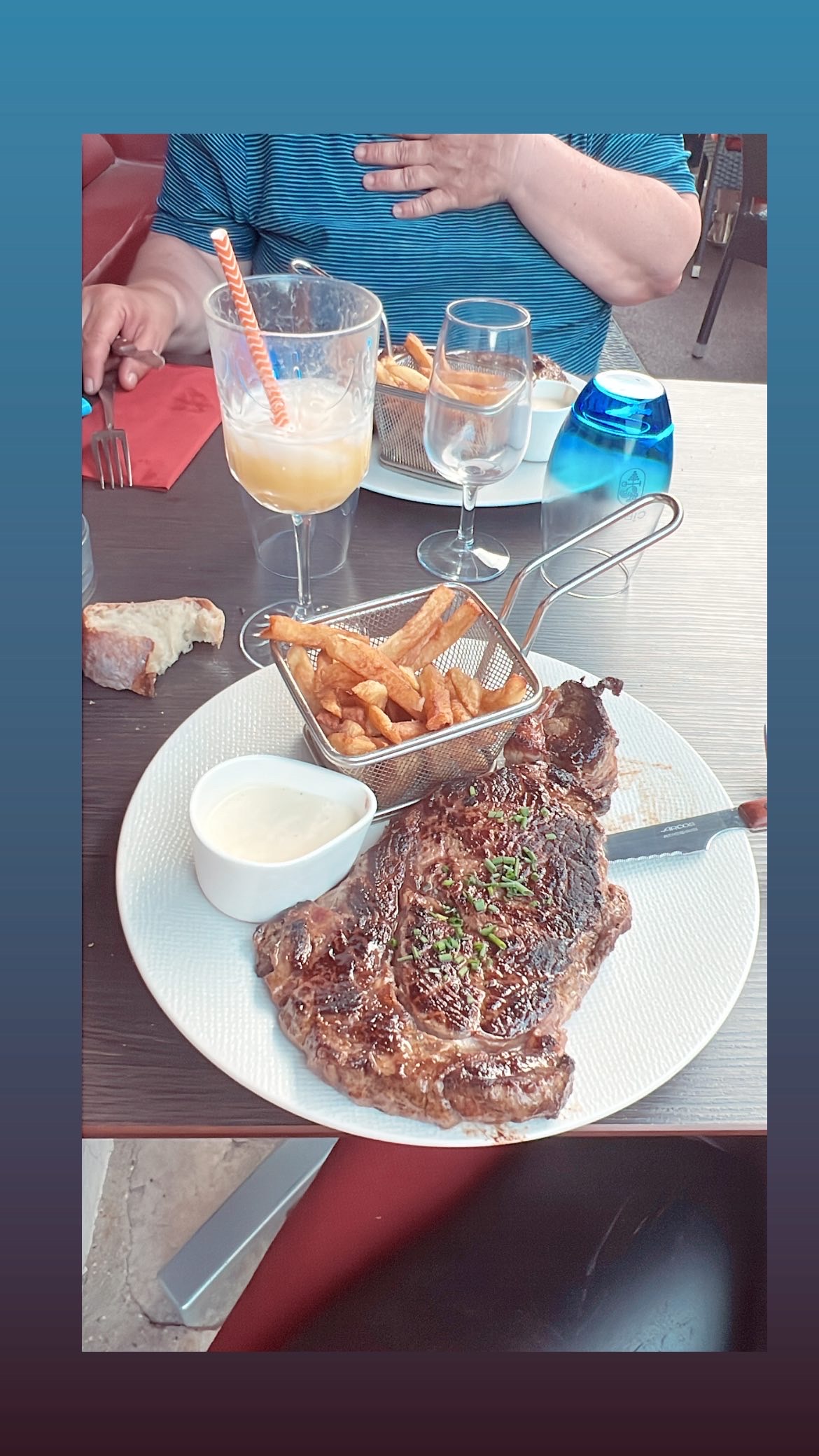 Nous avons mangé une pièce de bœuf pas extraordinaire avec pas mal de nervures. Le vin n’étais pas très bon et il y avait un verre très peu généreusement servi…tout comme le verre de digestif ! La note elle par contre était assez généreuse! 45 e par personne pour un plat et un dessert et un verre de vin et un verre de get. Pas du tout commerçant à l’image de la France en ce moment! C’est la crise..