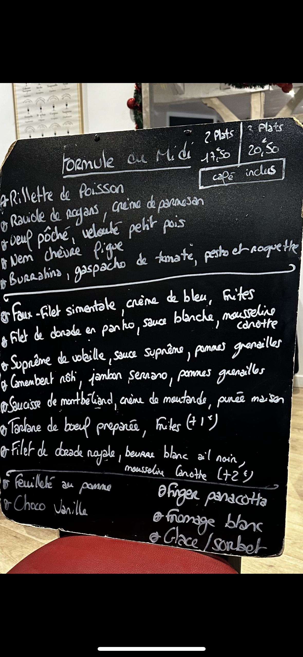 Très bon accueil ! Exellent !!! Les produits sont frais ! Allez y les yeux fermés ! 3 menus sont proposés dont un 15,90 (2 plats aux choix) puis 16,90 (3 plats + café) puis 32 euros tout est délicieux ! Bravo au chef et à tout l'équipe (15/11/2021)
