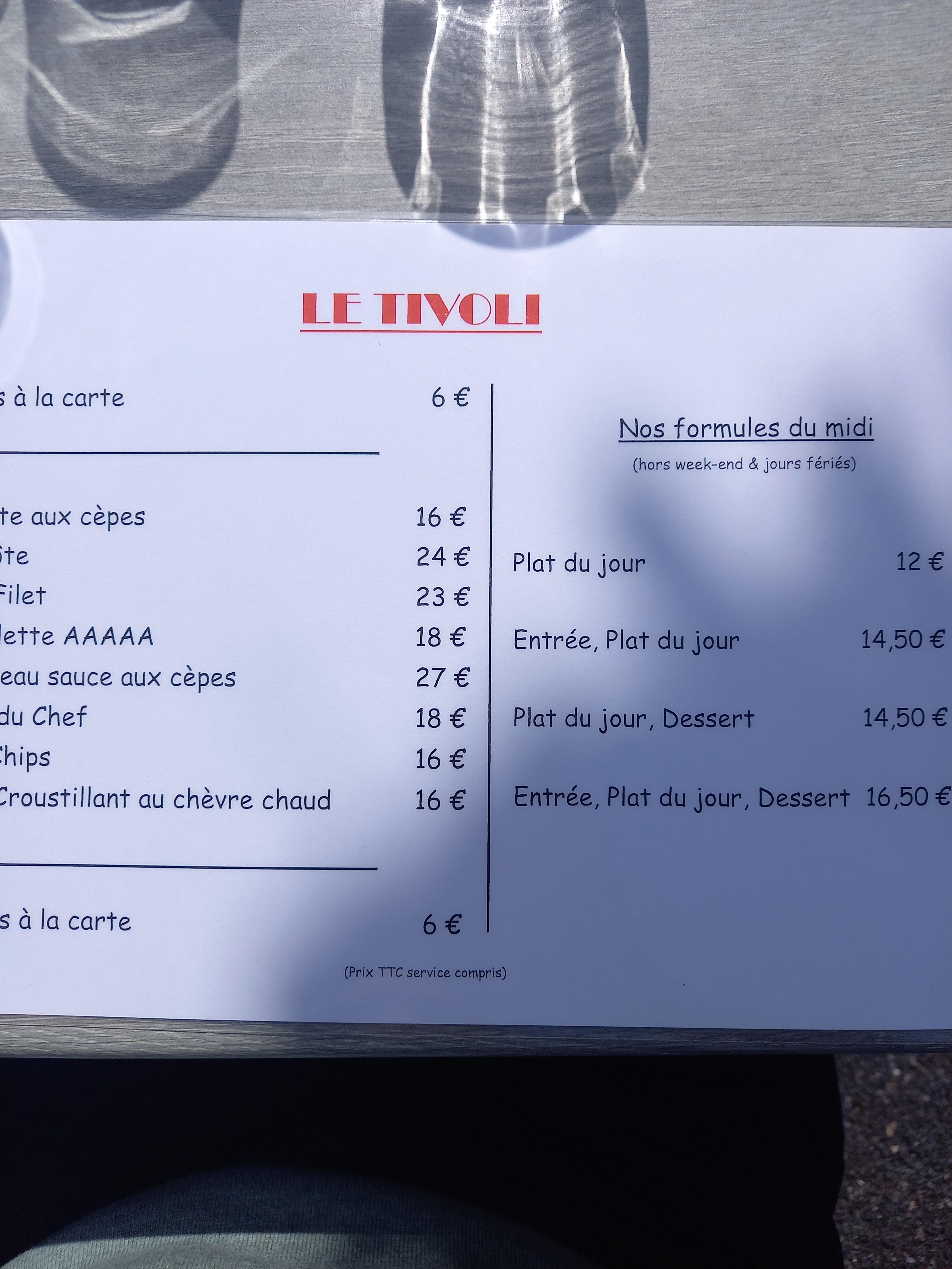 Potentiellement repreneurs, nous sommes allés déjeuner au Tivoli. Si la qualité du repas n’appelait pas de réelle critique, l’accueil absolument catastrophique réservé par celui qui apparaît être le patron à une table proche de la nôtre nous a confortés dans le souhait de ne pas donner suite…