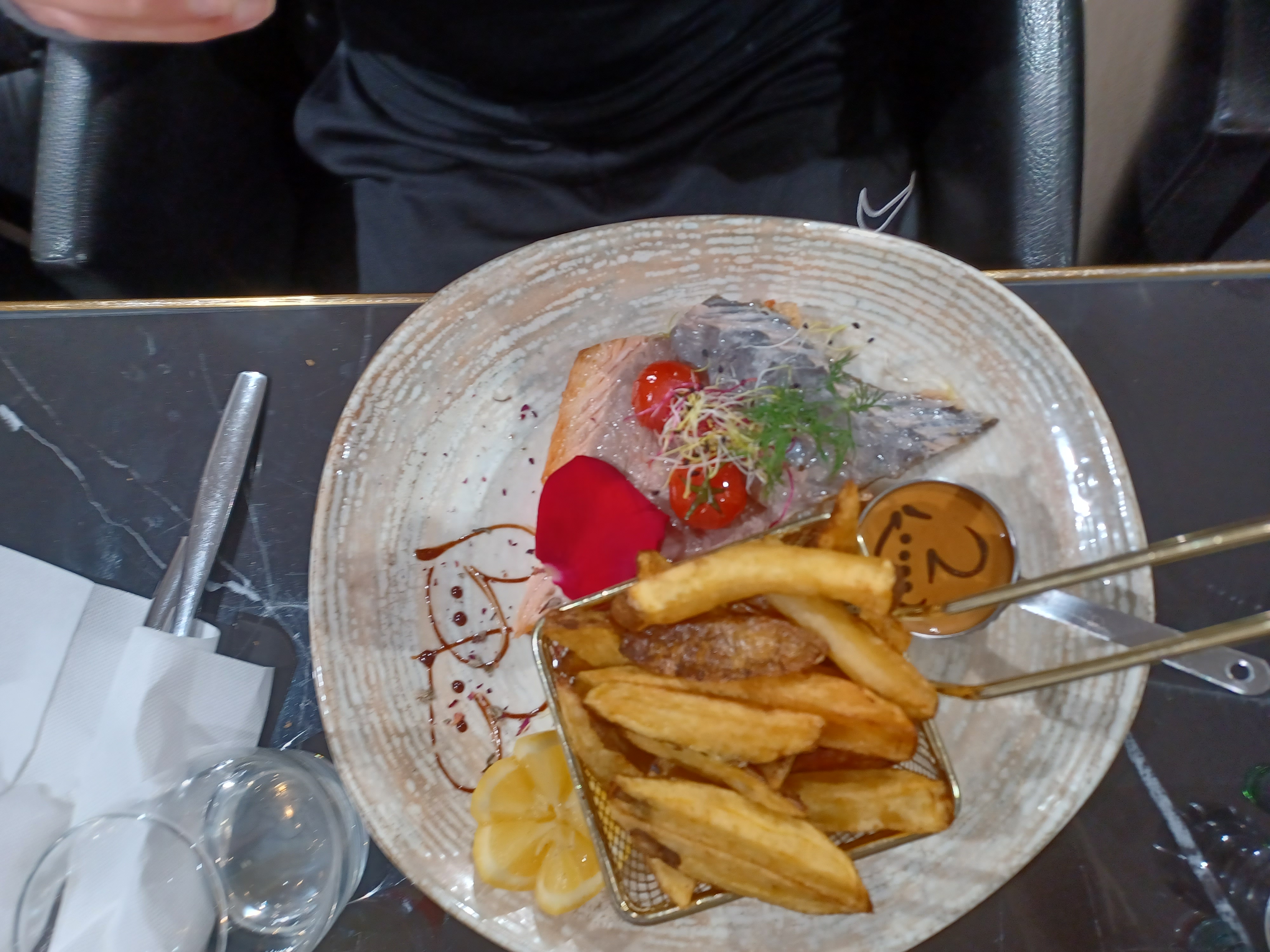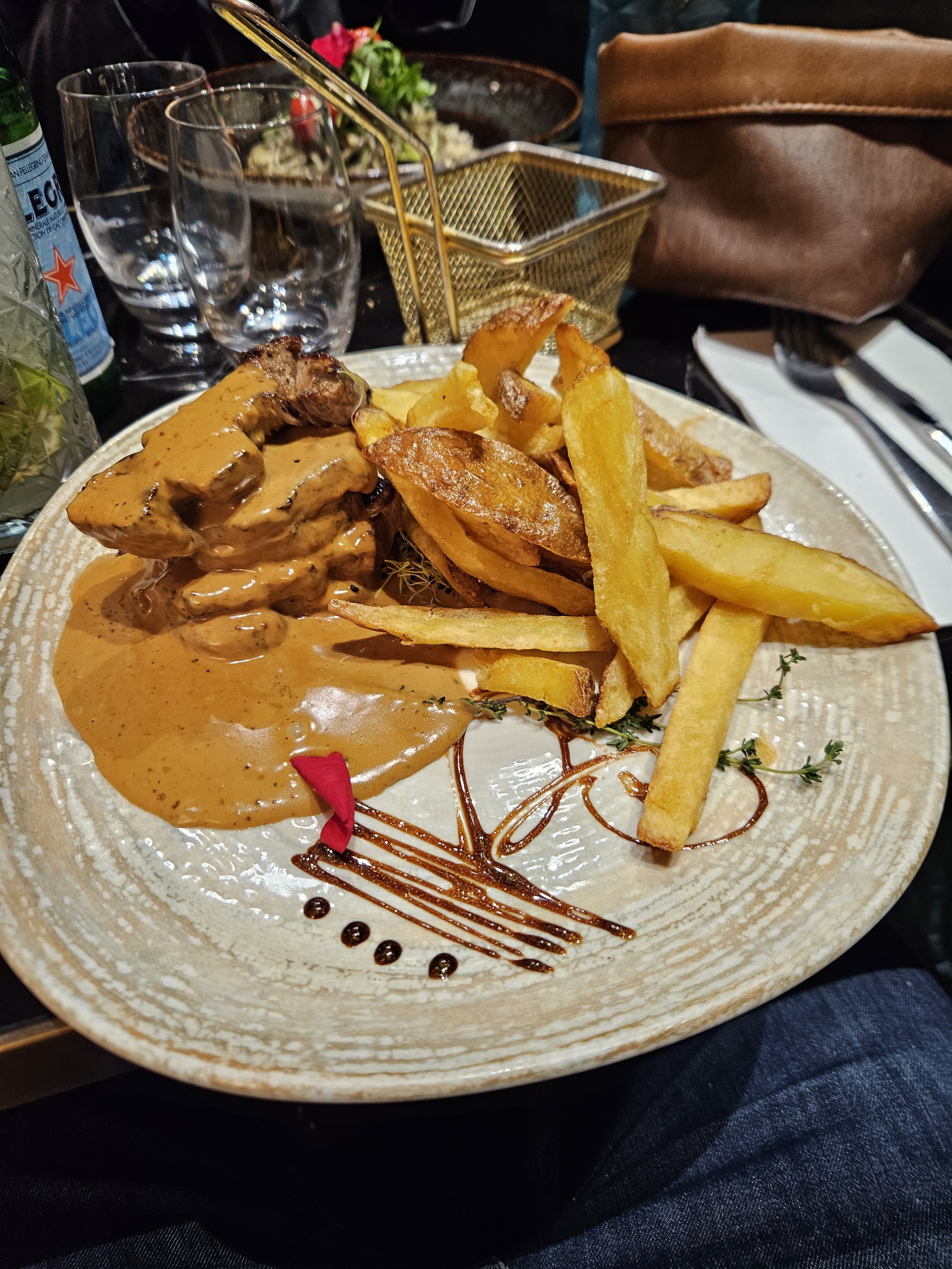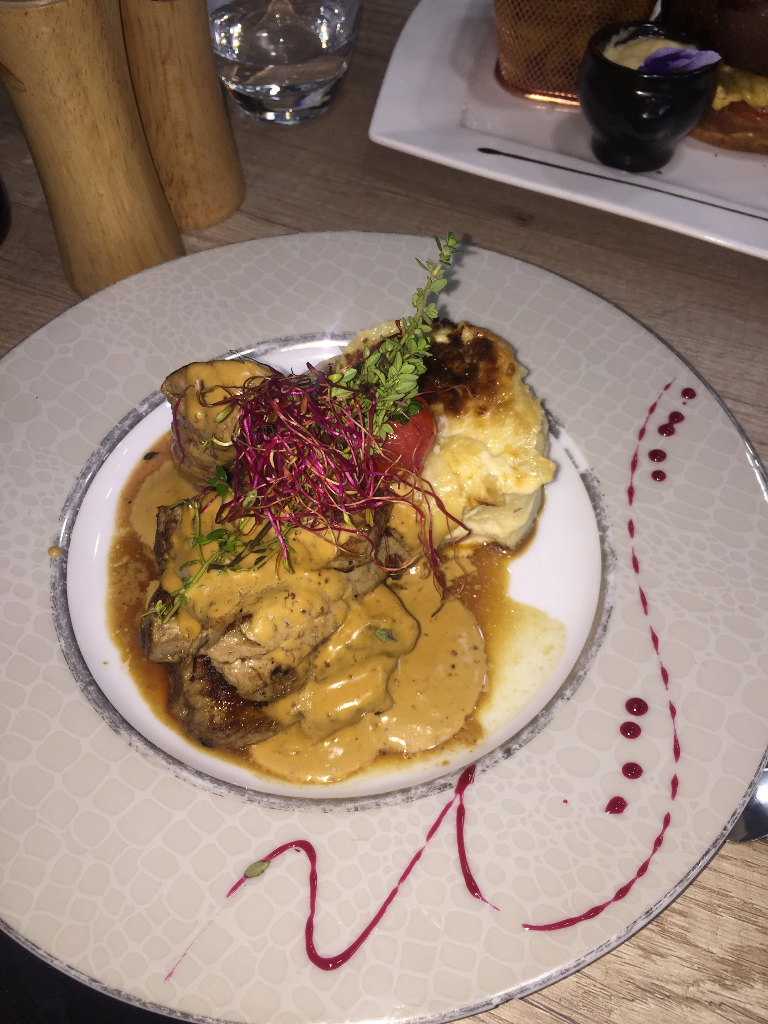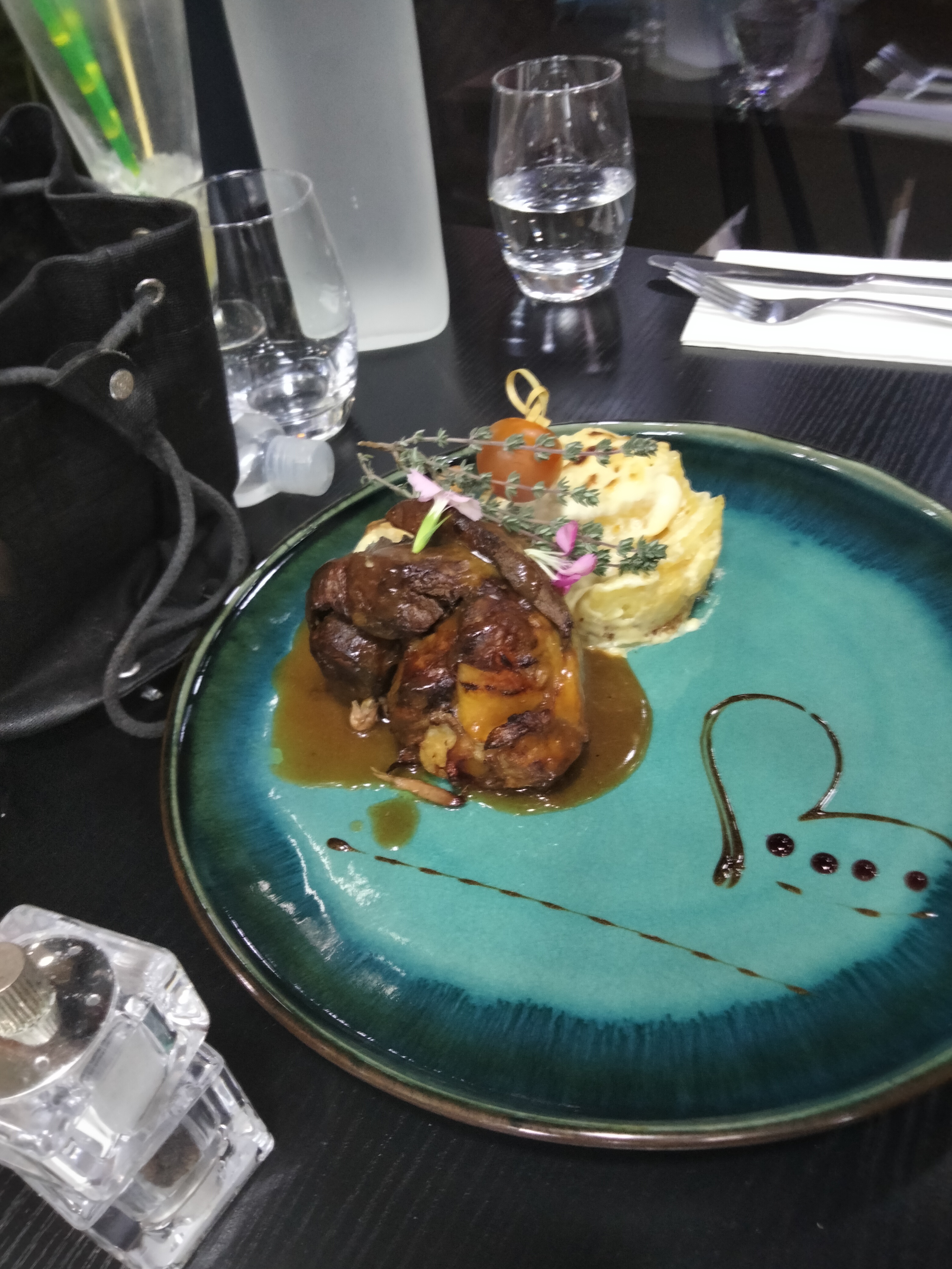 C'était super bon pour ma part ! Entrecôte frite ( valeur sur) mais pour mes soeur ce fût pas terrible saumon sec riz collant avec des épices chelou ! La sauce du veau trop épaisse ( boite entière de maïzena ) 🤣😂 les dessert gras mais très bon !! Arrivé à 21h15 servi les entrées a 22h15 wahou ah pour coupé 3 tranche de foie gras lol