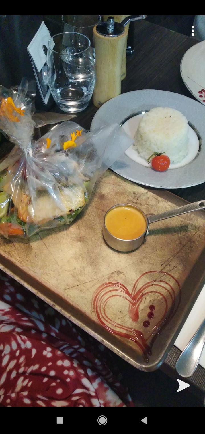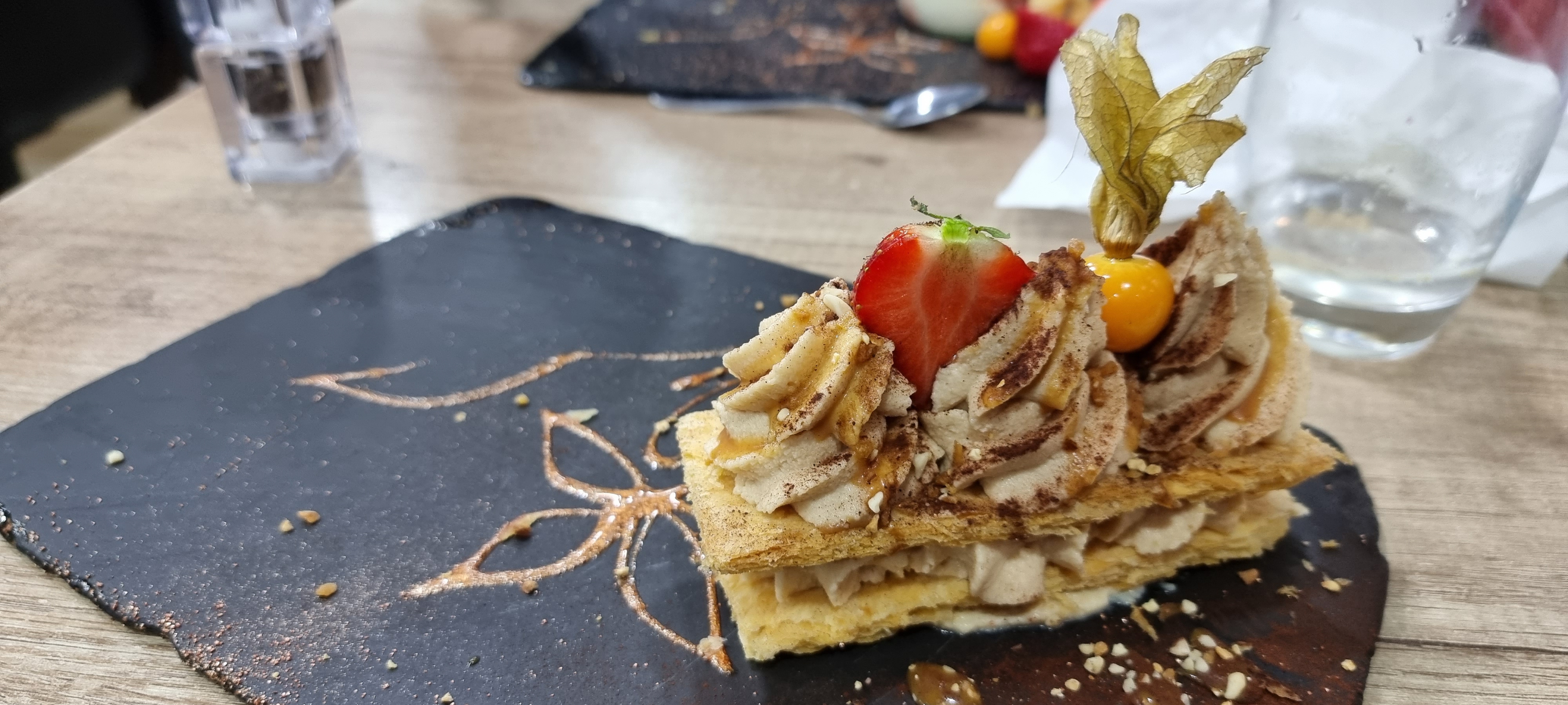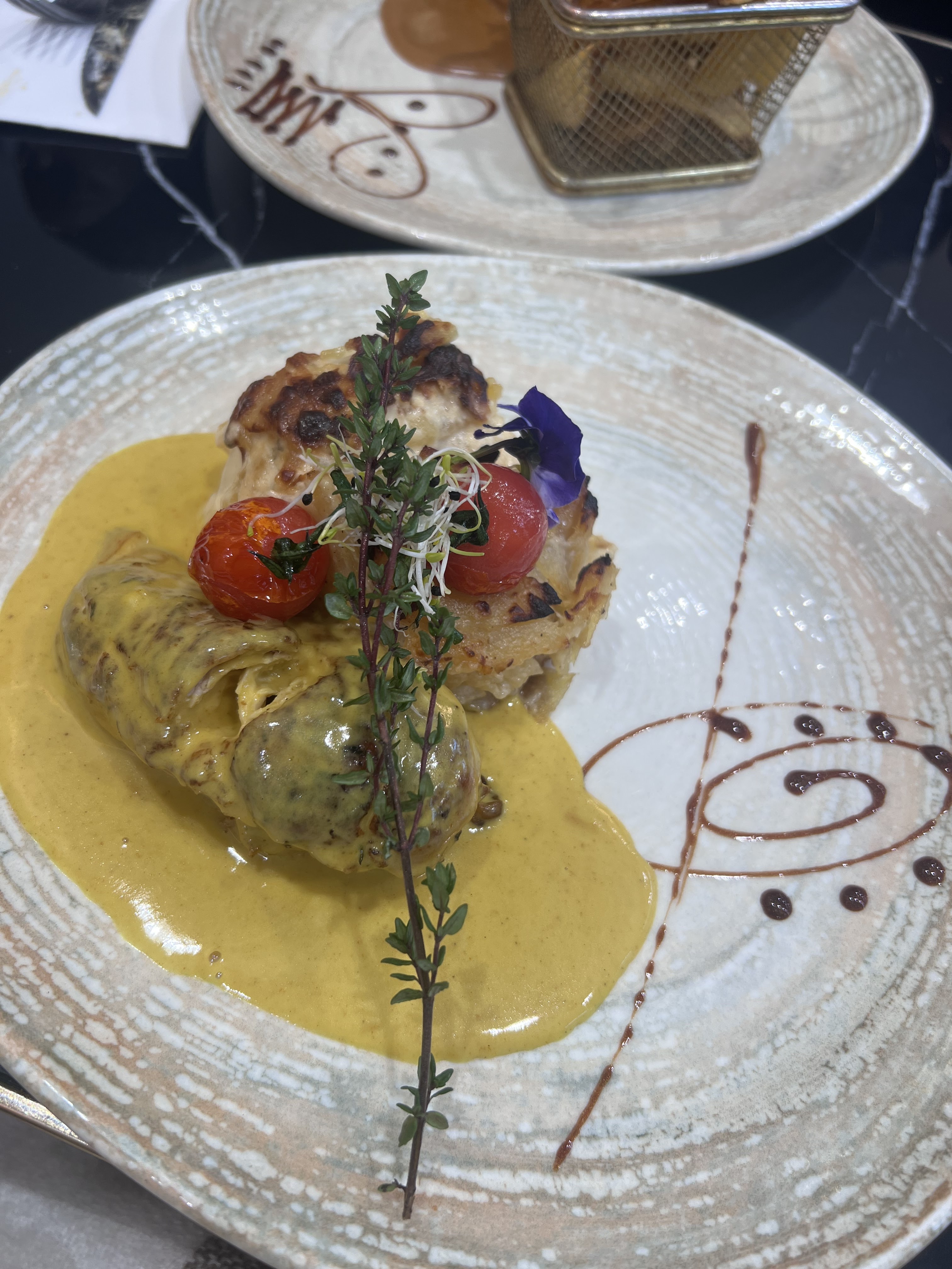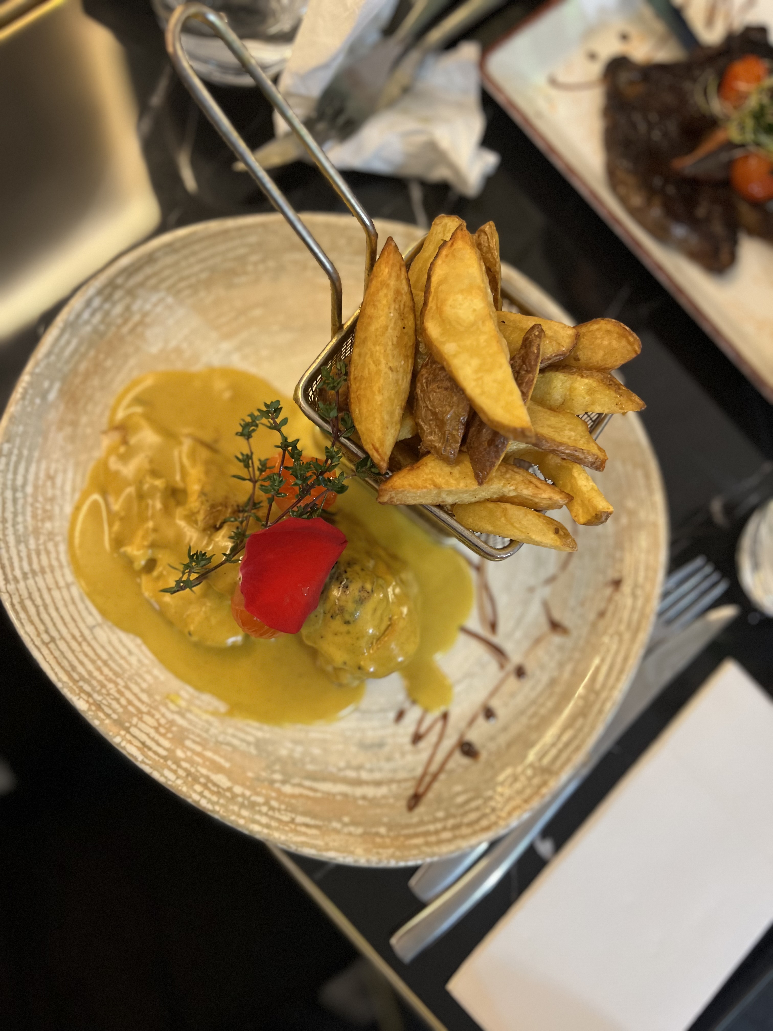 C'était super bon pour ma part ! Entrecôte frite ( valeur sur) mais pour mes soeur ce fût pas terrible saumon sec riz collant avec des épices chelou ! La sauce du veau trop épaisse ( boite entière de maïzena ) 🤣😂 les dessert gras mais très bon !! Arrivé à 21h15 servi les entrées a 22h15 wahou ah pour coupé 3 tranche de foie gras lol