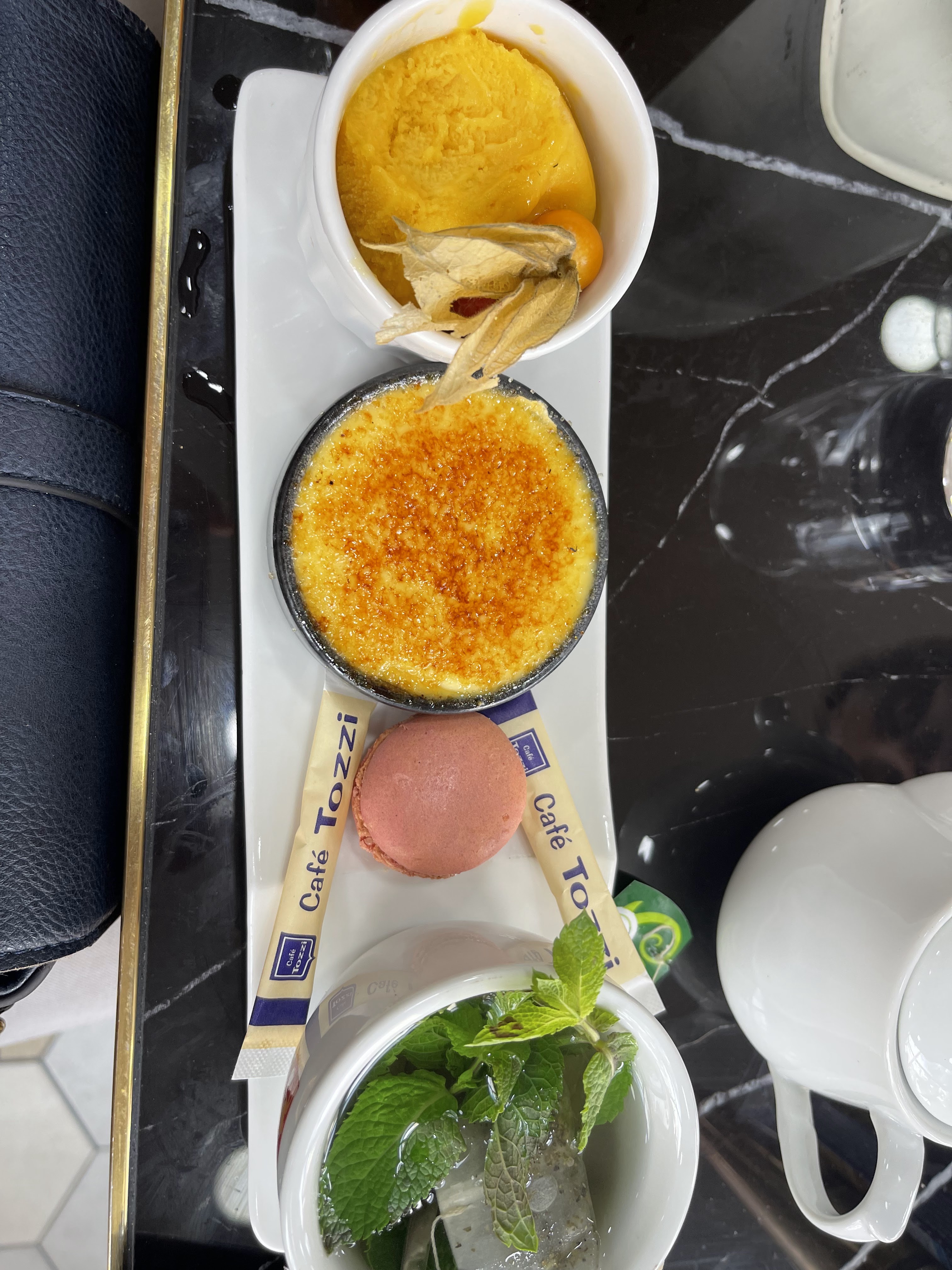 Repas esthétiquement beau mais manque de saveur surtout pour les desserts très sucrés et chimiques, cependant personnel agréable,pas d'ambiance malgré un serveur qui rappe pour les anniversaires même s'il n'est pas doué