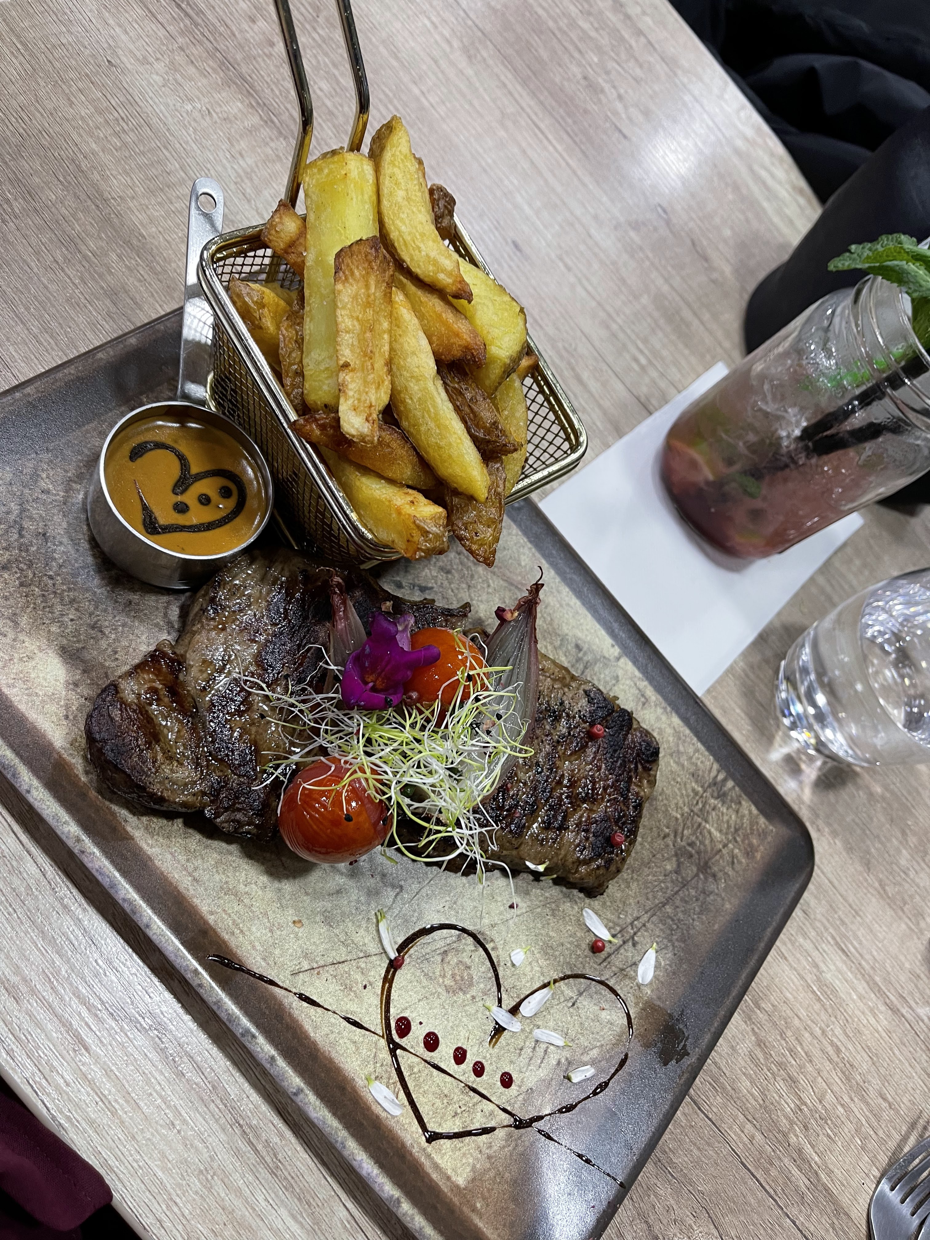 Restaurant avec une beau cadre de décor et un personnel souriant. Nous avons été servi très vite. Le mojito était délicieux et très joliment présenter. L'entrée était un vrai délice : surprise rose. Quant à l'entrecôte, légèrement déçue a cause de la viande un peu seche et d'un gratin salé. Néanmoins, ça reste un restaurant que je recommande !