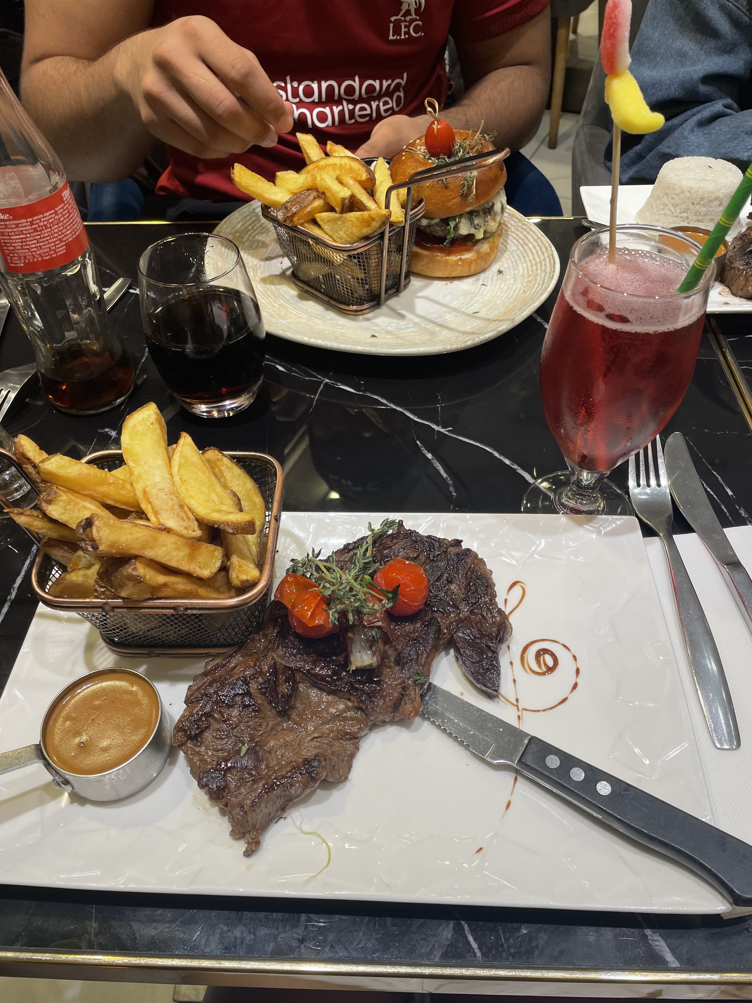 Les plats sont arriver avant les cocktails. Nous avons réclamé 3 fois les boissons au près de serveurs différents. Pas un geste excuse au près de nous. Il nous ramener les boissons après avoir fini de manger! Serveur ingrat, trop dépasser par l’afflux, incompétent! La cuisine il manque d’assaisonnement dans les plats 😔 Vraiment très dessus de ce restaurant. Autant il y a du monde mais la qualité de service est horrible