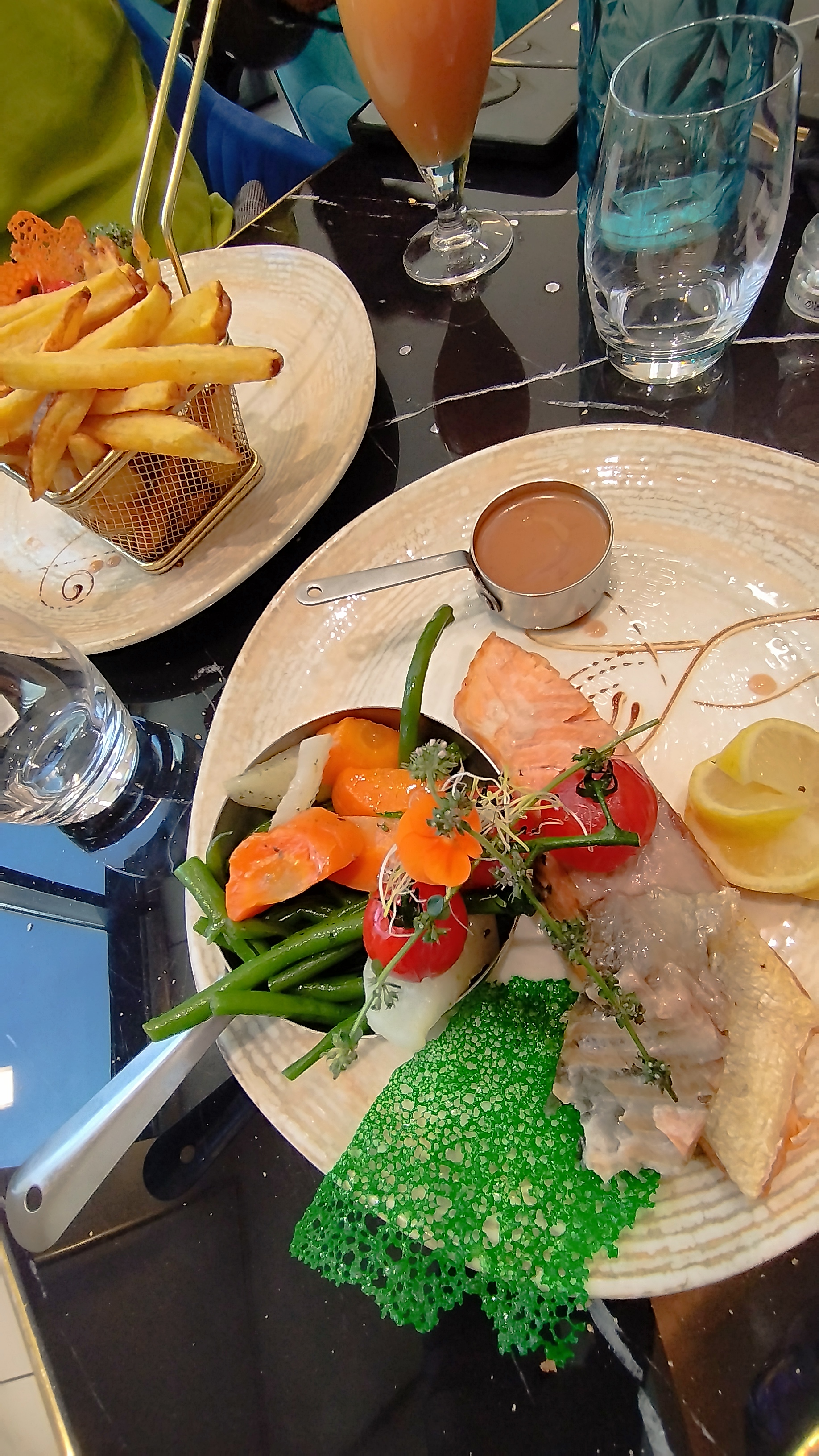 Très beau restau, service au top accueillant,serviable, à l'écoute,patient. Très bonne cuisine, quantité à revoir parfois comme pour les granitures un peu petit, dommage car c'est très bon. Les cocktails et désert sont très bon également,je recommande à 100%.