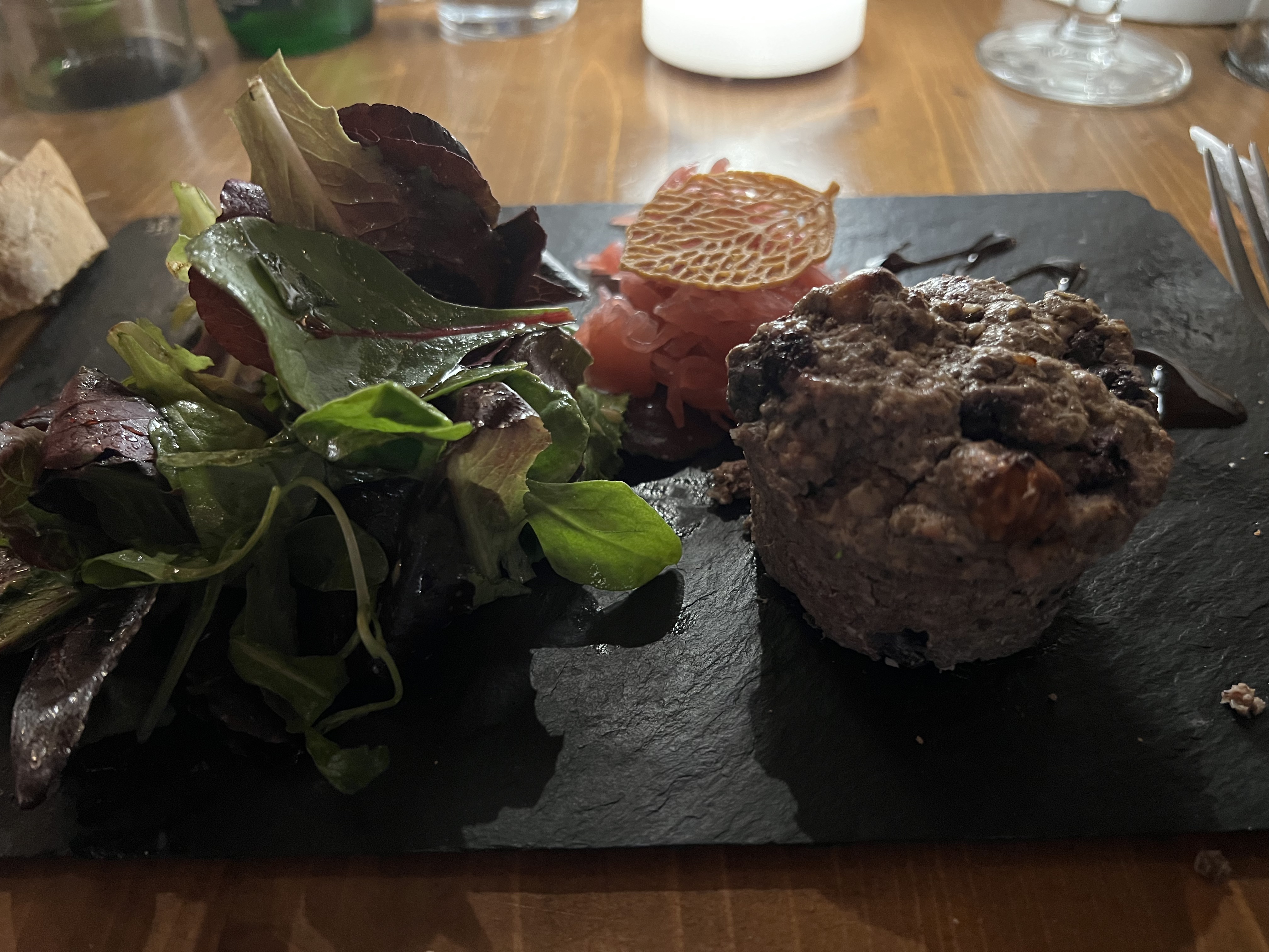 J'avais des os ou des cartilages dans mon pâté, j'affirmais que c'était un pépin, mais ce n'était évidemment pas le cas. Poitrine de porc 99% de matière grasse. Le poisson était très bon, les accompagnements étaient corrects. L'ambiance était agréable.